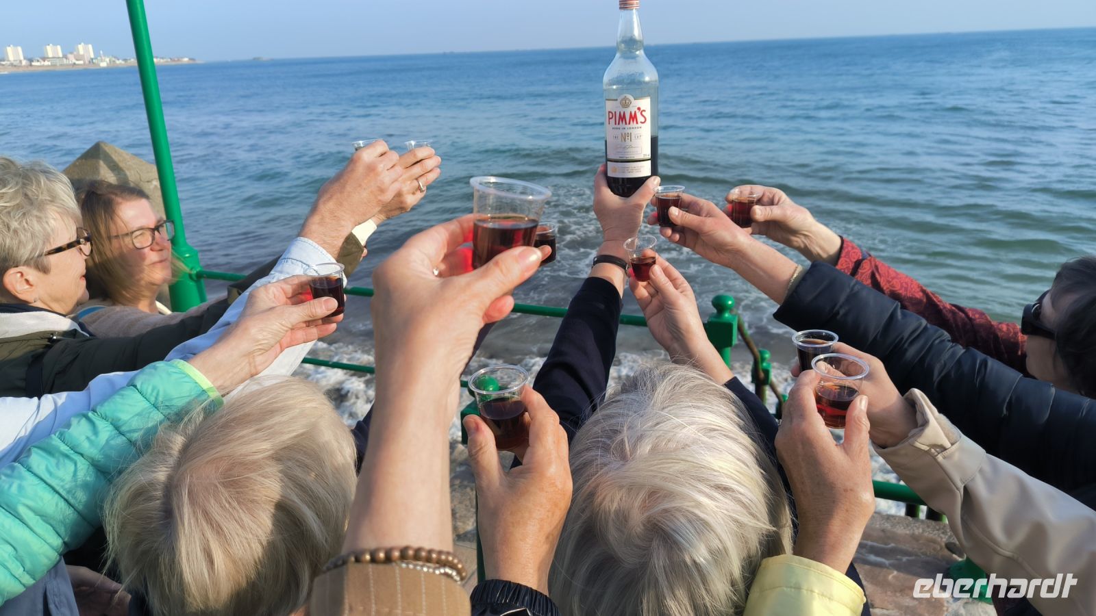 Inzwischen sind alle da und wir treffen uns an der Strandpromenade zur Vorstellungsrunde. Bei einem englischen Likör werden die ersten Kontakte geknüpft, wir bestaunen das stürmische Meer bei Flut und statten dem örtlichen Meeresschwimmbad einen (trockenen) Besuch ab.
