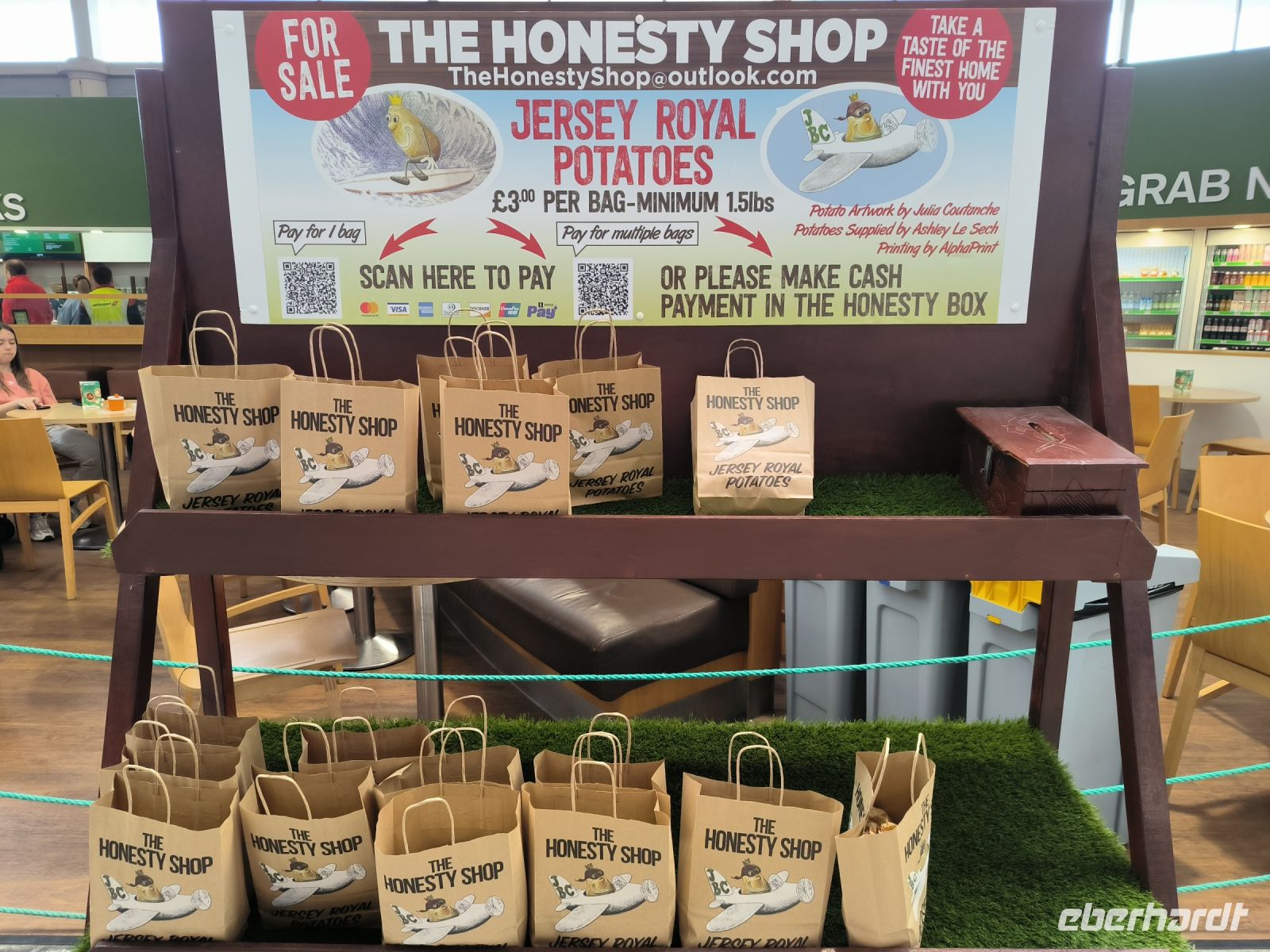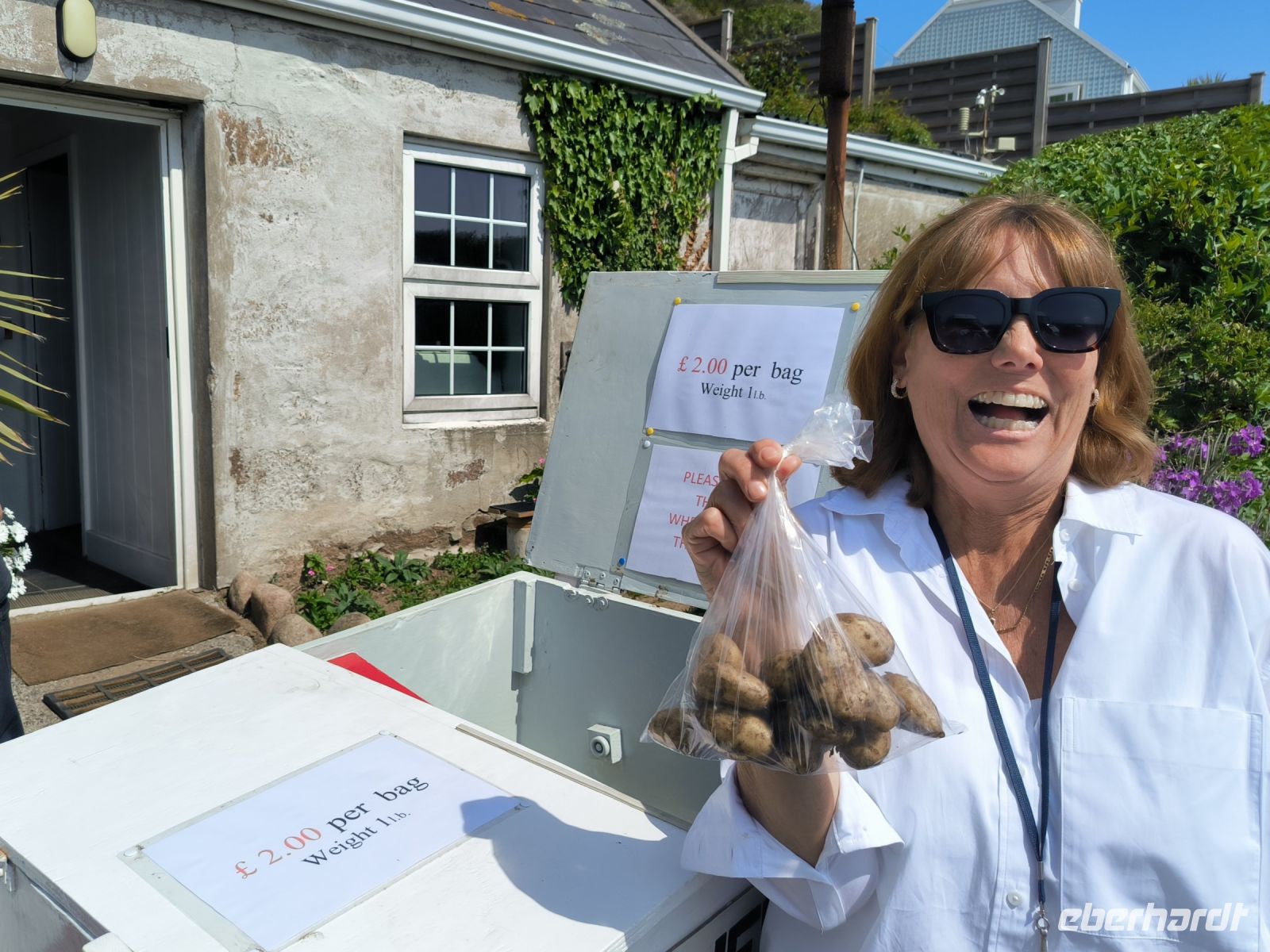 Etwas früher als gewohnt treffen wir uns zum Frühstück, während unsere Koffer schon die engen Treppen hinunter getragen werden. Jane und Eddy holen uns ab, wir sind pünktlich am übersichtlichen Flughafen, den wir ja schon gut kennen. Hier können wir neben diversen anderen Souvenirs sogar die royalen Kartoffeln kaufen.