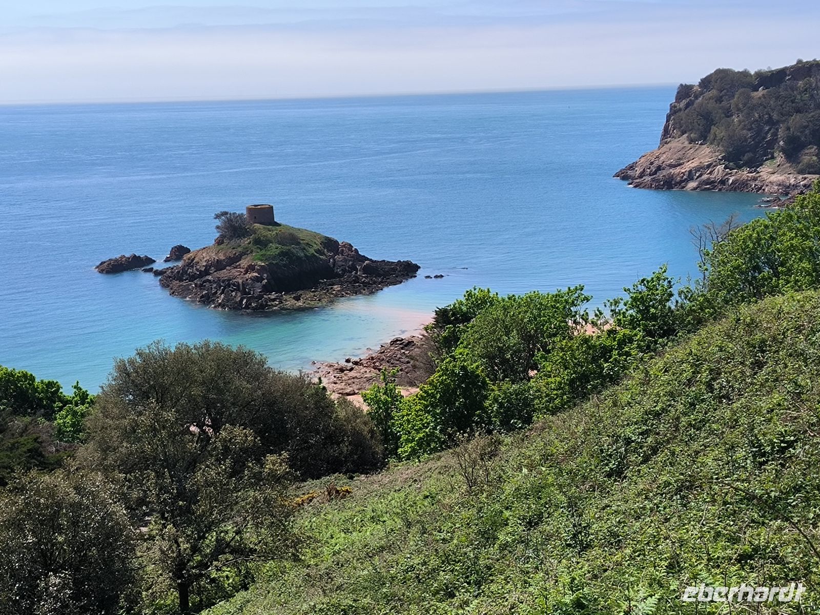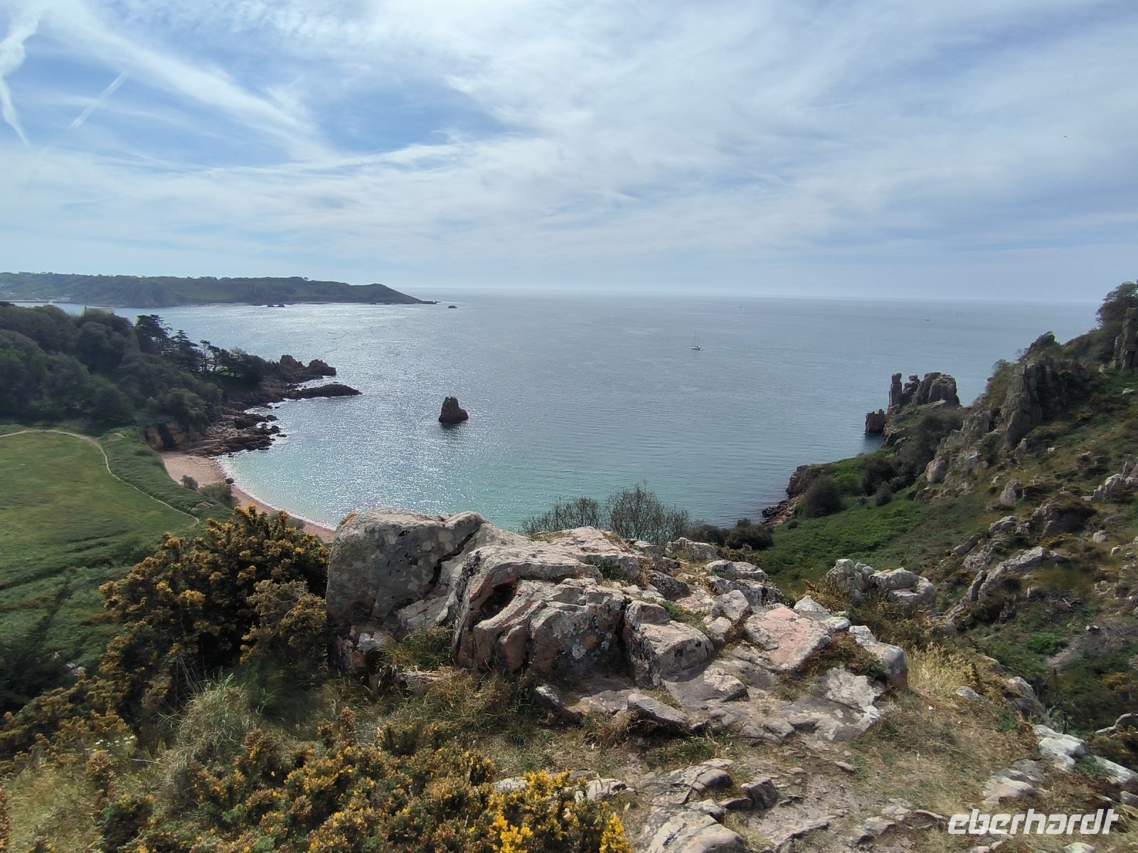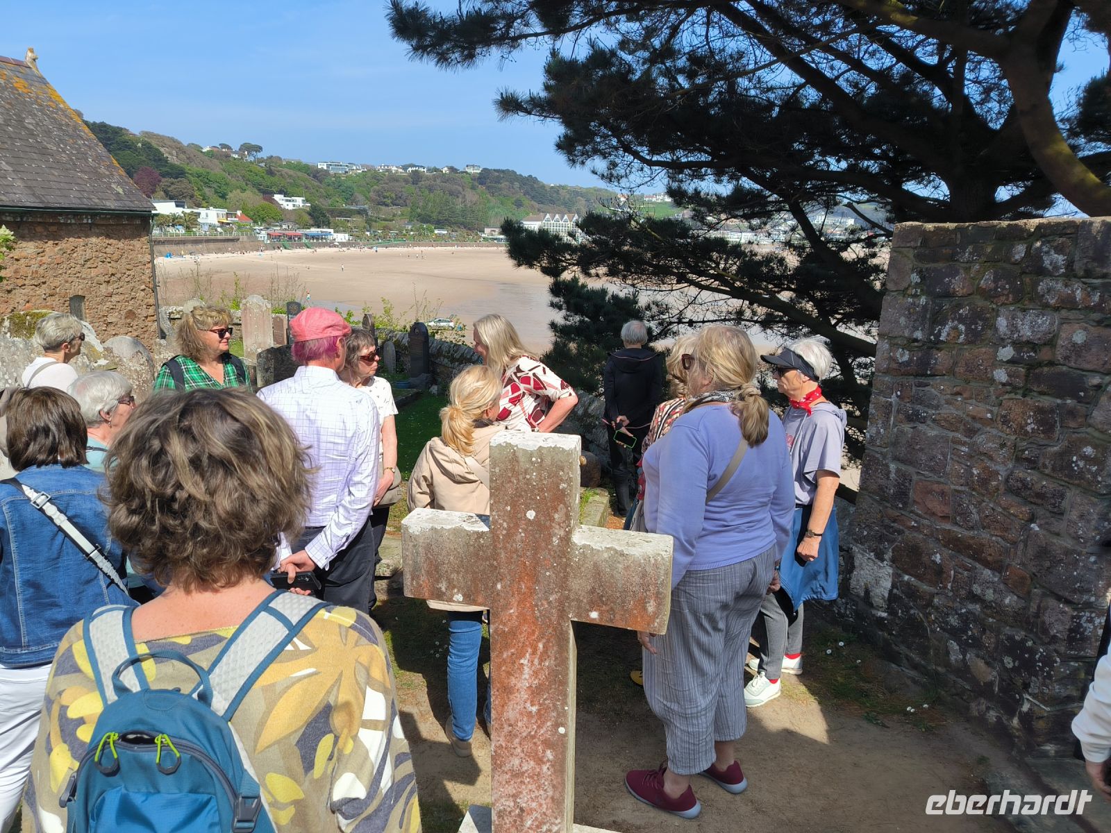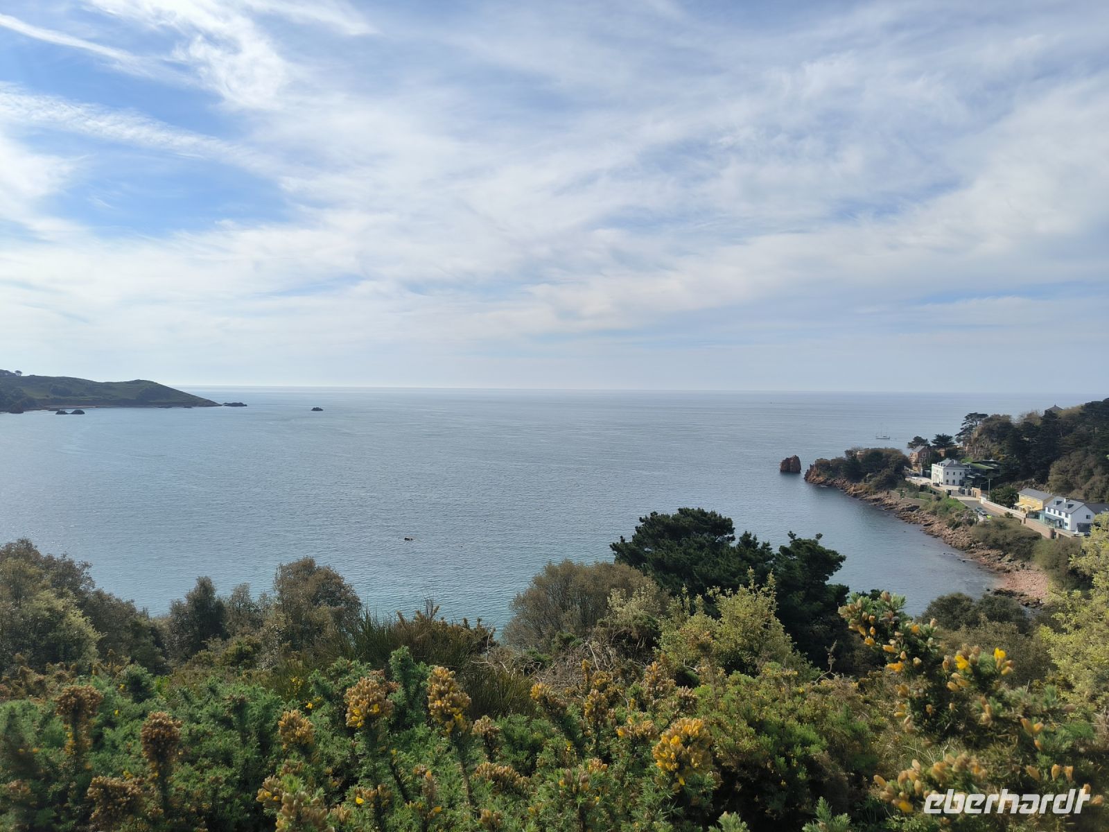 Eddy und Rémi holen uns gut gelaunt zu unserer zweiten Wanderung ab. Das Wetter ist wieder bestens, der leichte Wolkenschleier trübt die Laune keineswegs, im Gegenteil. An der Kirche von St. Brelade, die wir ja schon kennen, startet unser Weg hinauf zur Steilküste.
