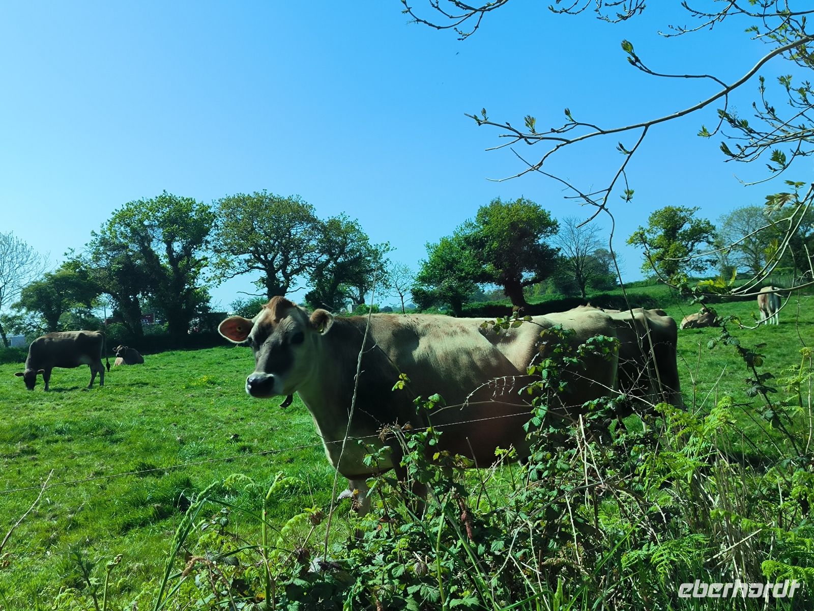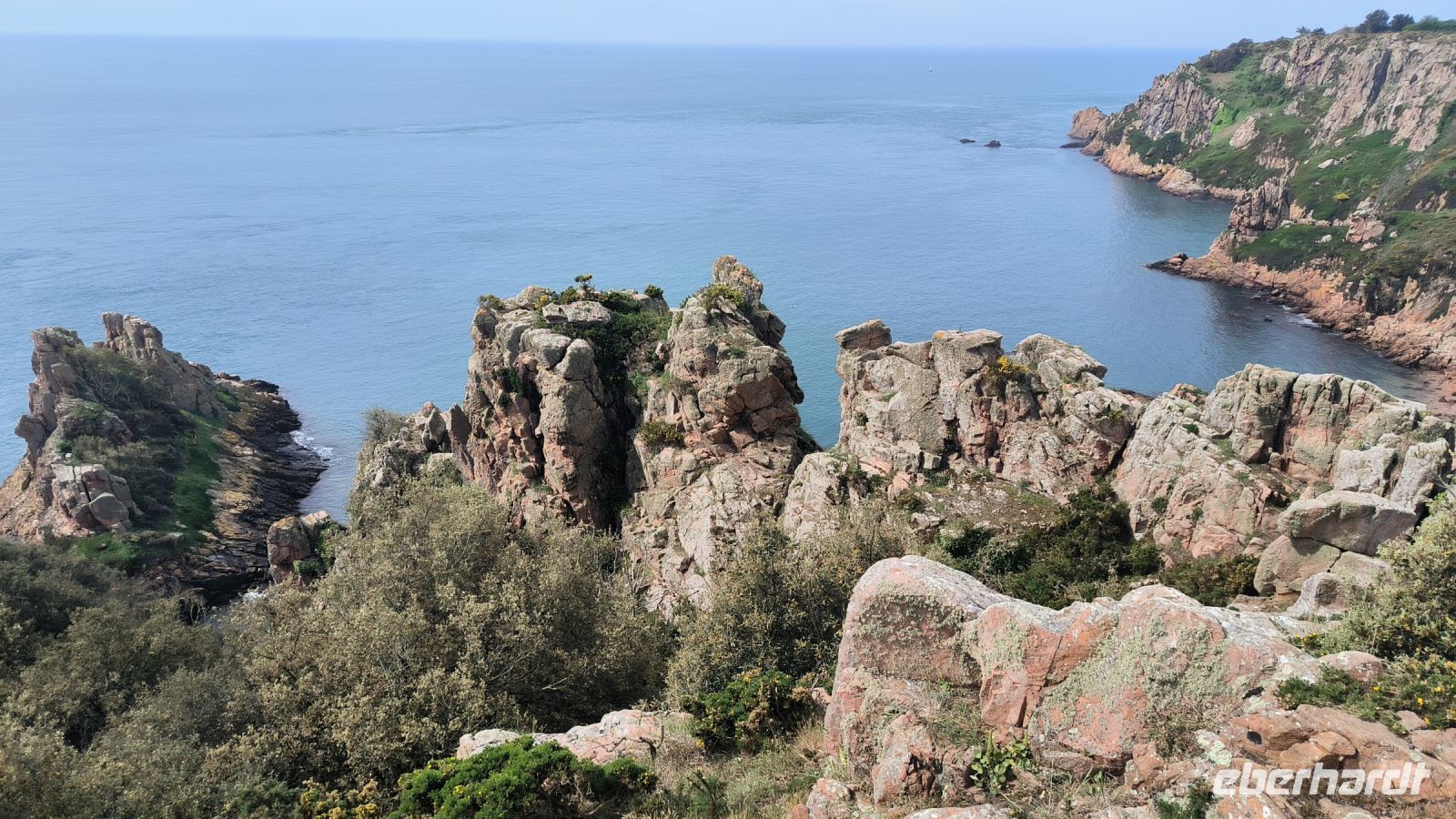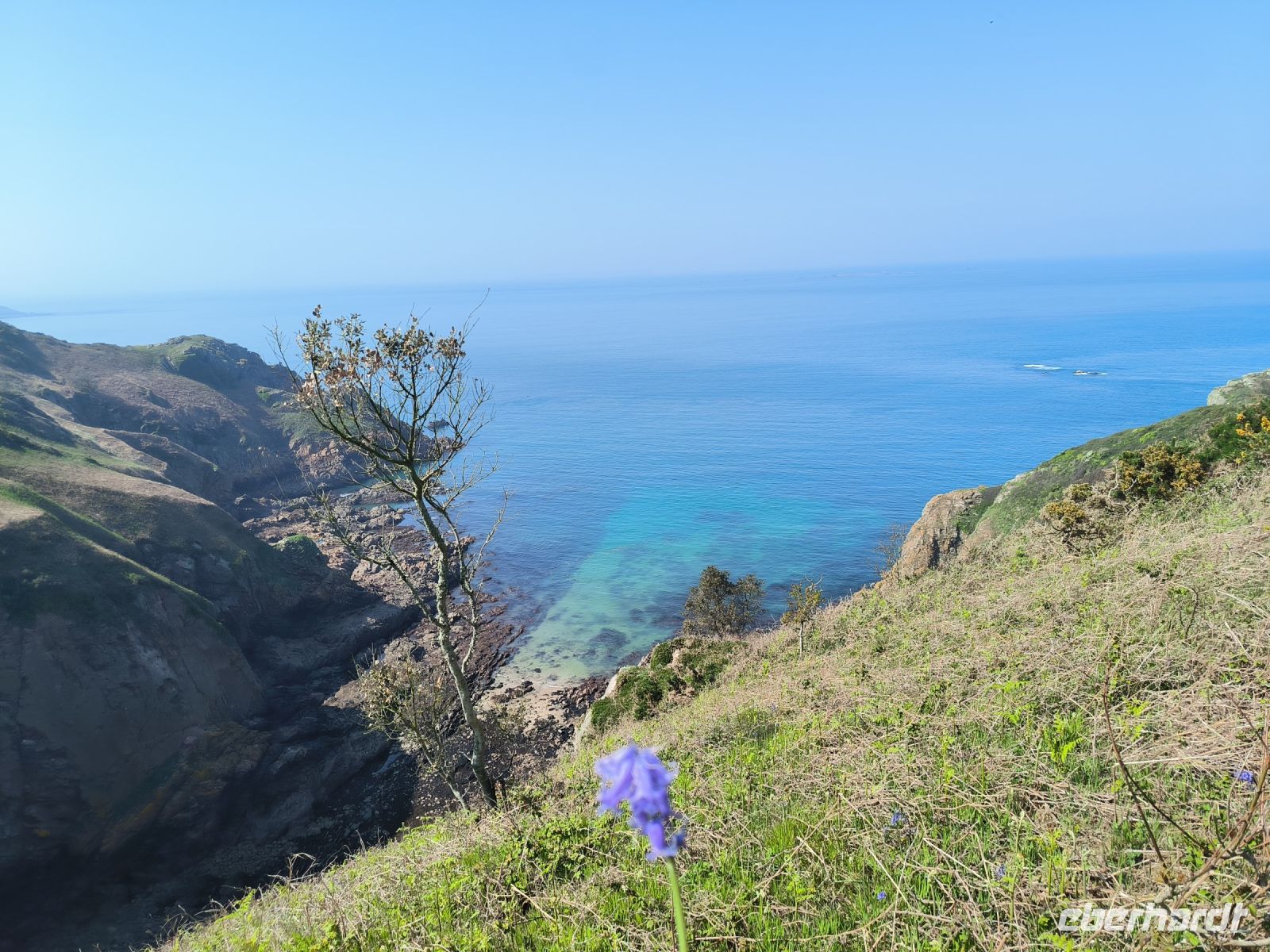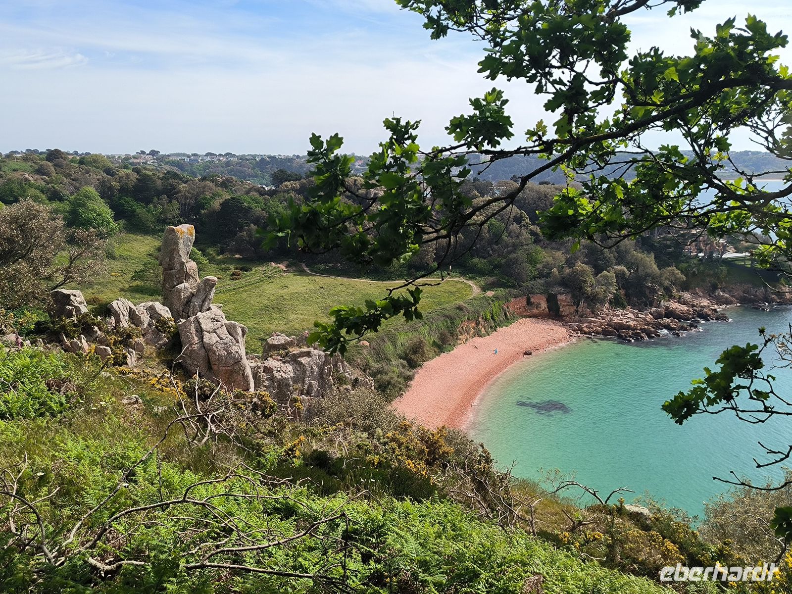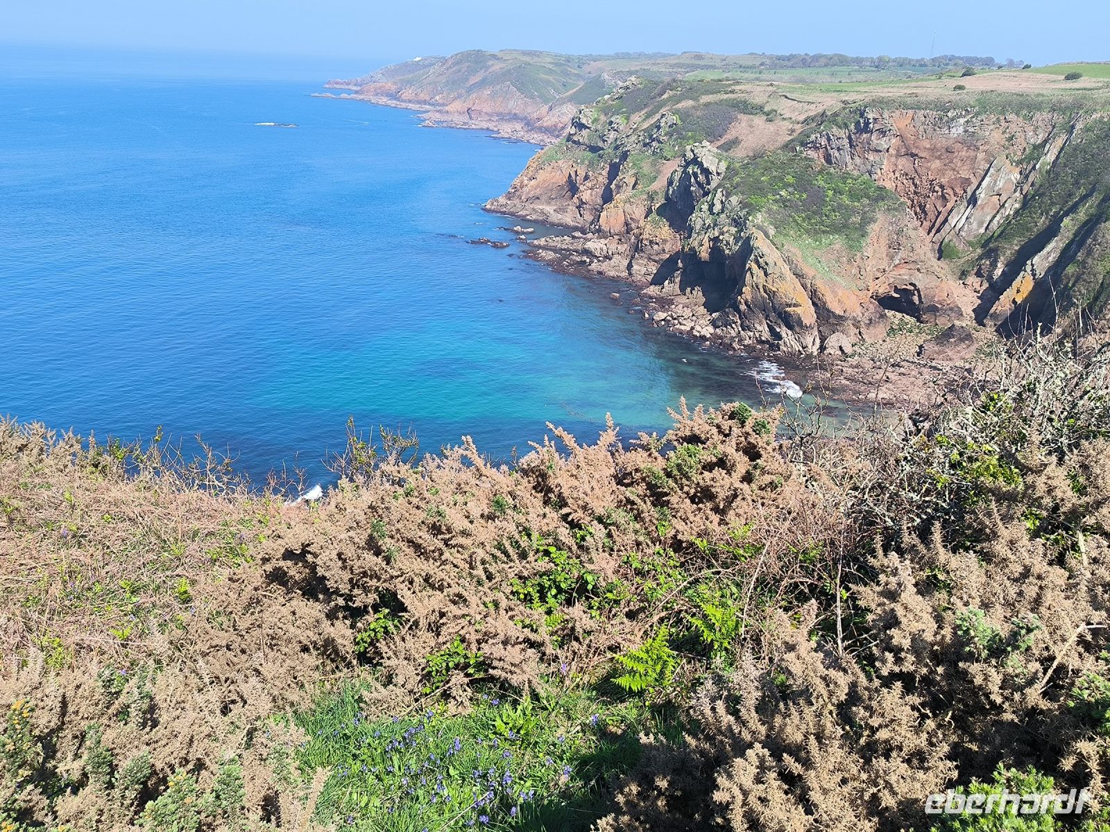 Eddy und Rémi holen uns gut gelaunt zu unserer zweiten Wanderung ab. Das Wetter ist wieder bestens, der leichte Wolkenschleier trübt die Laune keineswegs, im Gegenteil. An der Kirche von St. Brelade, die wir ja schon kennen, startet unser Weg hinauf zur Steilküste.