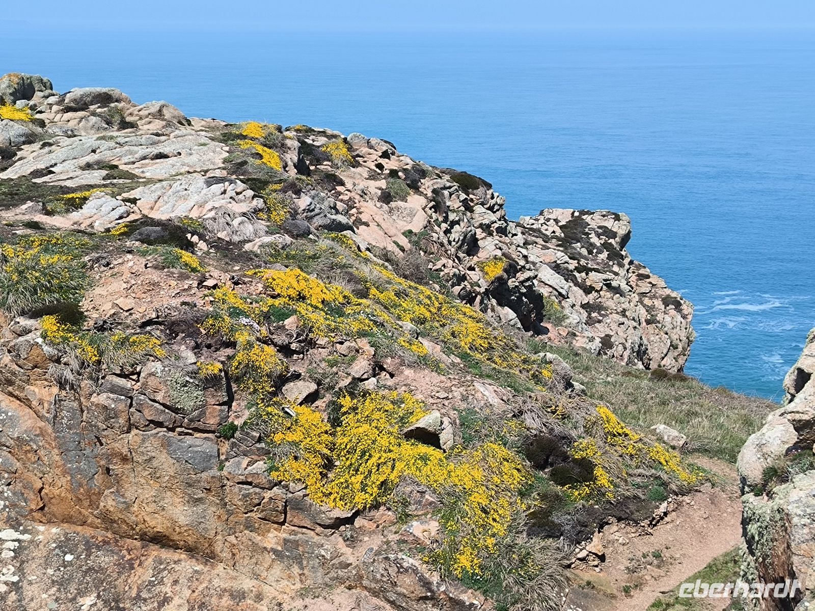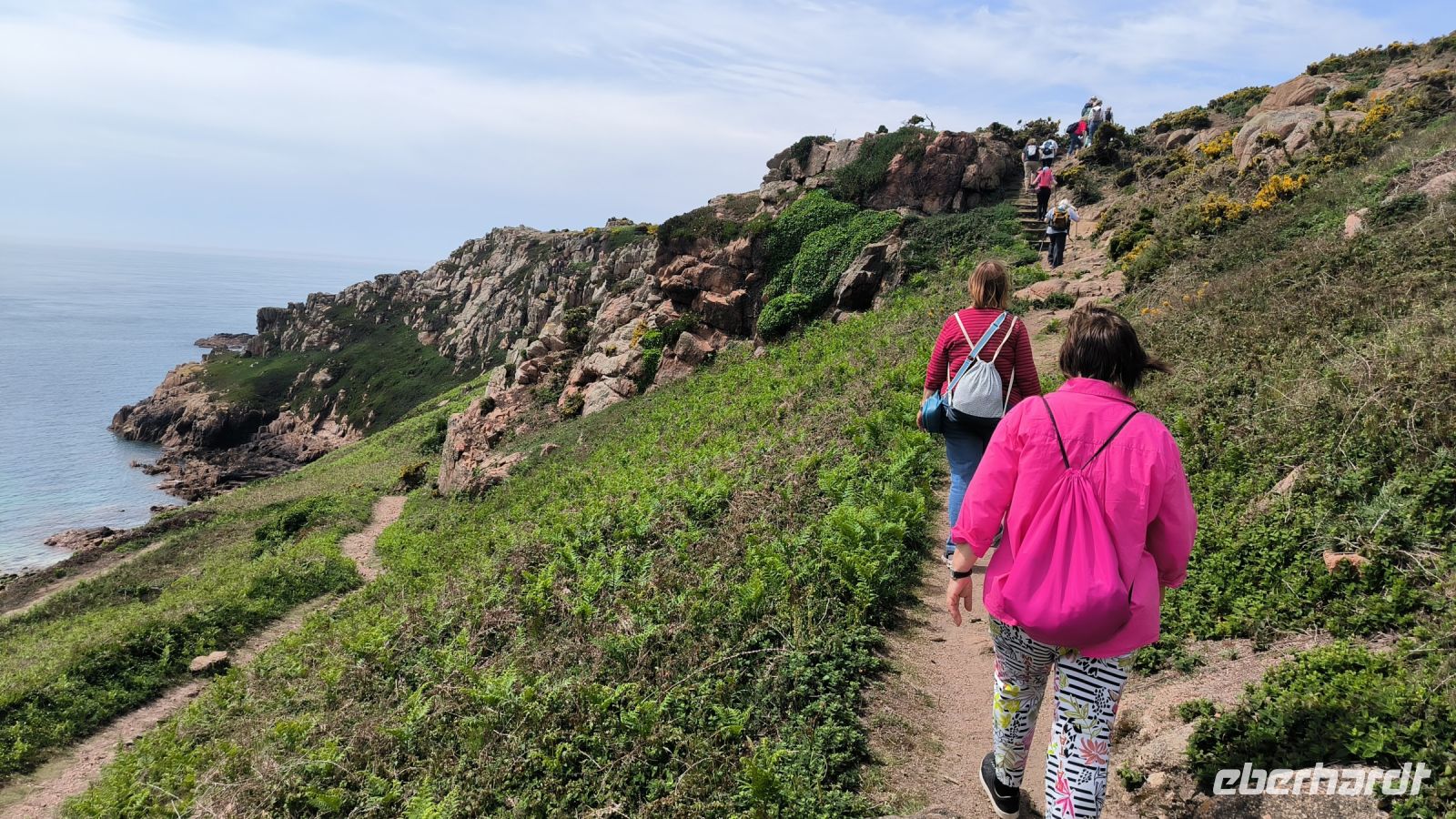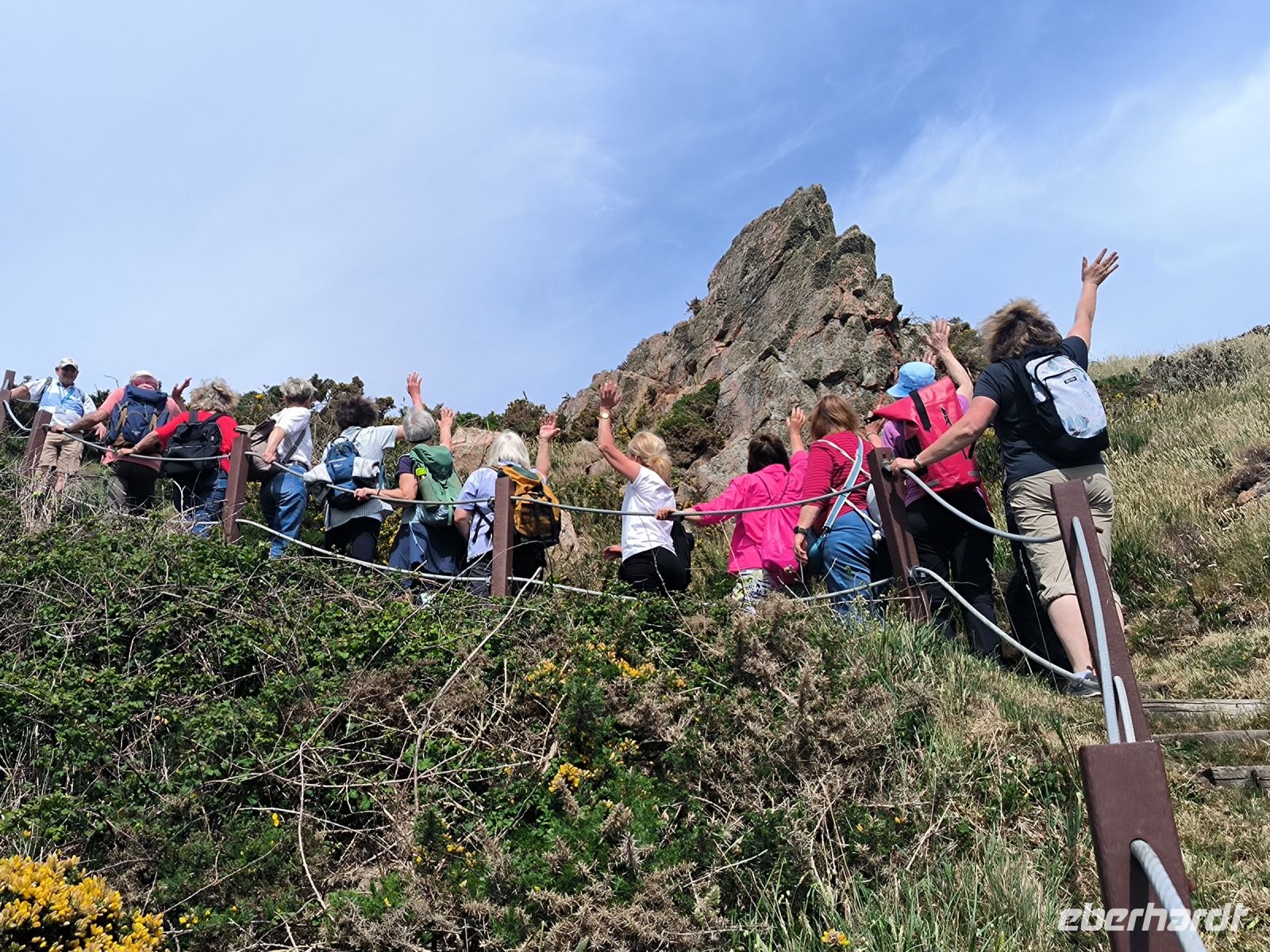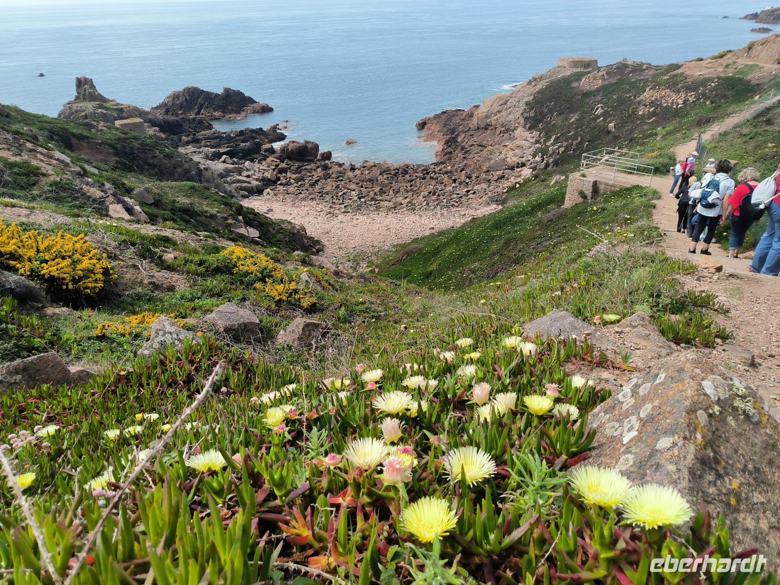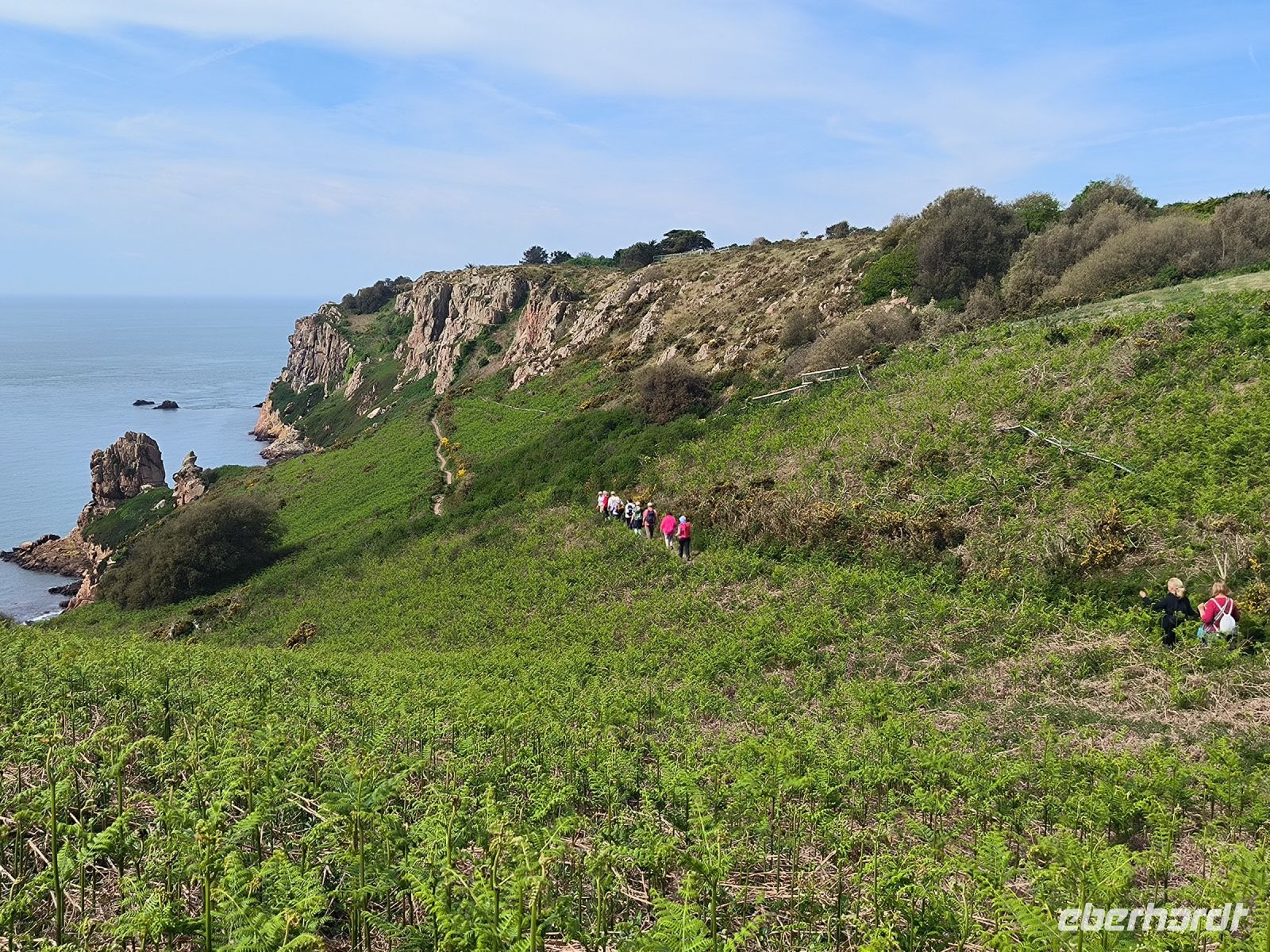Heute eröffnet unser Wanderguide Rémi einen ganz besonderen "Kindergarten". Wir bekommen "Künstlernamen" und so sind Elisabeth, Anne, Diana, Victoria und William unter uns. Es verspricht also, lustig zu werden. Wir starten am Grosnez Castle, der grauen Landzunge, an diesem so gar nicht grauen, sonnigen Tag. Hoch über der Plèmont Bay führt der Pfad durch herrliche gelbe Ginsterbüsche. Die "Heide" einmal anders. Nach jeder Kurve faszinieren uns neue Ausblicke über das blaue Meer. Für unsere "Kodak-Stopps" müssen wir stehen bleiben, manchmal geht es steil hinab, da ist Achtsamkeit gefragt.