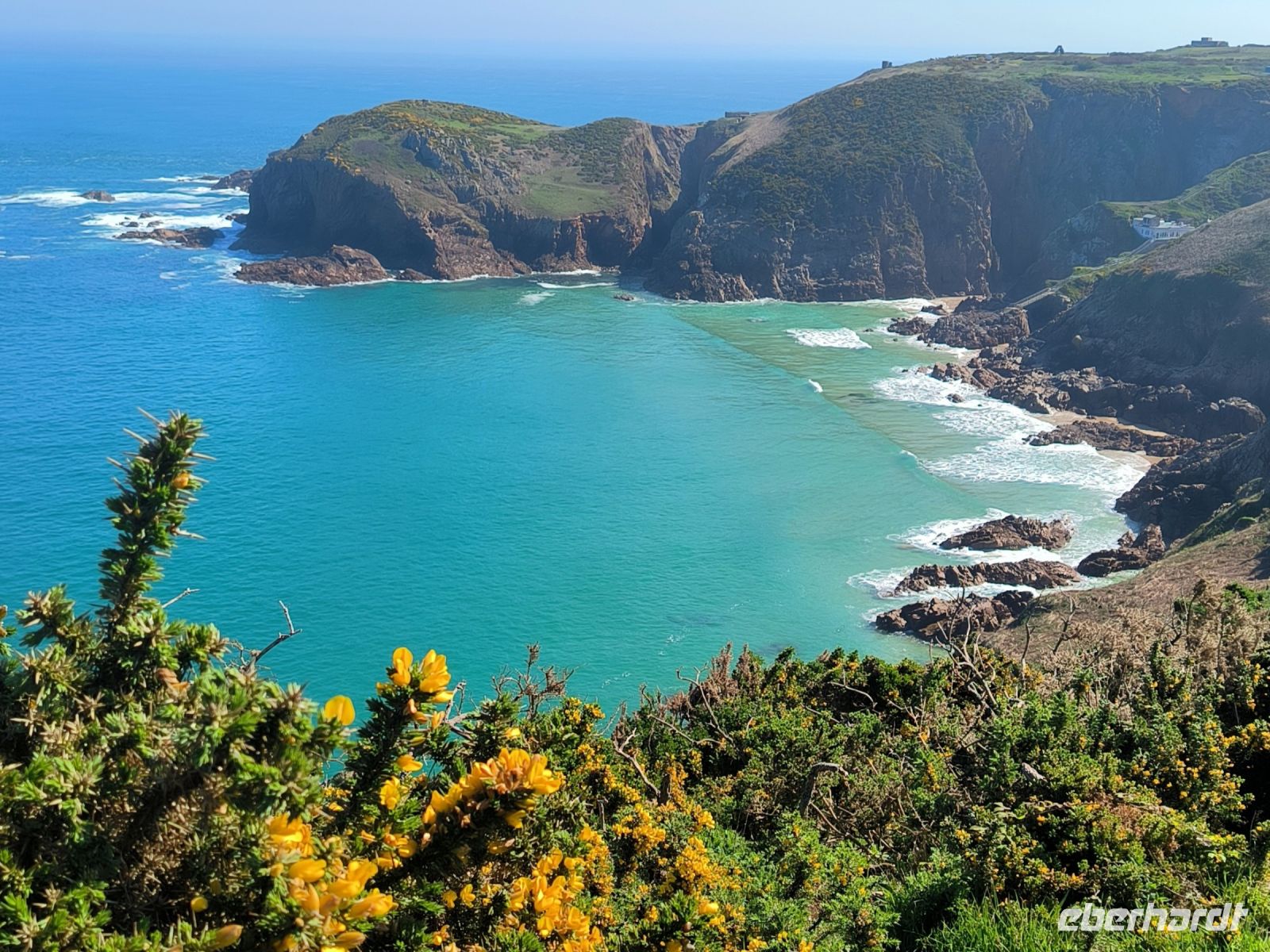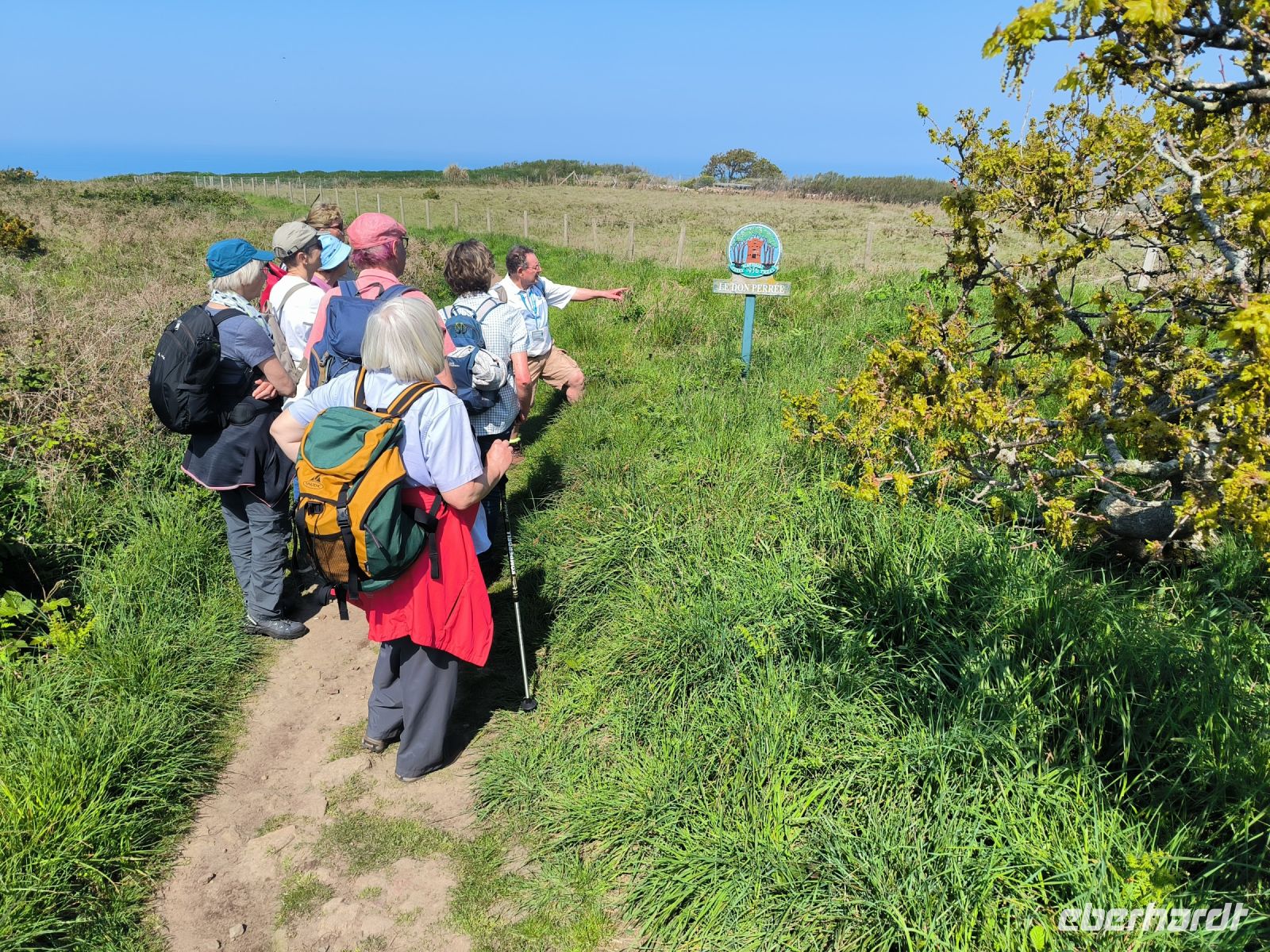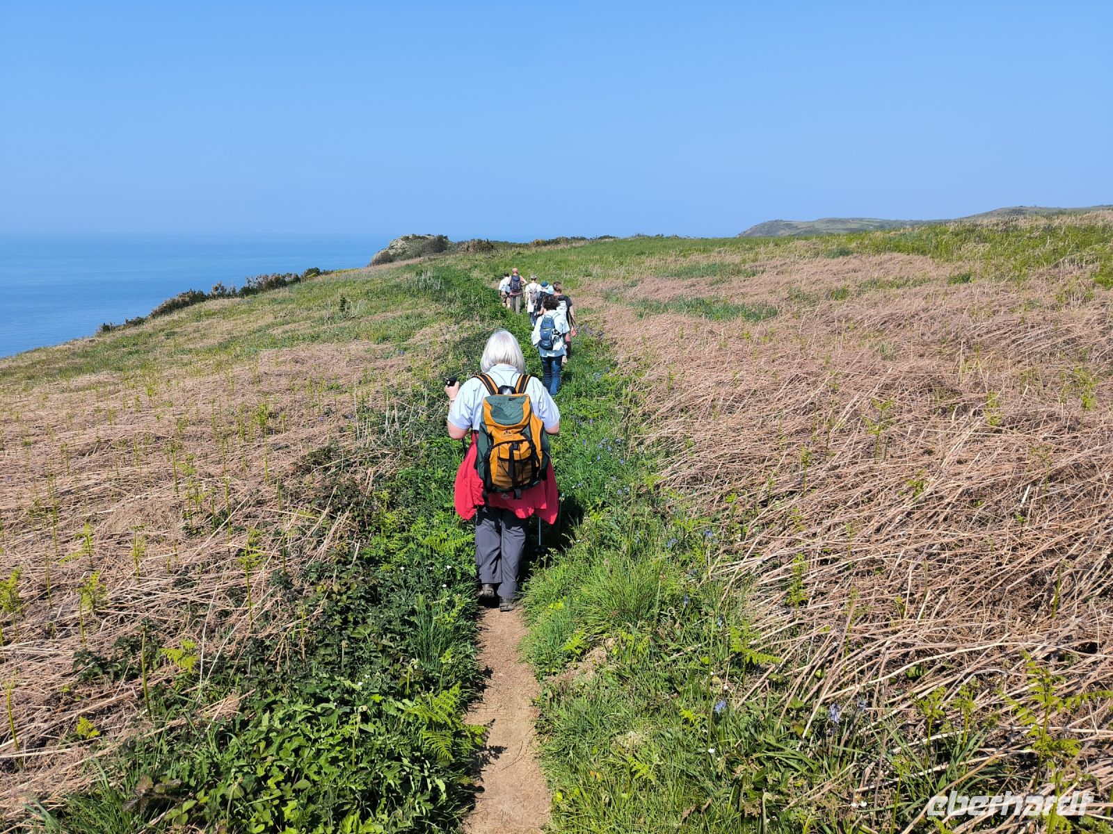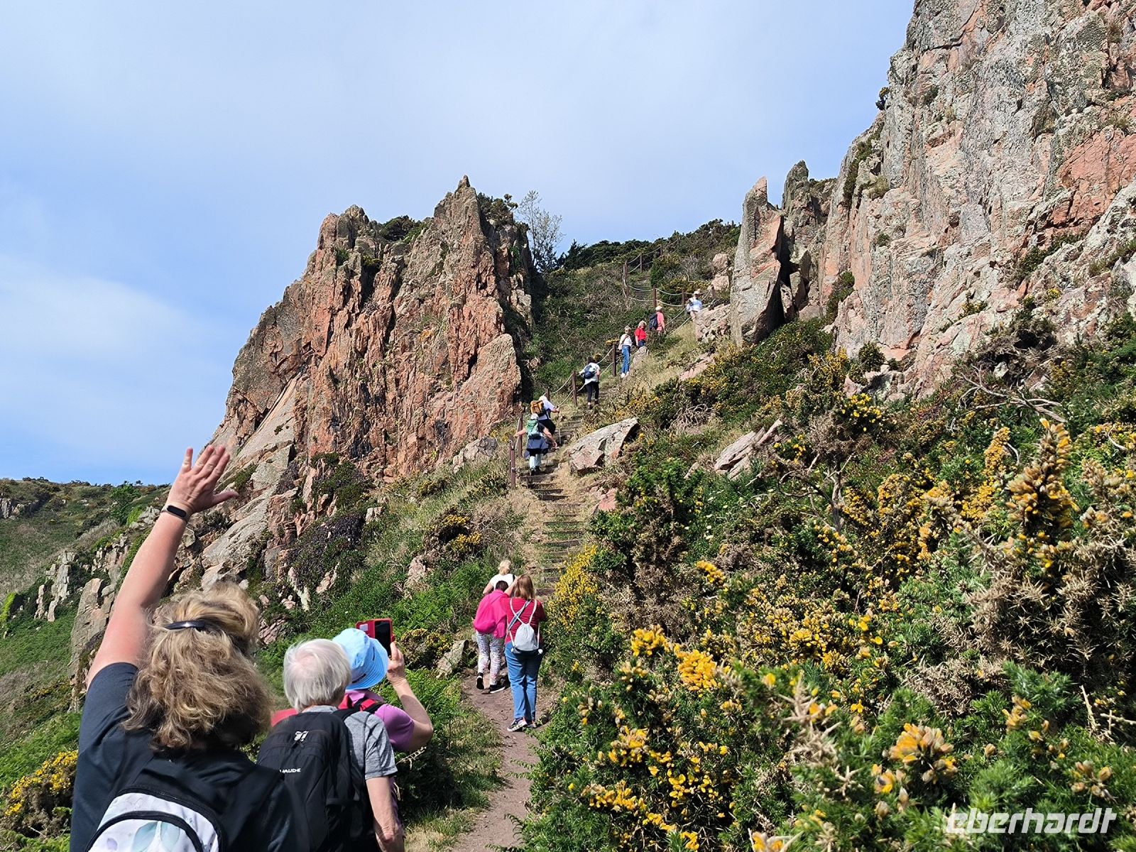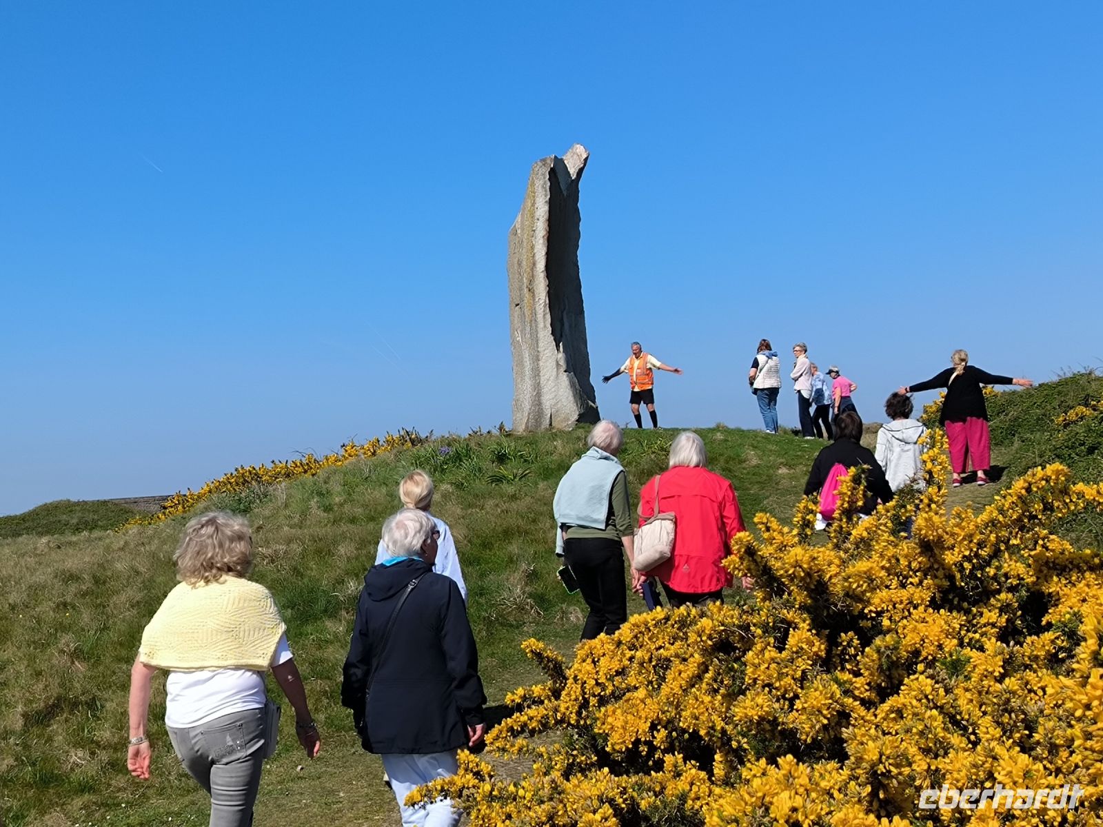 Heute eröffnet unser Wanderguide Rémi einen ganz besonderen "Kindergarten". Wir bekommen "Künstlernamen" und so sind Elisabeth, Anne, Diana, Victoria und William unter uns. Es verspricht also, lustig zu werden. Wir starten am Grosnez Castle, der grauen Landzunge, an diesem so gar nicht grauen, sonnigen Tag. Hoch über der Plèmont Bay führt der Pfad durch herrliche gelbe Ginsterbüsche. Die "Heide" einmal anders. Nach jeder Kurve faszinieren uns neue Ausblicke über das blaue Meer. Für unsere "Kodak-Stopps" müssen wir stehen bleiben, manchmal geht es steil hinab, da ist Achtsamkeit gefragt.