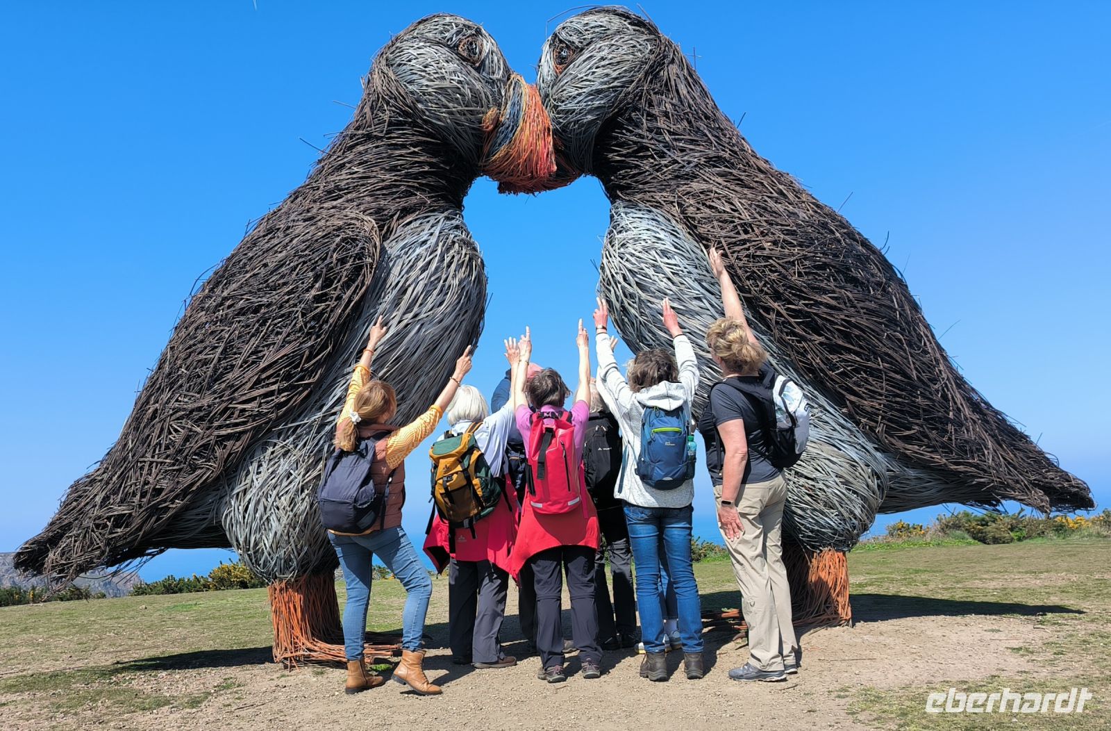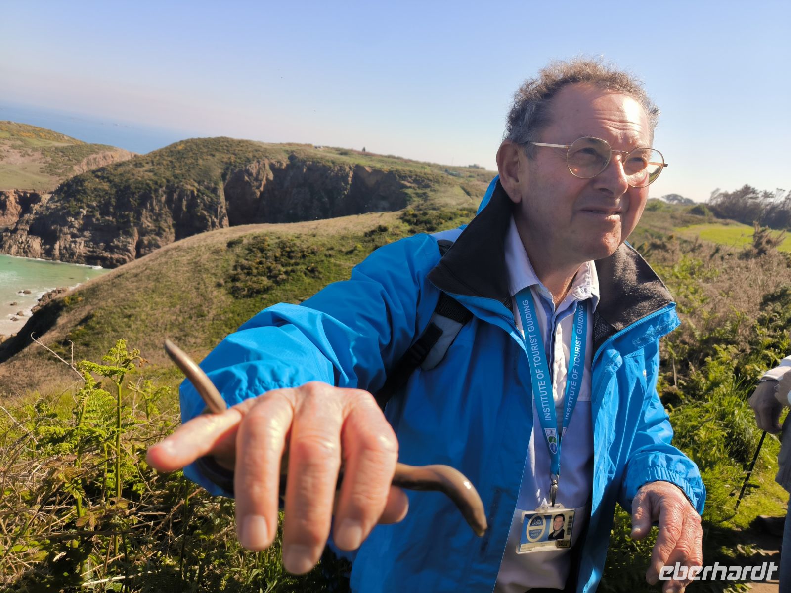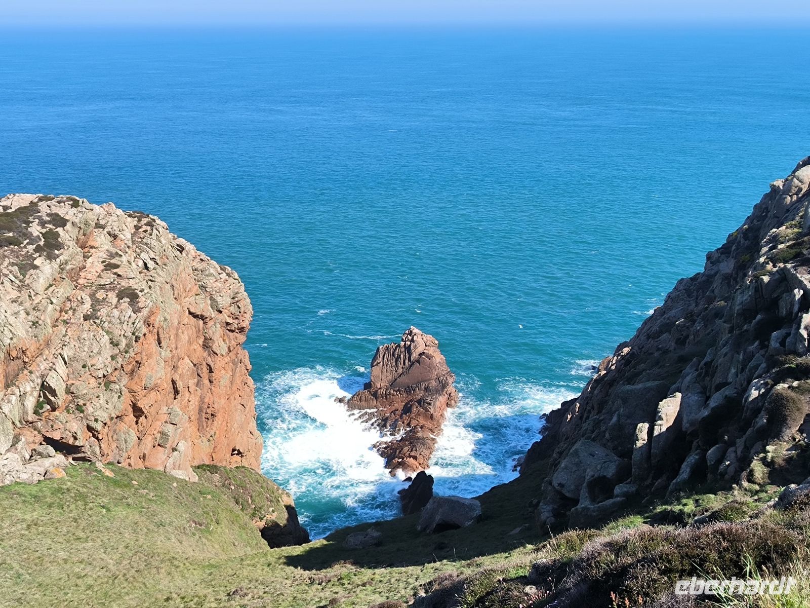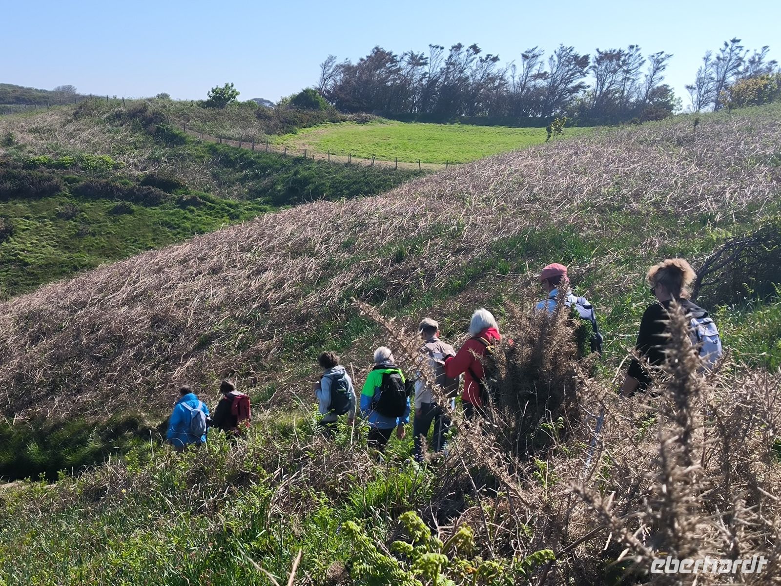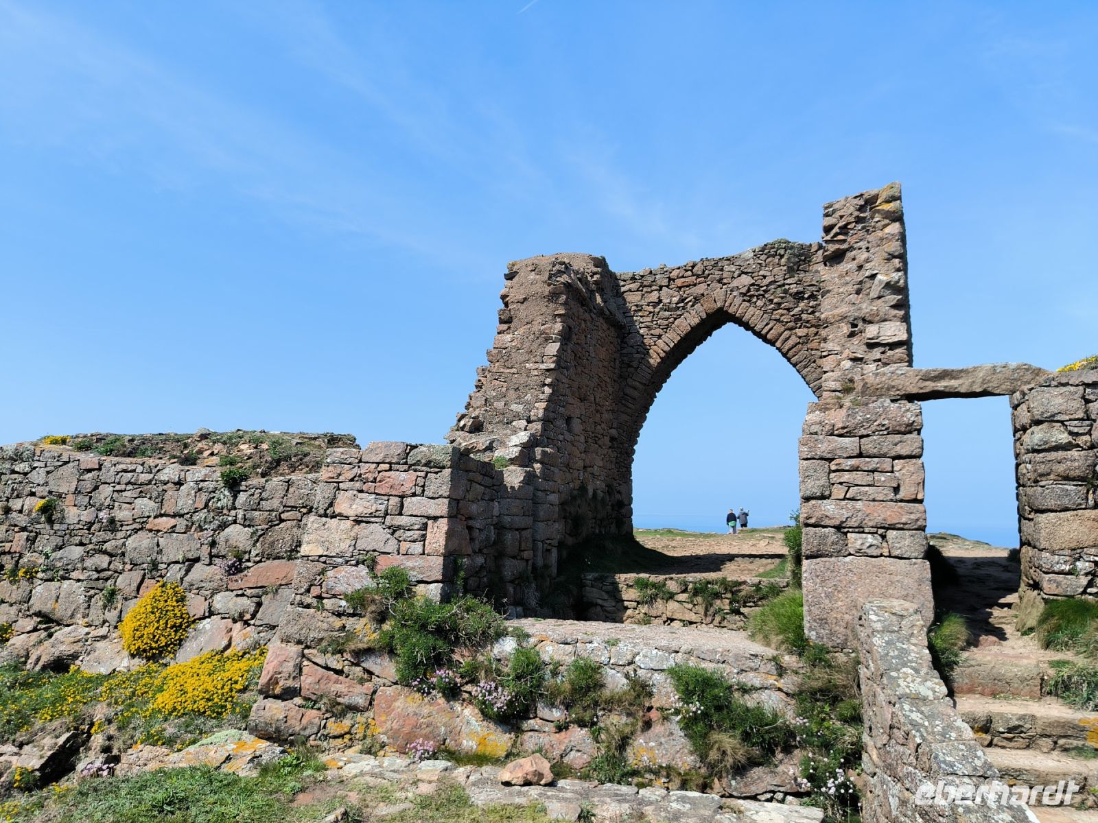 Heute eröffnet unser Wanderguide Rémi einen ganz besonderen "Kindergarten". Wir bekommen "Künstlernamen" und so sind Elisabeth, Anne, Diana, Victoria und William unter uns. Es verspricht also, lustig zu werden. Wir starten am Grosnez Castle, der grauen Landzunge, an diesem so gar nicht grauen, sonnigen Tag. Hoch über der Plèmont Bay führt der Pfad durch herrliche gelbe Ginsterbüsche. Die "Heide" einmal anders. Nach jeder Kurve faszinieren uns neue Ausblicke über das blaue Meer. Für unsere "Kodak-Stopps" müssen wir stehen bleiben, manchmal geht es steil hinab, da ist Achtsamkeit gefragt.