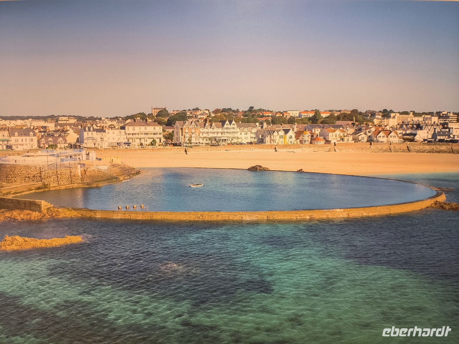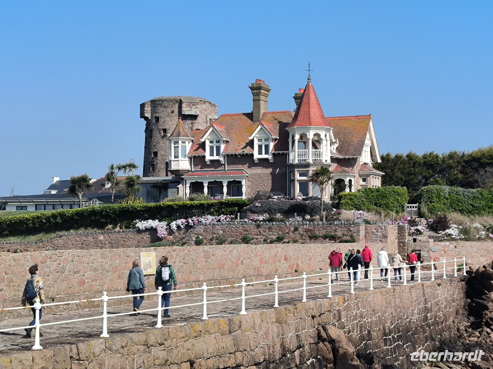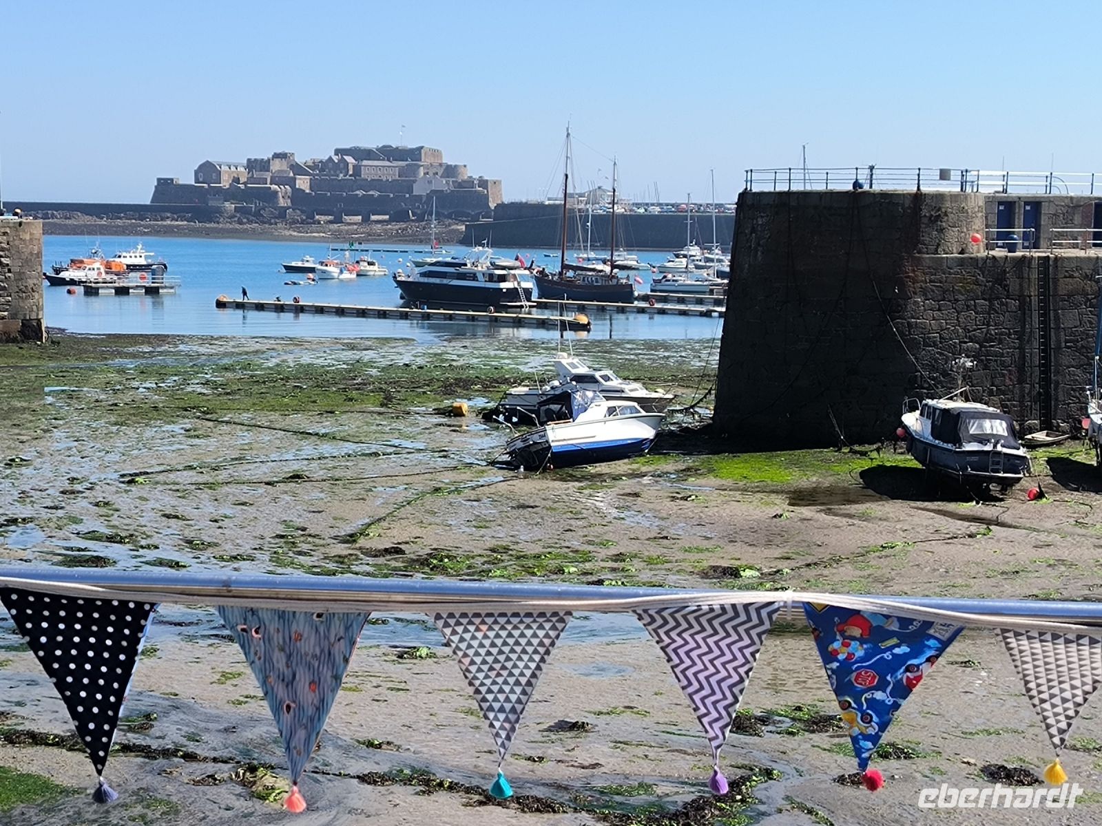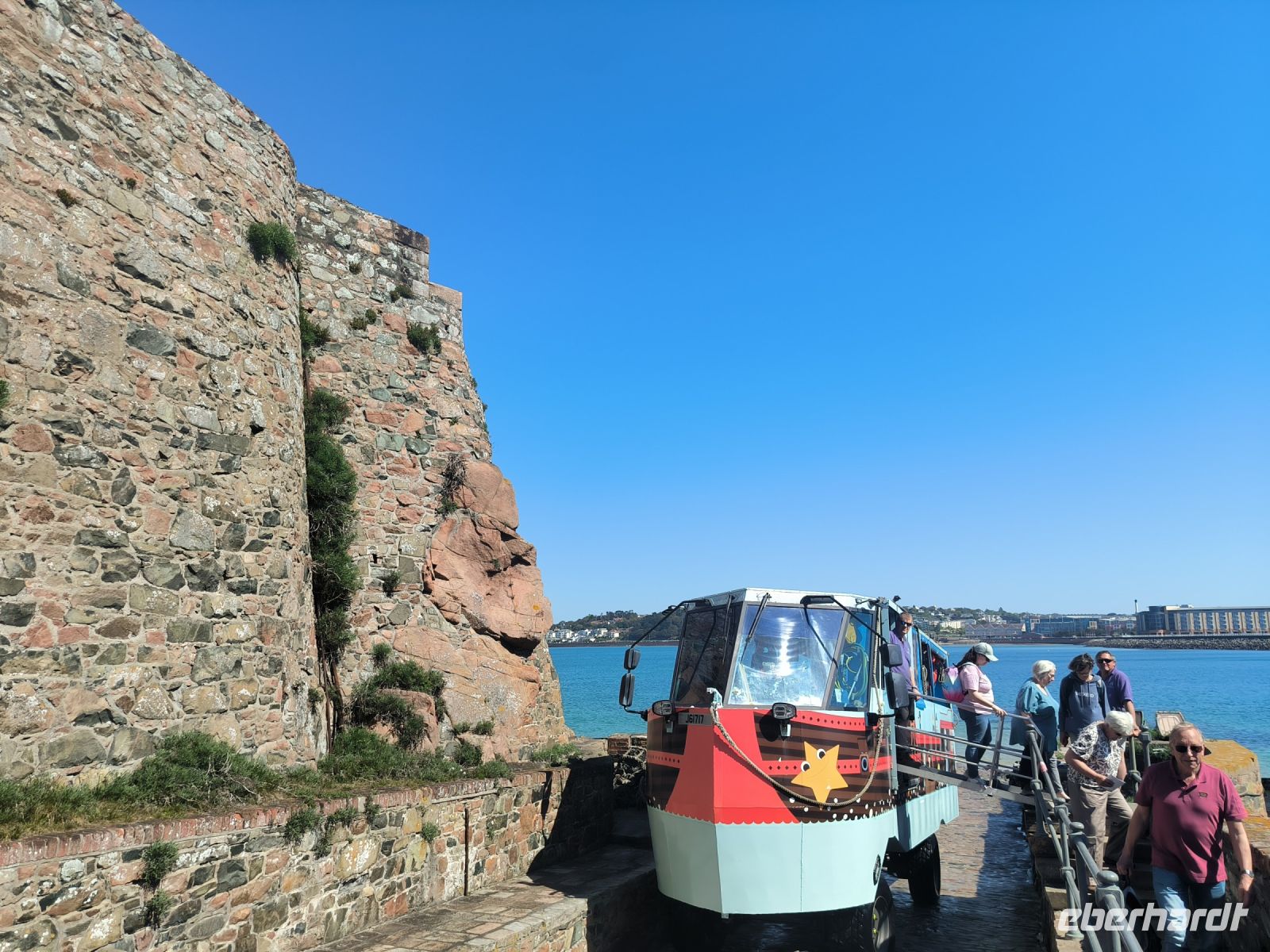 Der Tag heute steht zur freien Verfügung, aber wir folgen dem Vorschlag, die Festung zu besuchen, die seit dem 16. Jahrhundert den Ort beschützt und einen sicheren Ankerplatz für Handelsschiffe bot. Bei Flut erreichen wir die Burg etwas abenteuerlich mit dem Amphibienfahrzeug, einem schwimmenden Bus sozusagen. Wir erkunden das weitläufige Gelände mit Kanonen, Kasernen, Gräben, Türmen und Grünanlagen. Von oben haben wir eine phantastische Aussicht über die Bucht und zur Stadt. 12 Uhr mittags bekommen wir eine unterhaltsame Unterweisung in die Handhabung der Musketen und Kanonen und dürfen auch selbst das Regiment spielen. Nun haben wir uns eine Tasse Kaffee im Burggarten wirklich verdient. Inzwischen hat sich das Wasser wieder verzogen und bei Ebbe können wir gemütlich und mit trockenen Füßen durch das Watt zurück zur Stadt spazieren. Hier warten die Markthalle, nette Geschäfte und Lokale sowie das Jersey-Museum auf unseren Besuch. Die Wege trennen sich und wir erobern individuell den schönen Ort. Einige sind sogar so mutig, dass sie trotz frischer 10 Grad Wassertemperatur den Meerespool vor unserem Hotel ausprobieren.