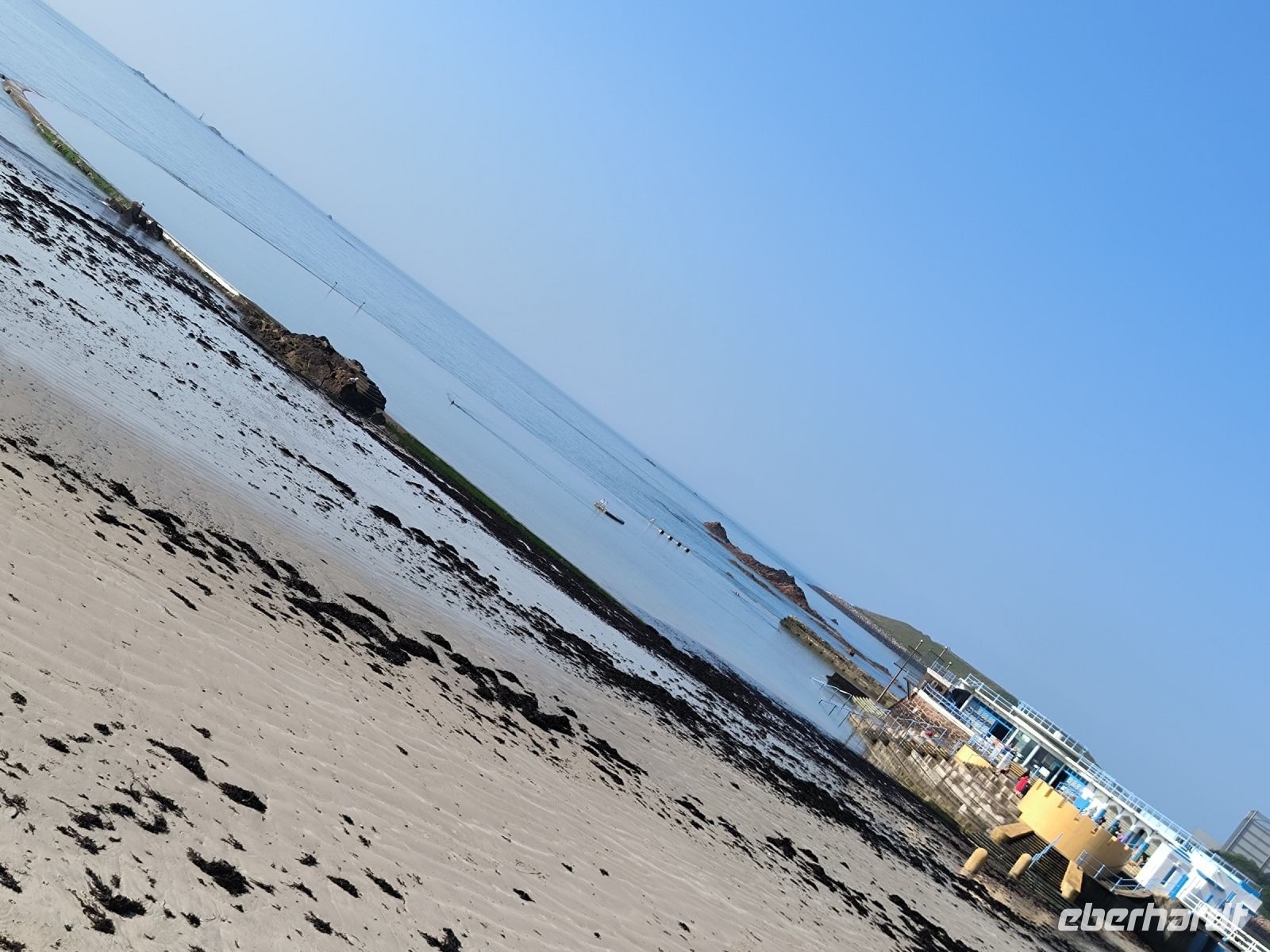 Da auf der Insel das Trinkwasser manchmal knapp werden kann, hat man Entsalzungsanlagen errichtet, an denen unser Weg vorbeiführt. Auch die alte Eisenbahnlinie auf der das Granitgestein transportiert wurde, sehen wir. Und dann, früher als gedacht, taucht der Leuchtturm von Corbiére in der Ferne auf. Diesen wollen wir erreichen und da das Wasser sich gegen Mittag wieder zurückgezogen hat, gelingt uns das auch mit trockenen Füßen. Natürlich nicht, ohne vorher ein leckeres Jersey Eis zu genießen.