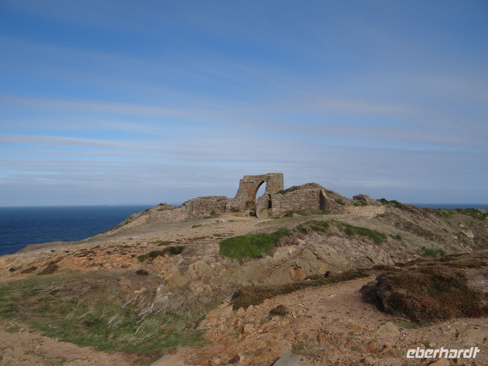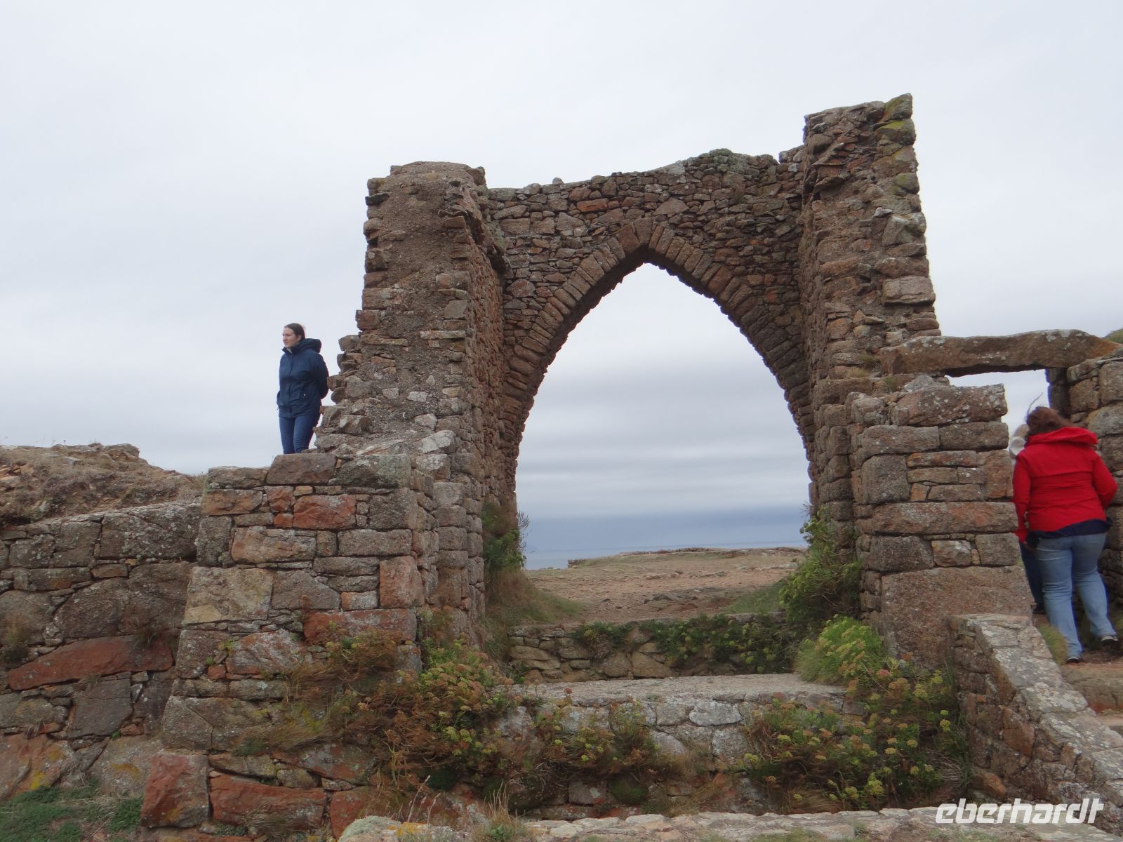 Nahe dran liegt Crosnez Castle. Von der Burg ist hingegen nicht mehr viel übrig, ein schöner Torbogen, die Vertiefungen in den Steinpfosten für das Falltor und der Graben darunter sind gut zu erkennen. Es fehlte der Mannschaft unter anderem ein eigener Brunnen, keine gute Voraussetzung im Fall einer Belagerung. Ein heftiger Wind hat sich aufgetan und zippelt an uns, mal von links, mal von rechts.