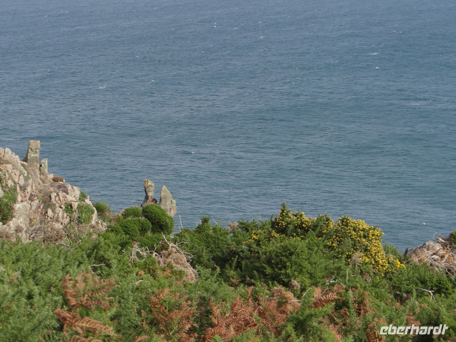 Wir wandern entlang des Küstenpfads hoch über der Steilküste durch die mit Ginster und Wacholder bewachsene Heidelandschaft bis zur Südwestspitze von Jersey.