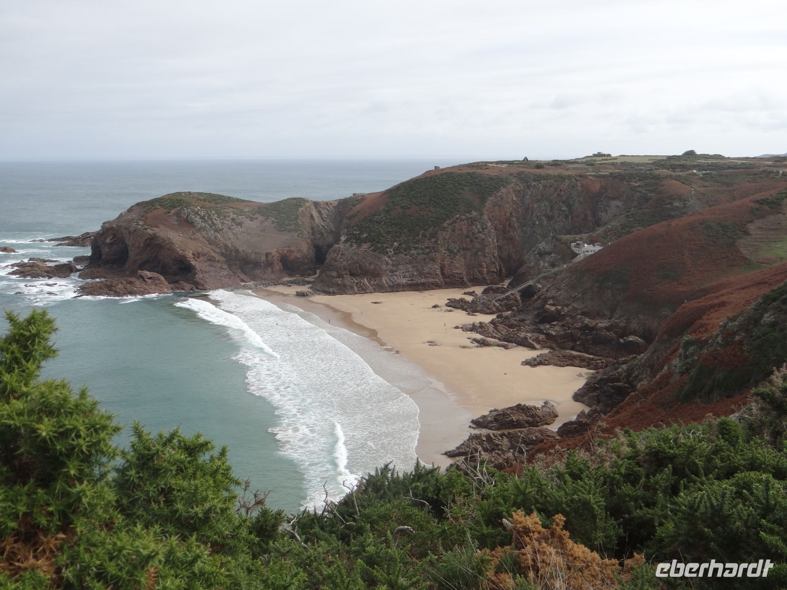 Wir sind an der Bucht Grève de Lecq. Hier ist der Sand rötlich - Jersey Granit, fein gemahlen. Die vielen mit diesem Stein auf der Insel gebauten Häuser haben eine warme Ausstrahlung.