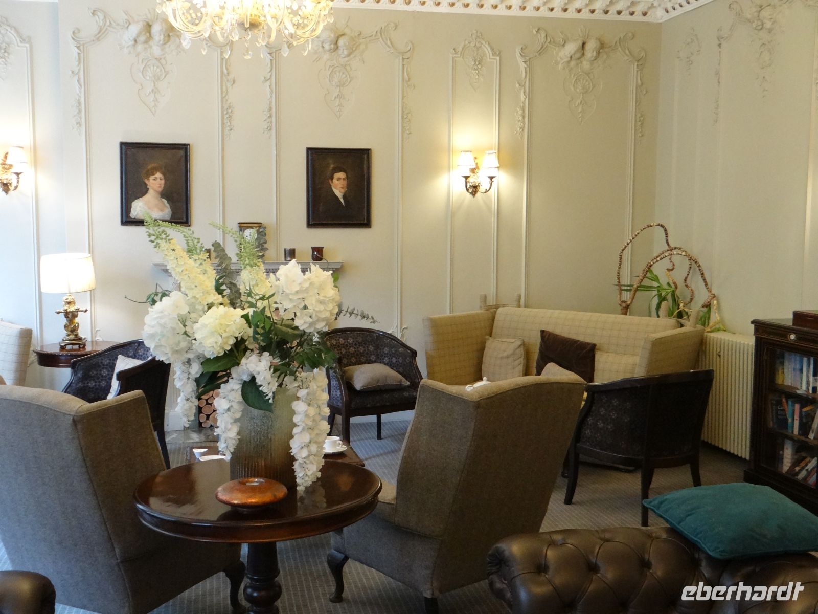Nach der Besichtigung fahren wir ins Hotel Château La Chaire, einem sehr eleganten Hotel, nahe der Rozel Bay. In der Lounge sind verschiedene Tische für uns gedeckt. Wir lassen uns in die Sofas sinken und betrachten die Stuckdecke, den geschmackvoll eingerichteten Raum und lassen uns mit Tee und Kaffee, Scones mit Clotted Cream und Erdbeermarmelade verwöhnen. Was für eine Überraschung: ein Cream Tea in schönem Ambiente. Die Scones sind hausgebacken und schmecken sehr lecker.