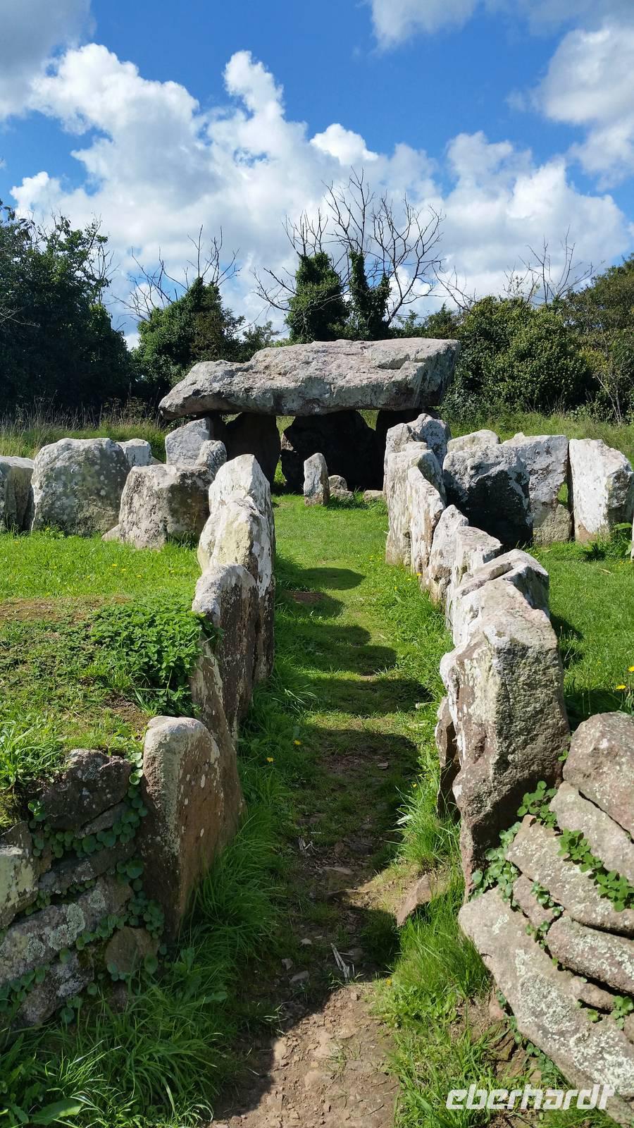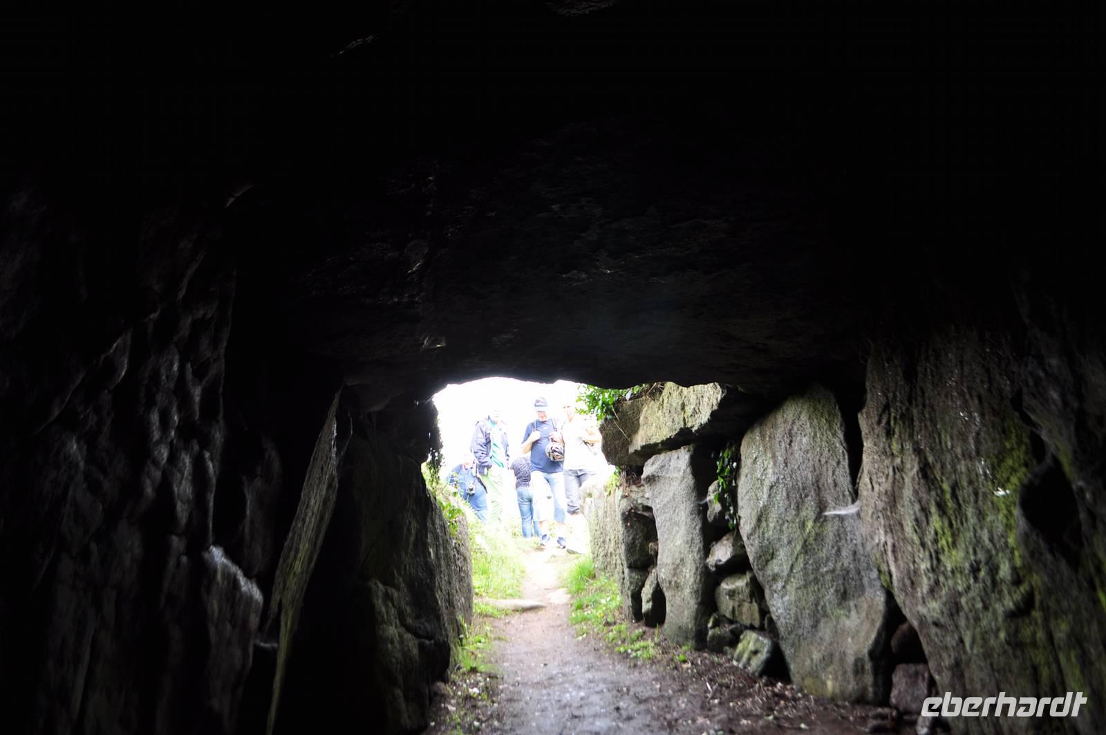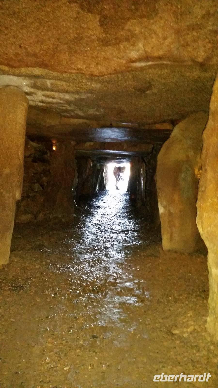 der Le Déhus Dolmen, ein ca. 5.500 Jahre altes Ganggrab. Der innere Gang hat eine Länge von ca. 10m. Pragmatisch ist es mit einschaltbarem Licht ausgestattet, was die Besichtigung erleichtert. In gebückter Haltung dringen wir in das Innere vor.