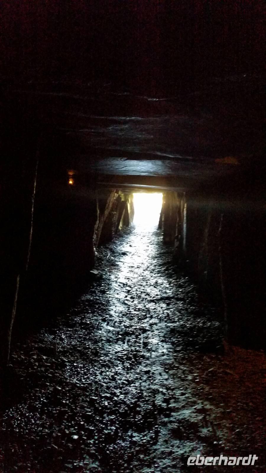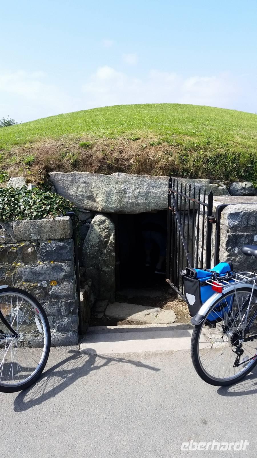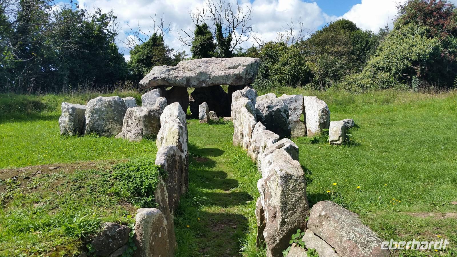 der Le Déhus Dolmen, ein ca. 5.500 Jahre altes Ganggrab. Der innere Gang hat eine Länge von ca. 10m. Pragmatisch ist es mit einschaltbarem Licht ausgestattet, was die Besichtigung erleichtert. In gebückter Haltung dringen wir in das Innere vor.