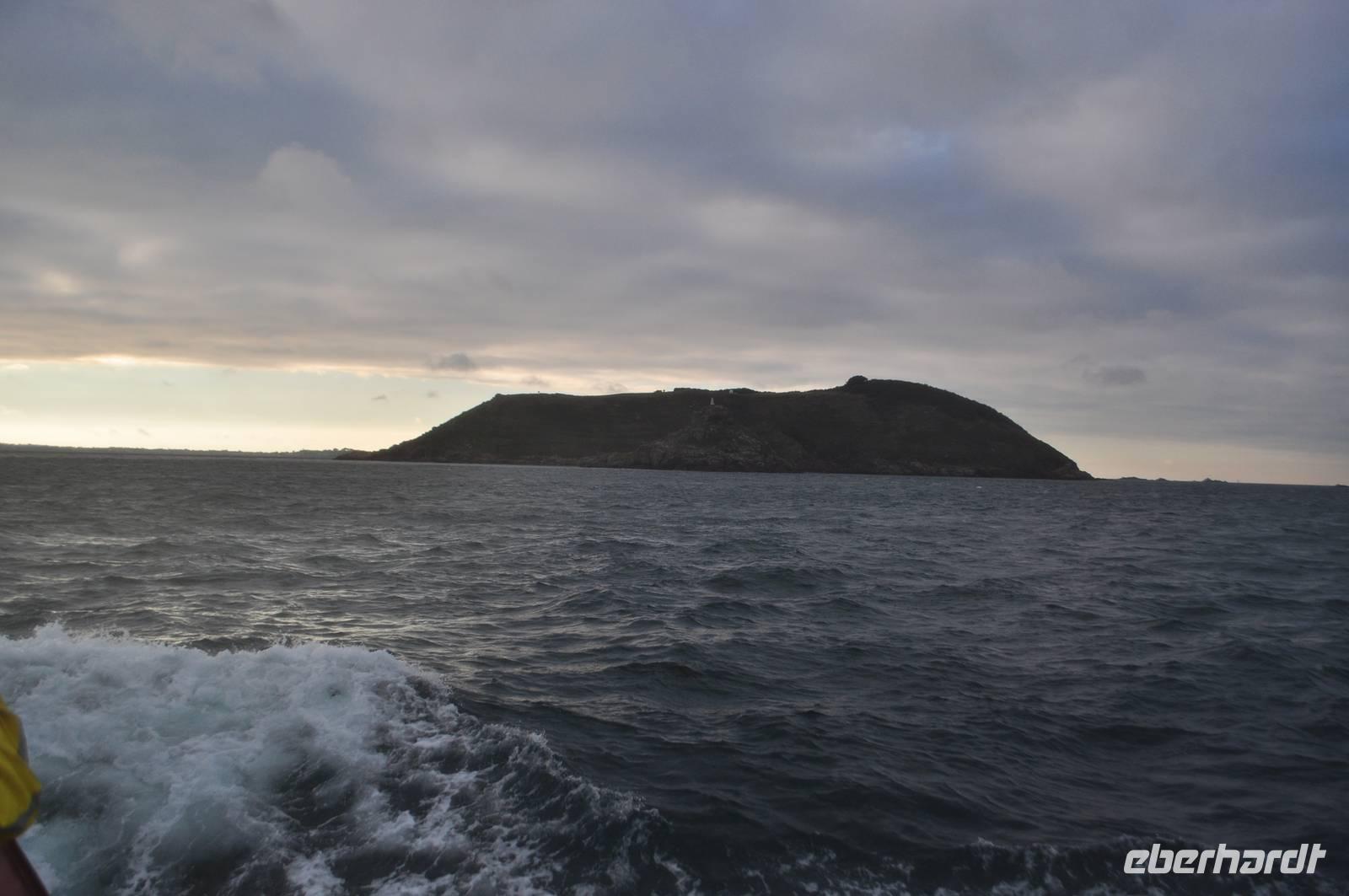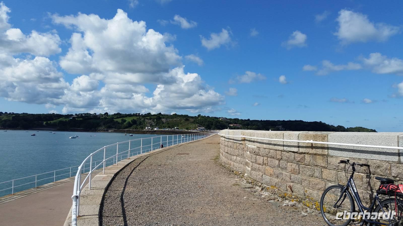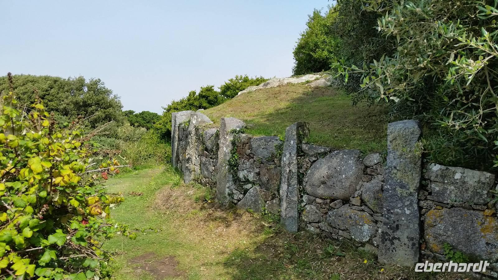 „La Pouquelaye de Faldouët". Es wurde in der Zeit 4.000 bis 3.250 v. Chr. errichtet. Anschließend geht es wieder bergab in Richtung Insel-Ostspitze. Die lange Mole bildet den nächsten Punkt aller Kanalinseln zum französischen Festland (Normandie).