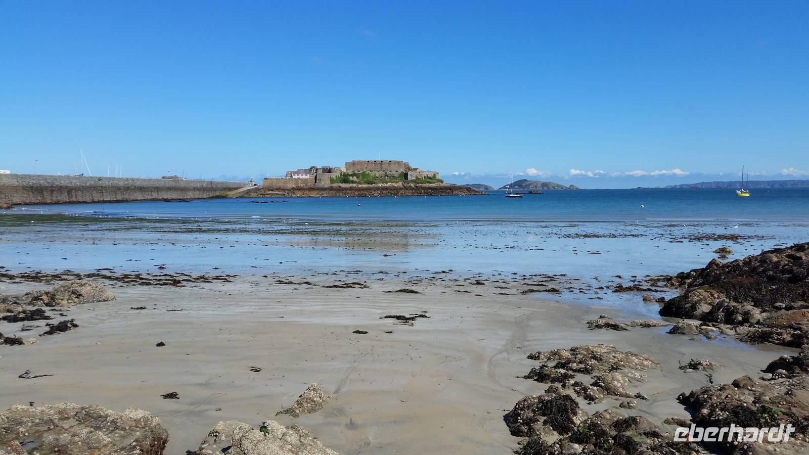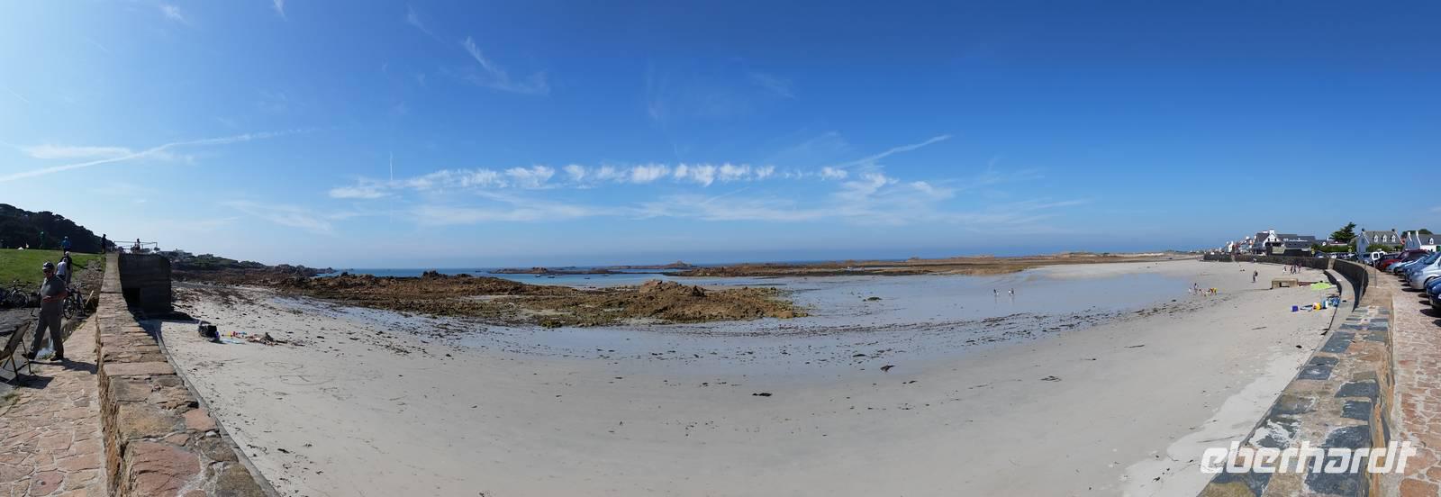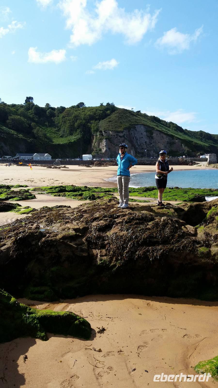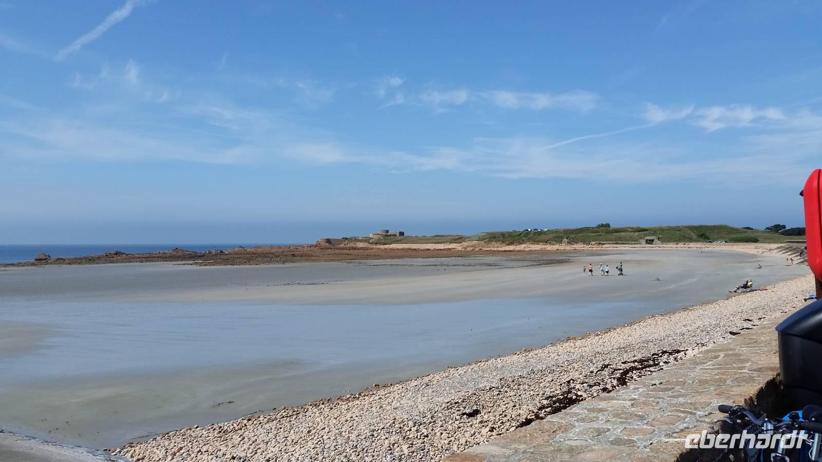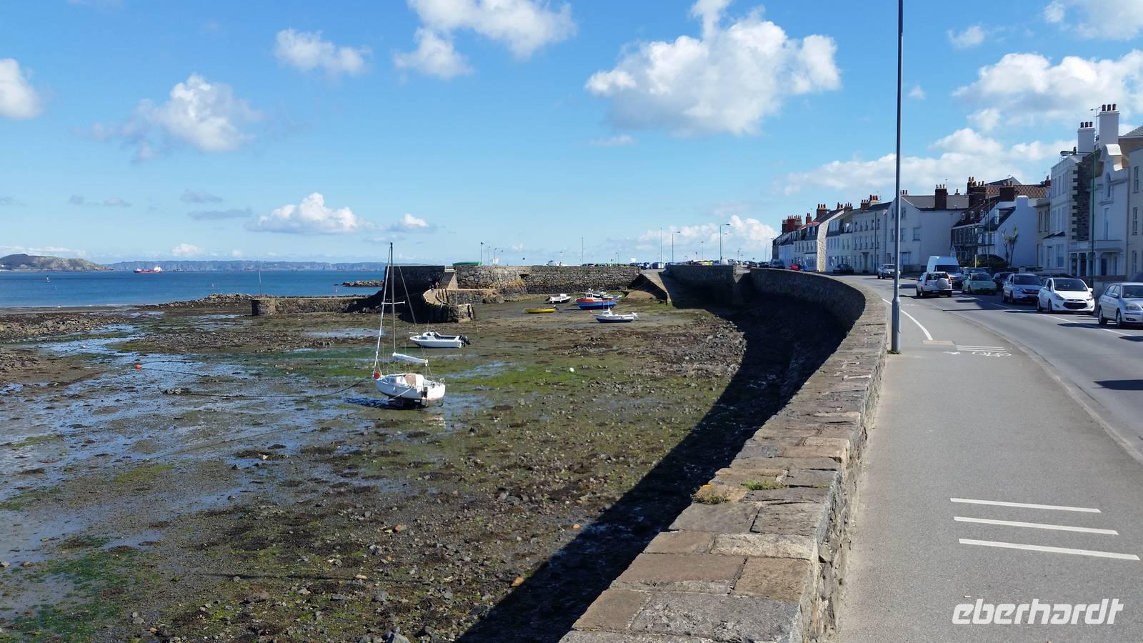 Etwas verspätet können wir endlich zu unserer ersten Radetappe aufbrechen. Wir starten bei herrlichem Wetter direkt an unserem Hotel. Heute radeln wir nicht allein, sondern in Begleitung von Profis, heute findet der Guernsey Triathlon statt. Schon zu Beginn erleben wir die großen Naturkräfte, die auf den Kanalinseln wirken. Bei unserer Ankunft ist „High Tide", wir würden Flut sagen, nun ist „Low Tide", Ebbe. Der Tidenhub zwischen dem Höchststand bei Flut und dem Niedrigstand bei Ebbe beträgt 8-9 m!