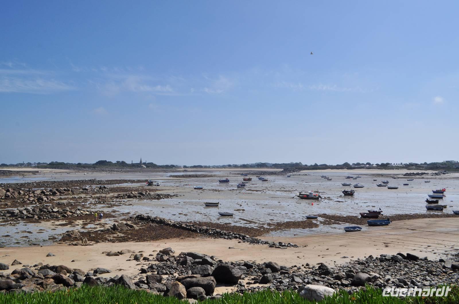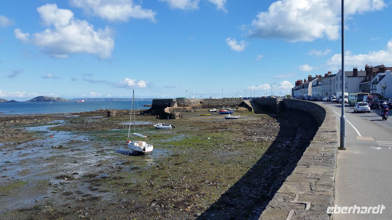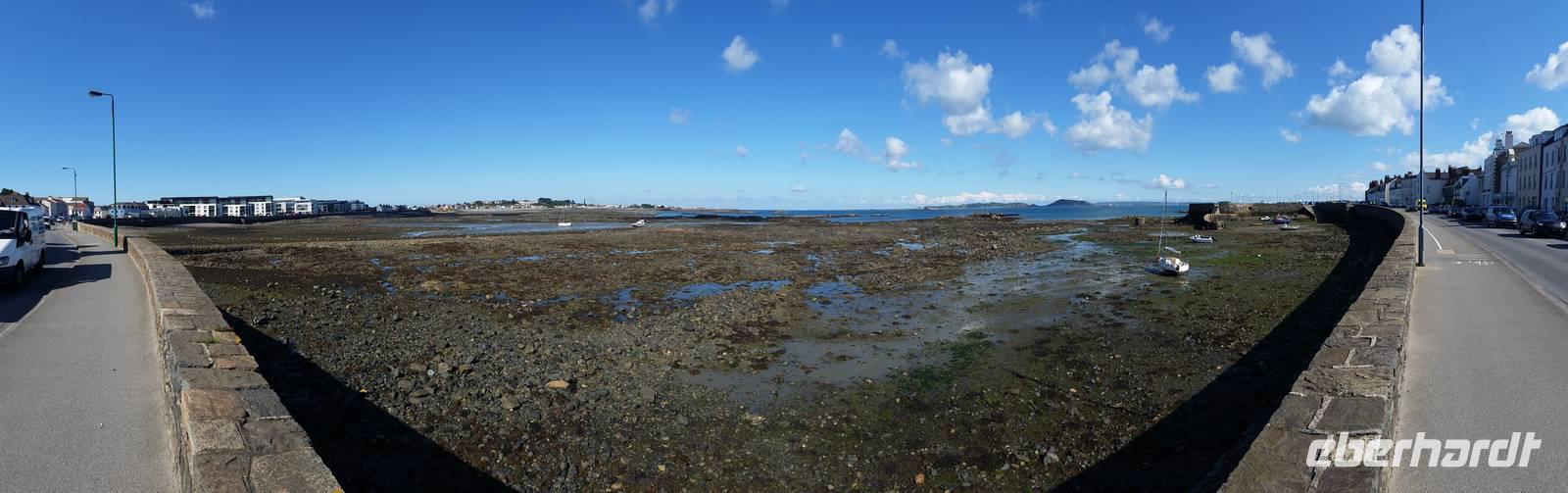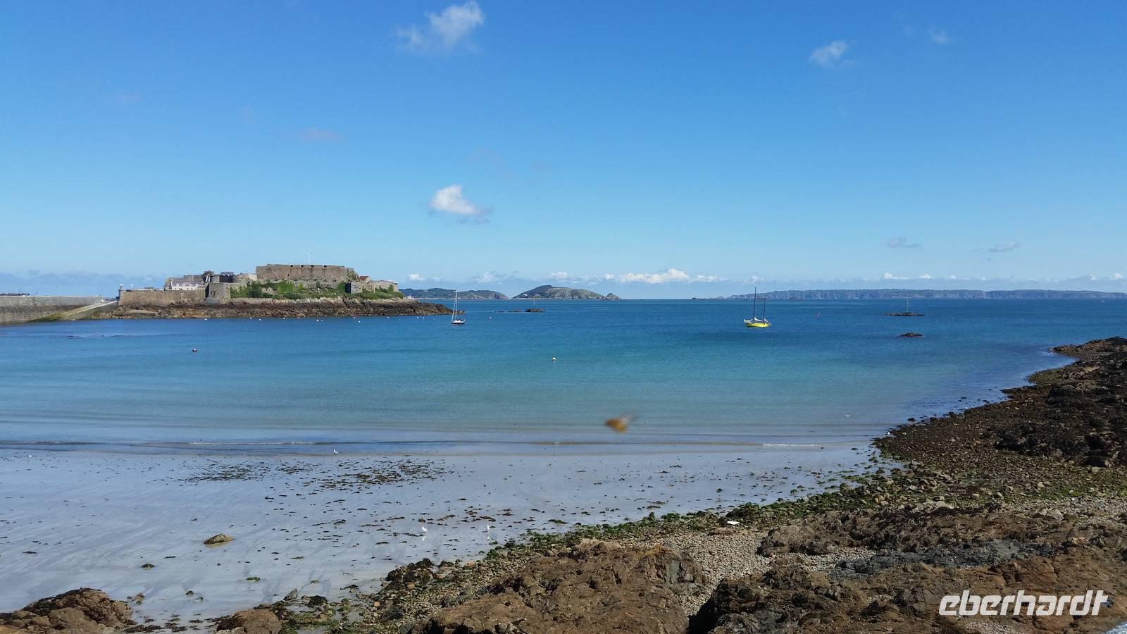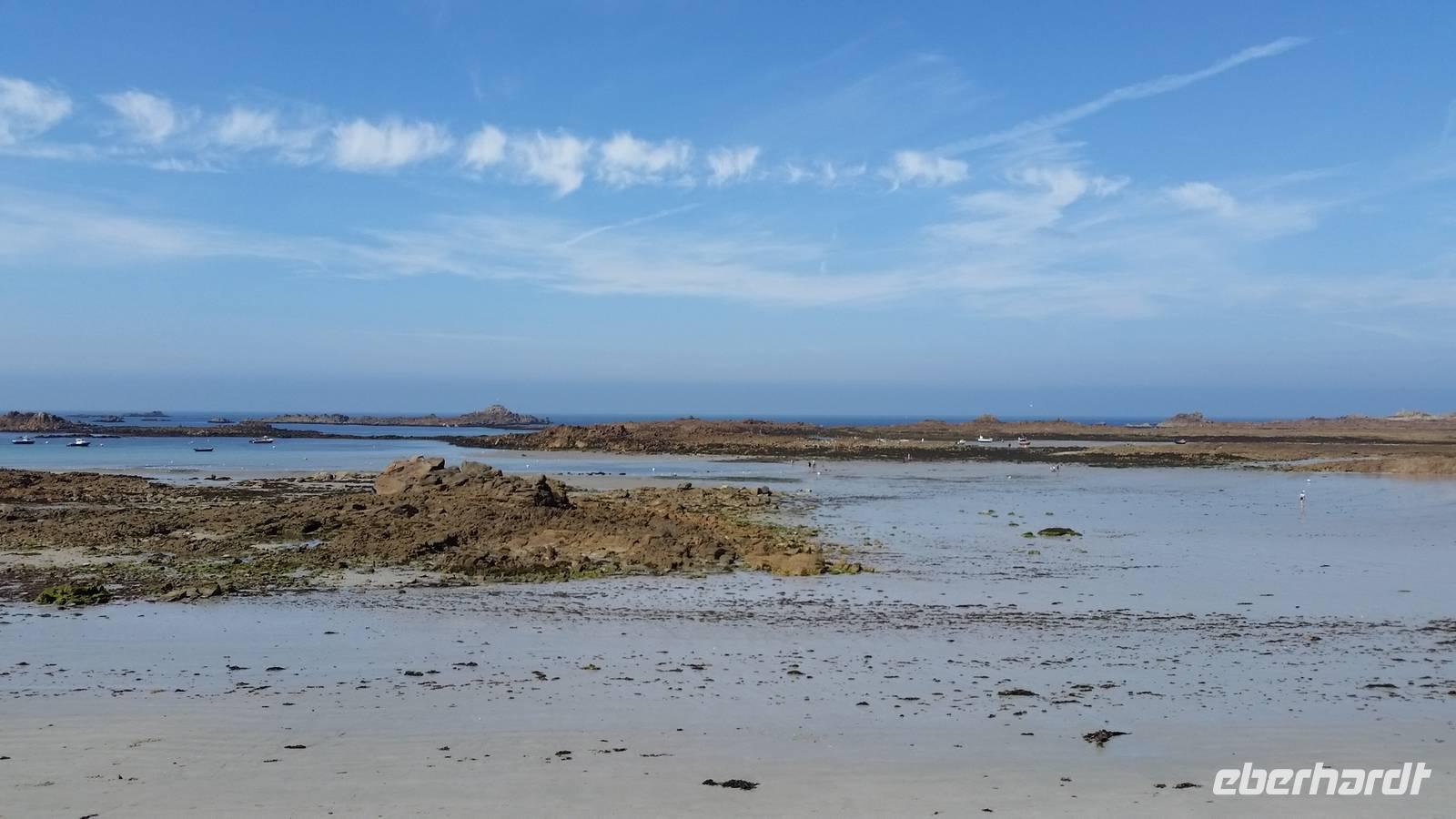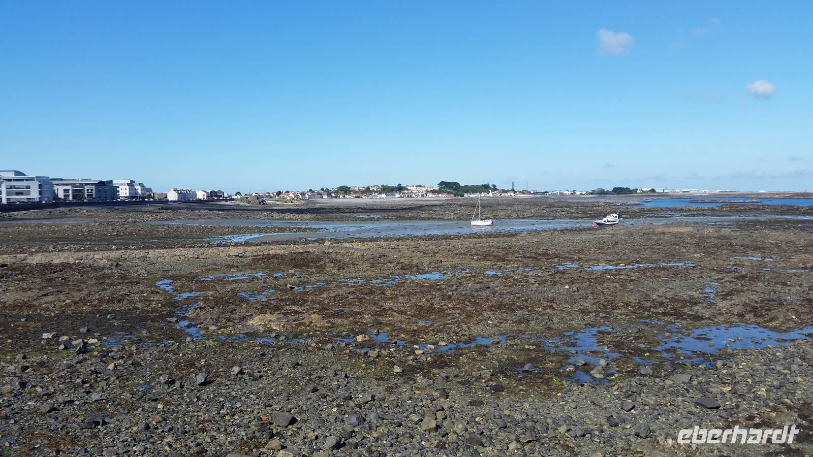 Etwas verspätet können wir endlich zu unserer ersten Radetappe aufbrechen. Wir starten bei herrlichem Wetter direkt an unserem Hotel. Heute radeln wir nicht allein, sondern in Begleitung von Profis, heute findet der Guernsey Triathlon statt. Schon zu Beginn erleben wir die großen Naturkräfte, die auf den Kanalinseln wirken. Bei unserer Ankunft ist „High Tide", wir würden Flut sagen, nun ist „Low Tide", Ebbe. Der Tidenhub zwischen dem Höchststand bei Flut und dem Niedrigstand bei Ebbe beträgt 8-9 m!