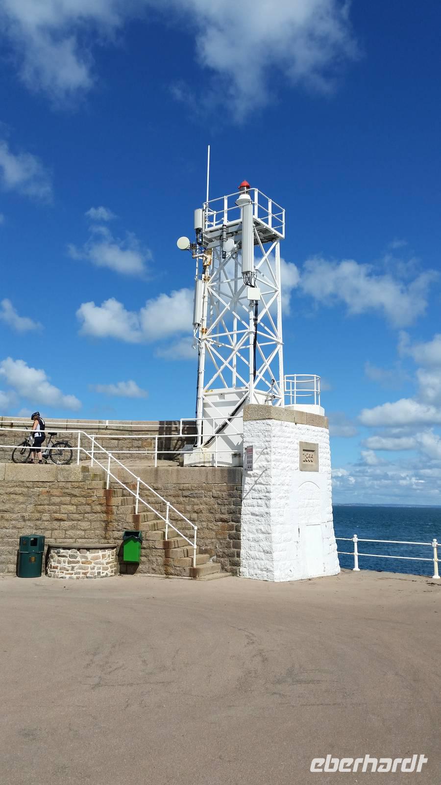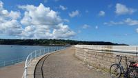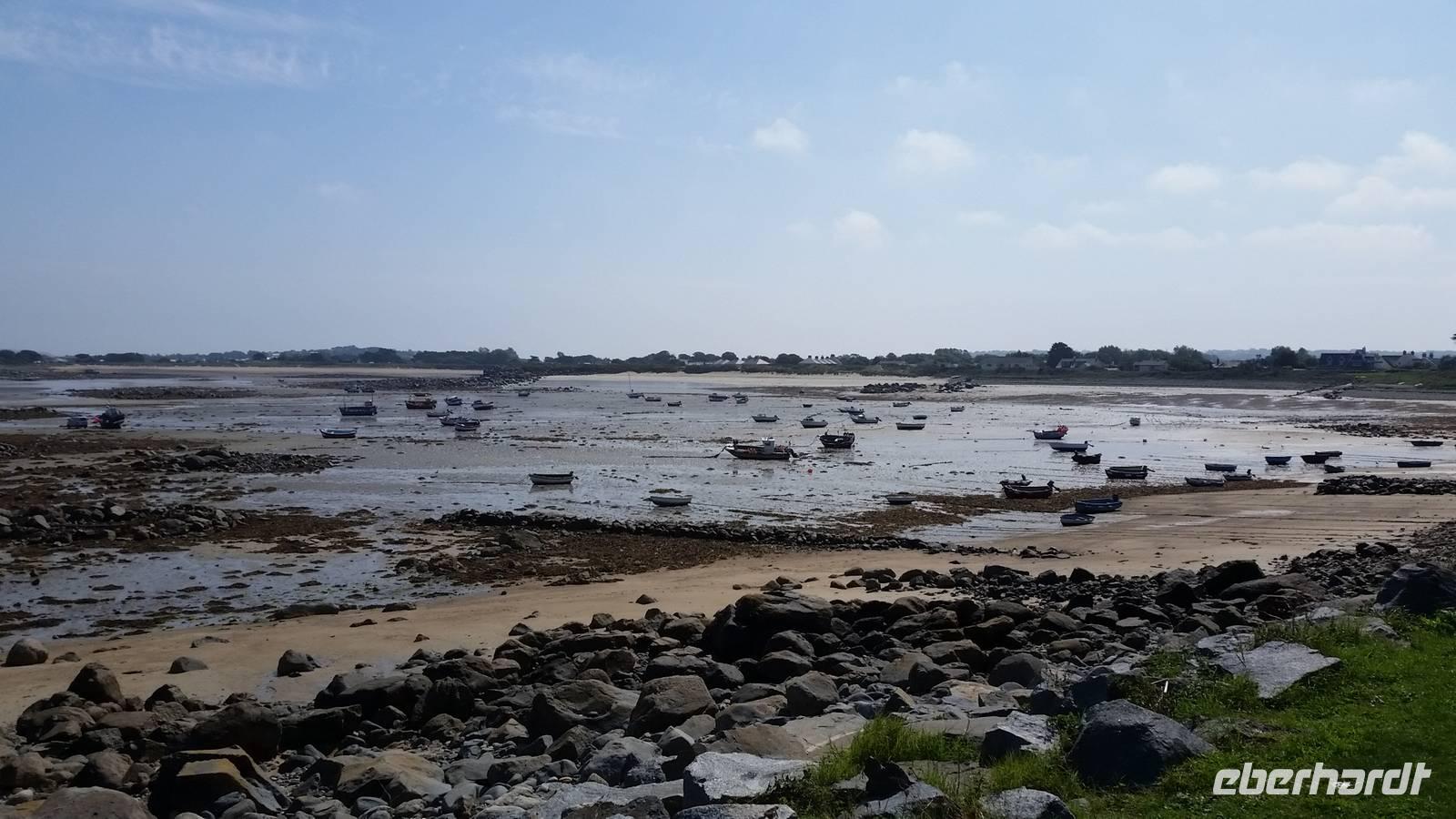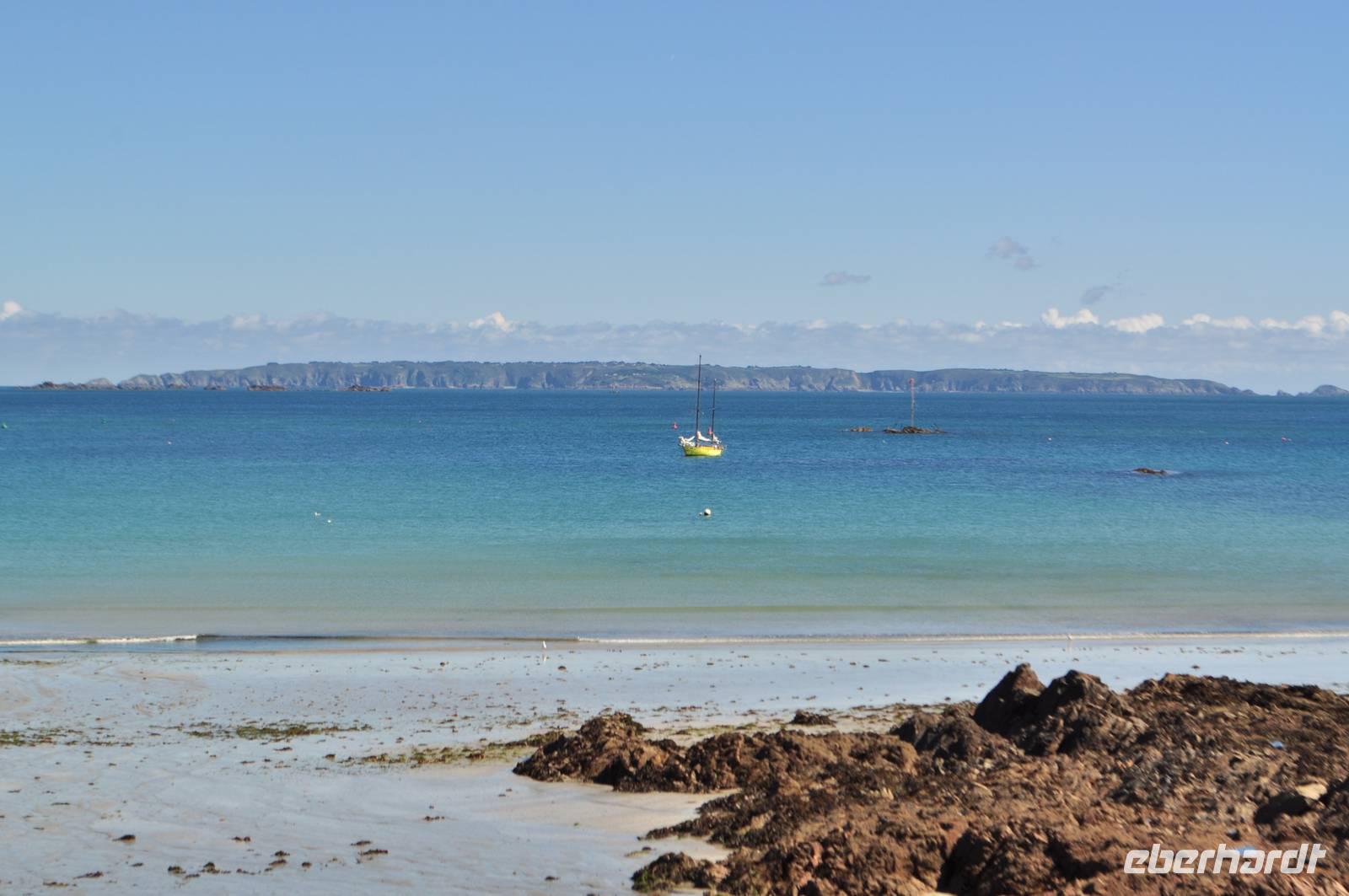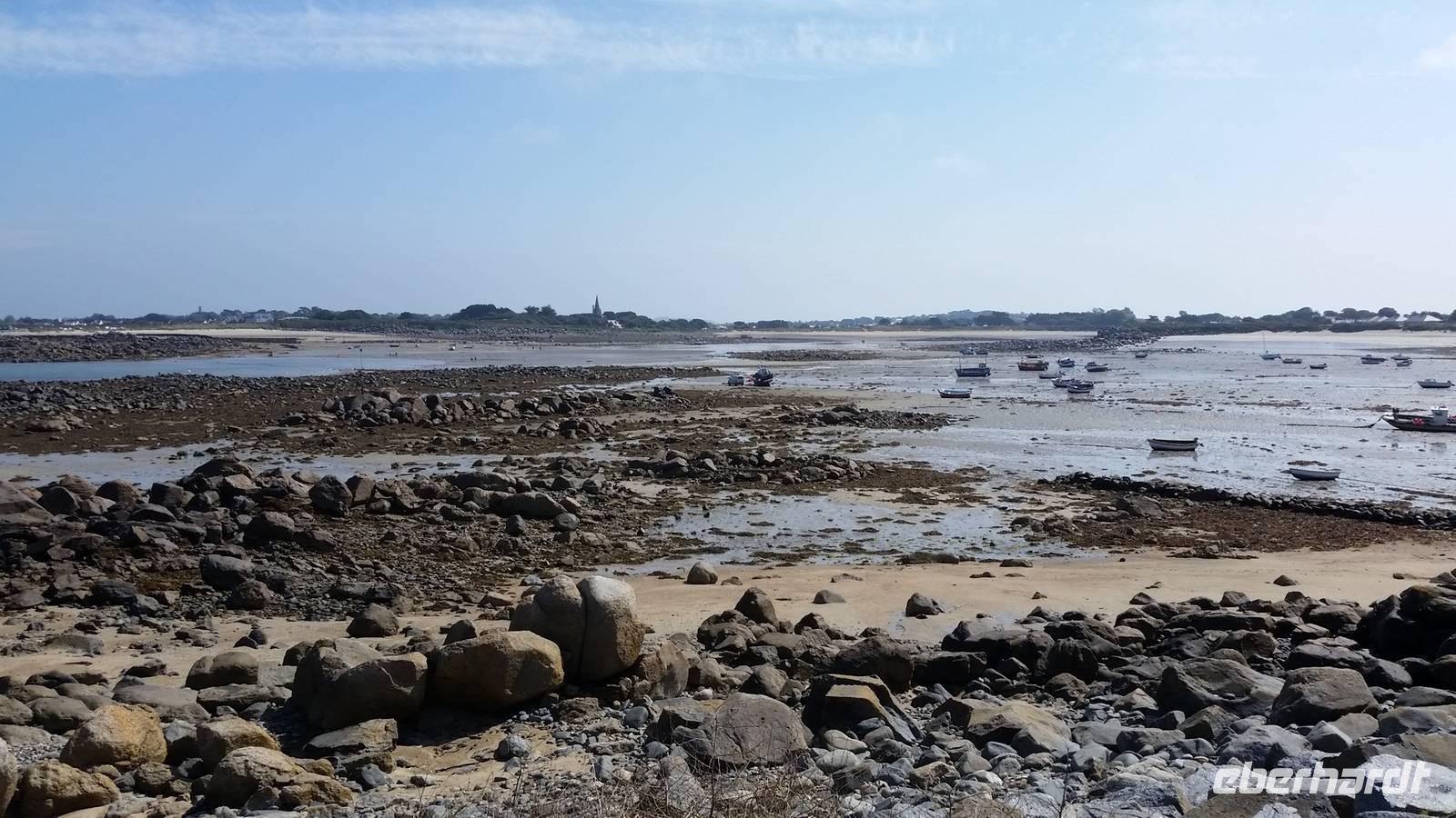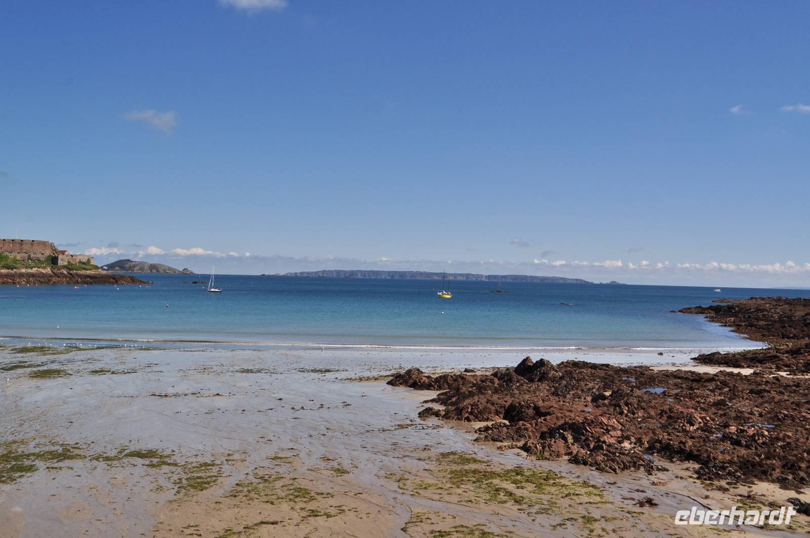 Etwas verspätet können wir endlich zu unserer ersten Radetappe aufbrechen. Wir starten bei herrlichem Wetter direkt an unserem Hotel. Heute radeln wir nicht allein, sondern in Begleitung von Profis, heute findet der Guernsey Triathlon statt. Schon zu Beginn erleben wir die großen Naturkräfte, die auf den Kanalinseln wirken. Bei unserer Ankunft ist „High Tide", wir würden Flut sagen, nun ist „Low Tide", Ebbe. Der Tidenhub zwischen dem Höchststand bei Flut und dem Niedrigstand bei Ebbe beträgt 8-9 m!