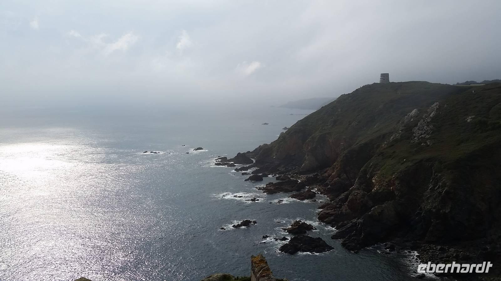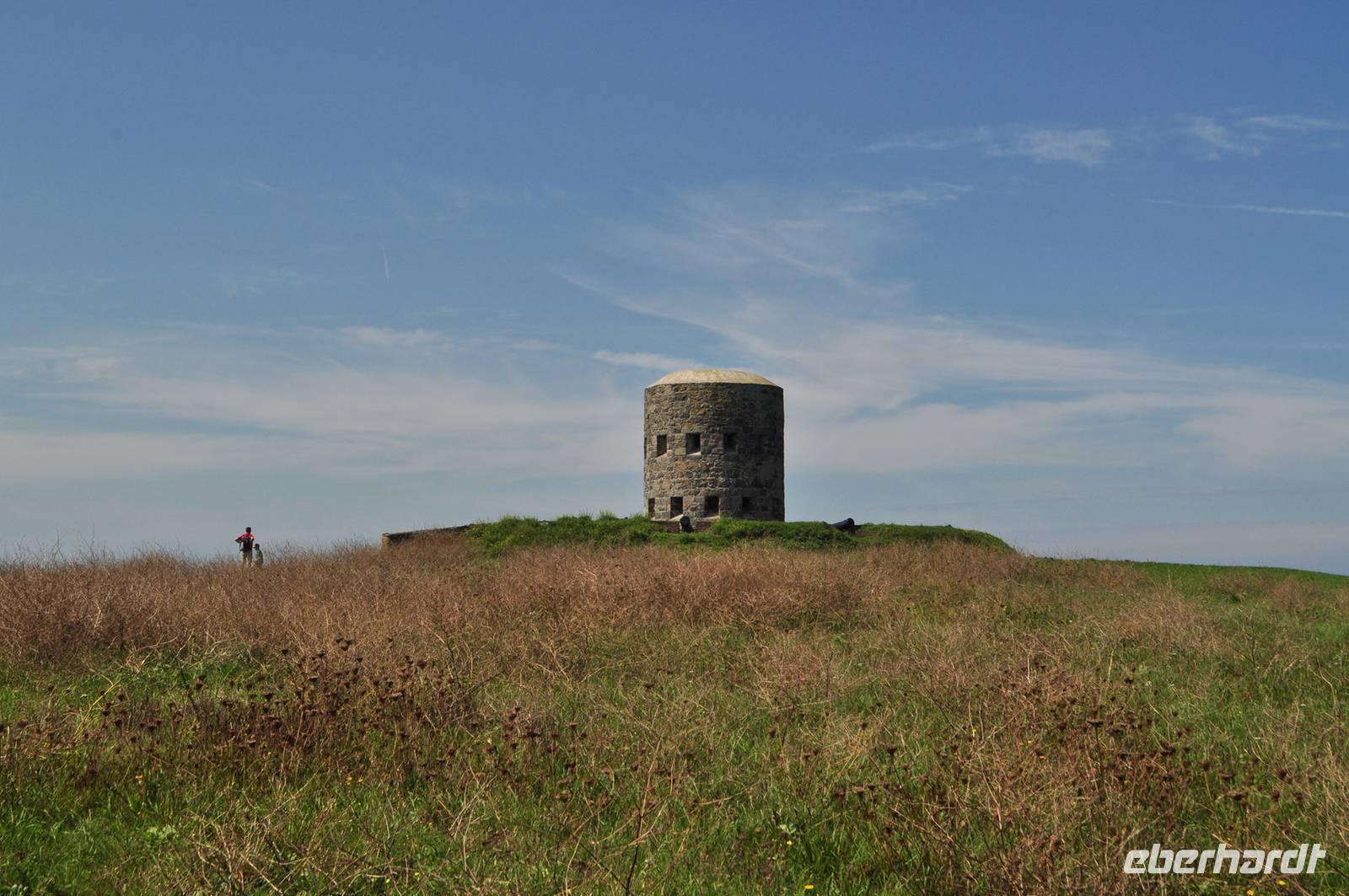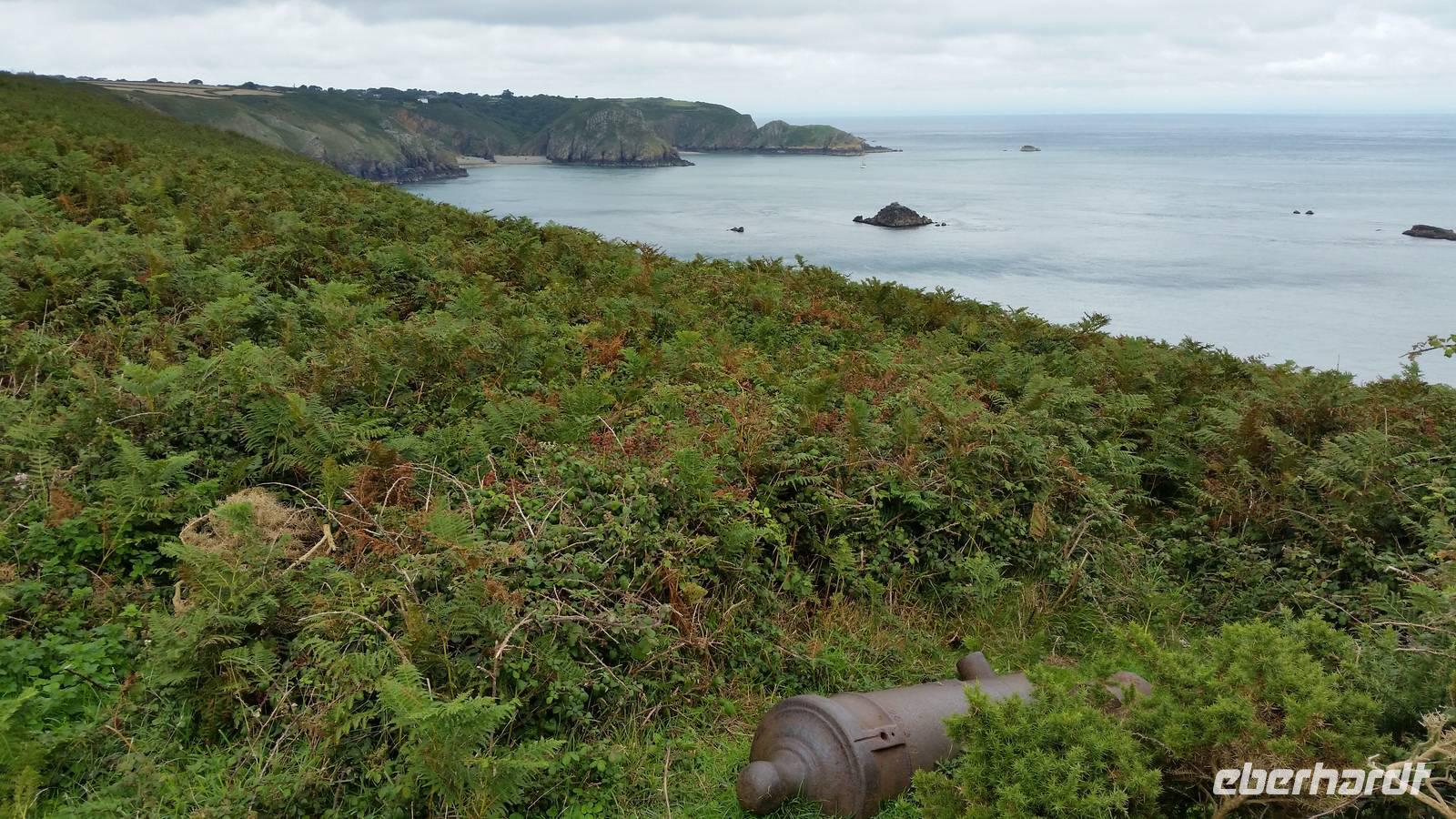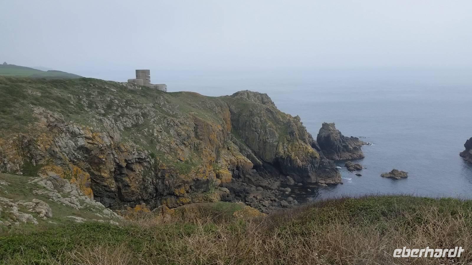 Aufgrund einsetzender Flut verzichten wir auf einen Spaziergang zur Insel Lihou. Sie ist nur bei Ebbe zu erreichen. Bis zum Fort Grey verlief unsere Etappe sanft entlang der vielen Buchten. Die Topographie sollte sich von nun an ändern. Der Radweg führt steil bergauf, so dass wir unser Rad lieben und schieben. Belohnt werden wir mit einer Aussicht über die Nordküste Guernseys. Einsetzender Nebel erlaubt uns jedoch keine Fernsicht. Überrascht sind wir von den riesigen Ausmaßen der Batterie General Oberst Dollmann. Zunächst völlig unscheinbar erschließt sich uns das Ausmaß dieser Anlage. Eine scheinbar kleine Kanone entpuppt sich als riesiges Geschütz samt weitläufiger unterirdischer Bunkeranlagen.
