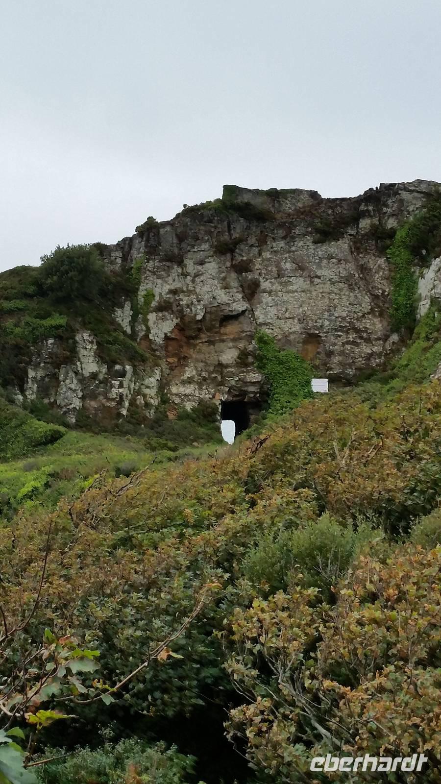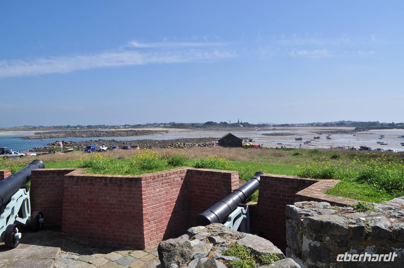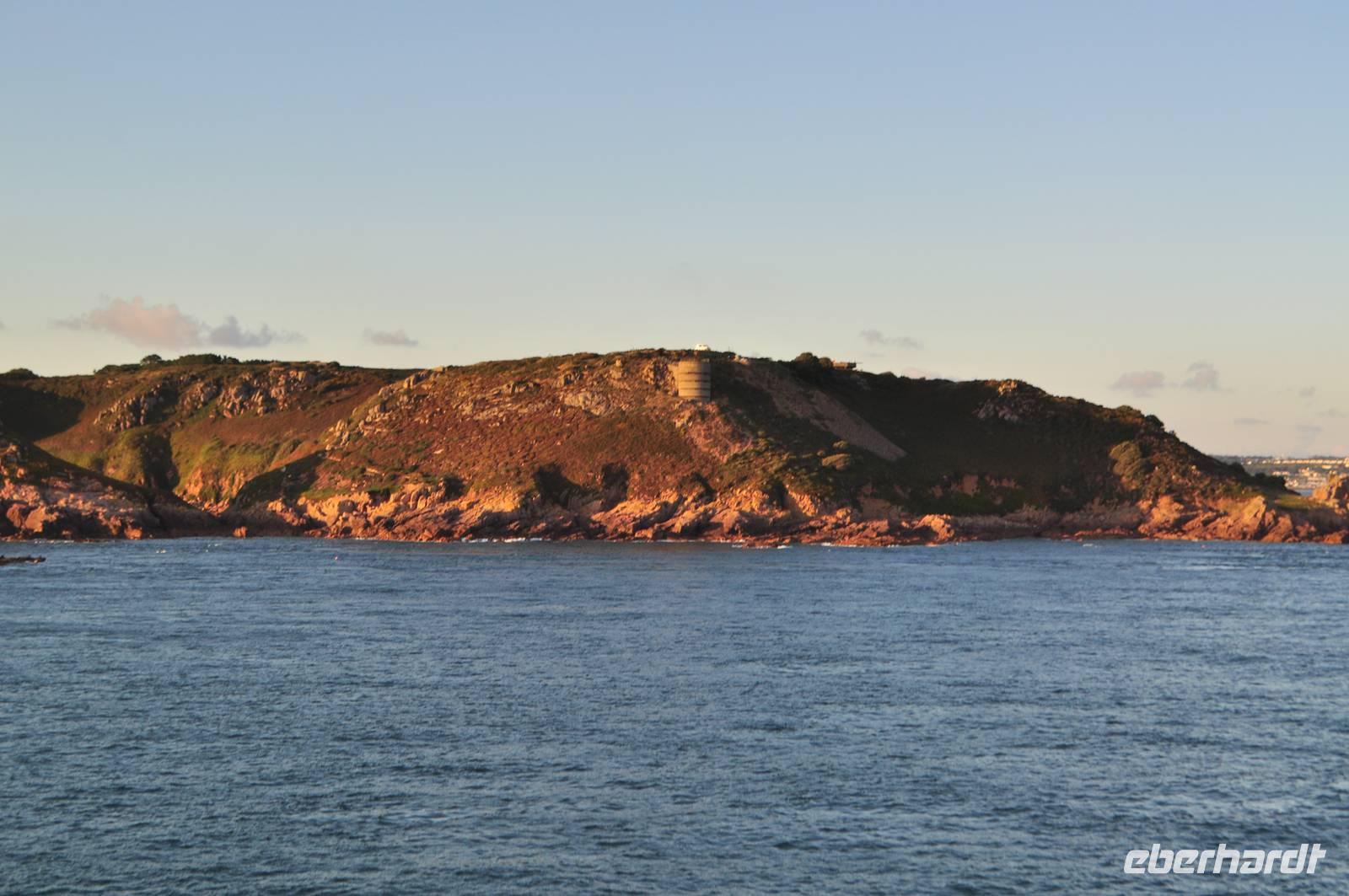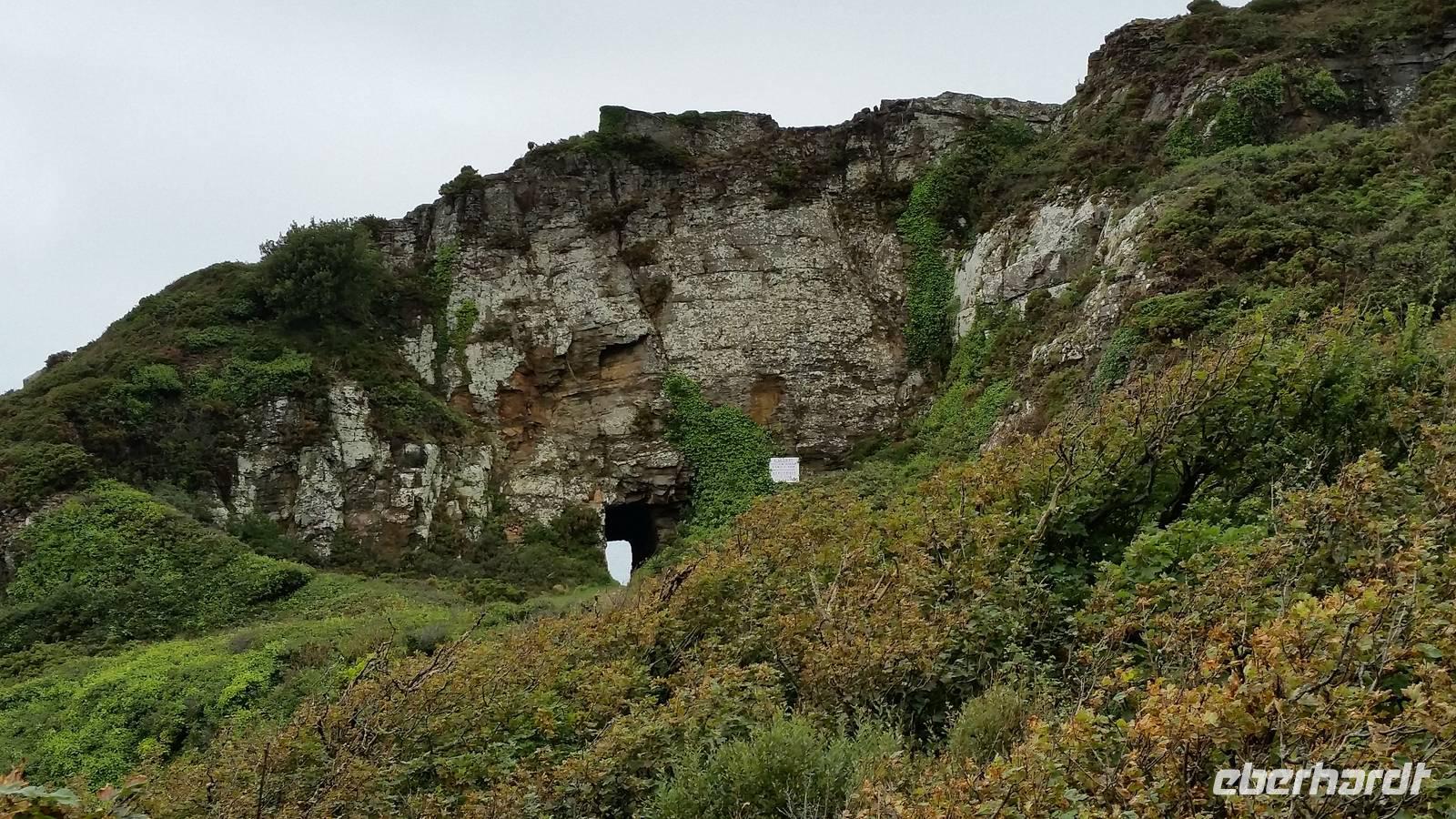 Aufgrund einsetzender Flut verzichten wir auf einen Spaziergang zur Insel Lihou. Sie ist nur bei Ebbe zu erreichen. Bis zum Fort Grey verlief unsere Etappe sanft entlang der vielen Buchten. Die Topographie sollte sich von nun an ändern. Der Radweg führt steil bergauf, so dass wir unser Rad lieben und schieben. Belohnt werden wir mit einer Aussicht über die Nordküste Guernseys. Einsetzender Nebel erlaubt uns jedoch keine Fernsicht. Überrascht sind wir von den riesigen Ausmaßen der Batterie General Oberst Dollmann. Zunächst völlig unscheinbar erschließt sich uns das Ausmaß dieser Anlage. Eine scheinbar kleine Kanone entpuppt sich als riesiges Geschütz samt weitläufiger unterirdischer Bunkeranlagen.