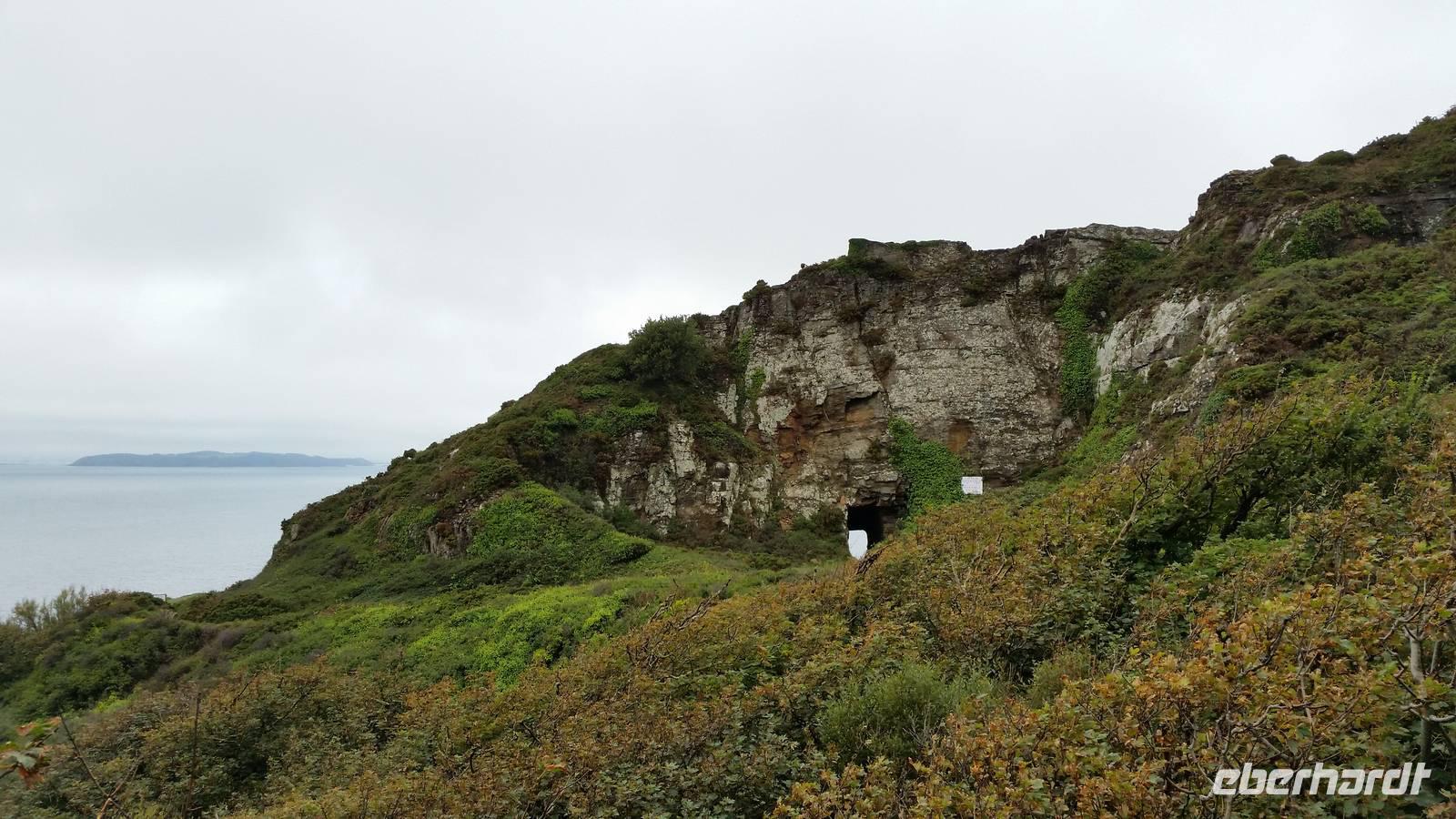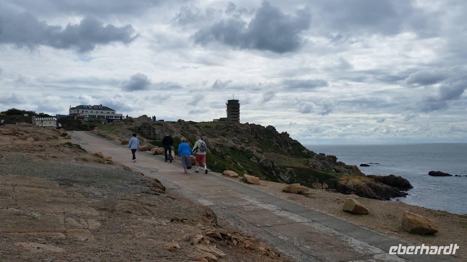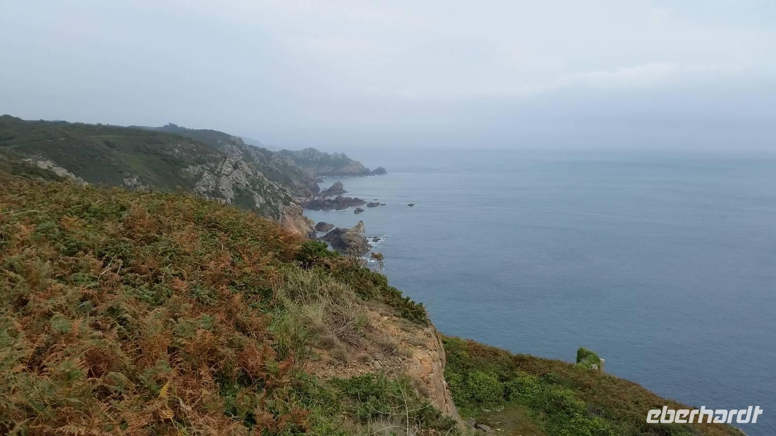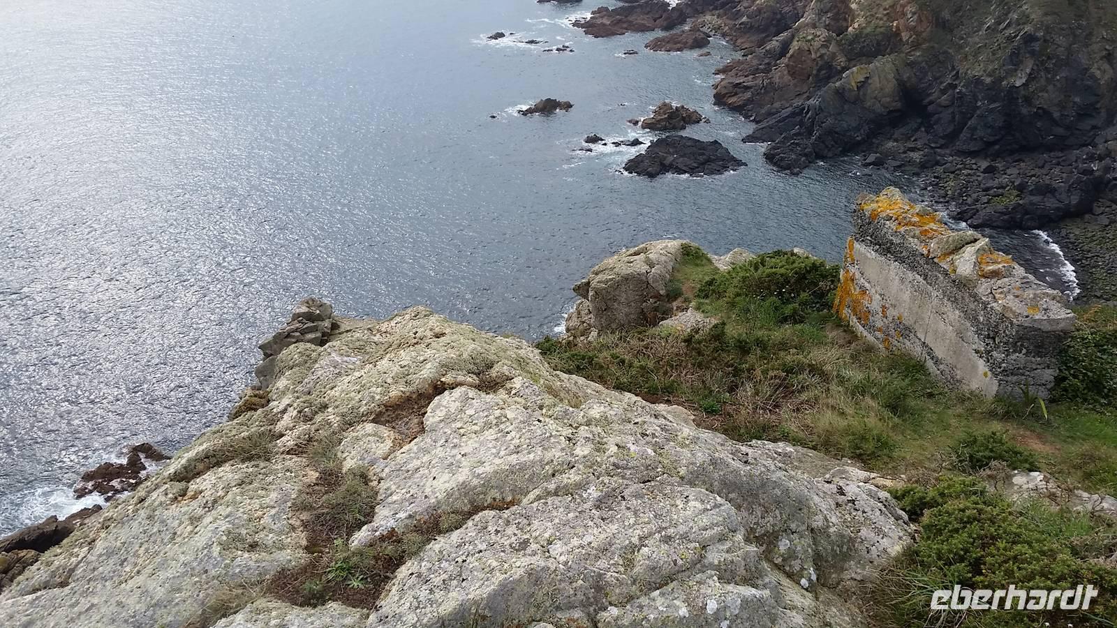 Aufgrund einsetzender Flut verzichten wir auf einen Spaziergang zur Insel Lihou. Sie ist nur bei Ebbe zu erreichen. Bis zum Fort Grey verlief unsere Etappe sanft entlang der vielen Buchten. Die Topographie sollte sich von nun an ändern. Der Radweg führt steil bergauf, so dass wir unser Rad lieben und schieben. Belohnt werden wir mit einer Aussicht über die Nordküste Guernseys. Einsetzender Nebel erlaubt uns jedoch keine Fernsicht. Überrascht sind wir von den riesigen Ausmaßen der Batterie General Oberst Dollmann. Zunächst völlig unscheinbar erschließt sich uns das Ausmaß dieser Anlage. Eine scheinbar kleine Kanone entpuppt sich als riesiges Geschütz samt weitläufiger unterirdischer Bunkeranlagen.