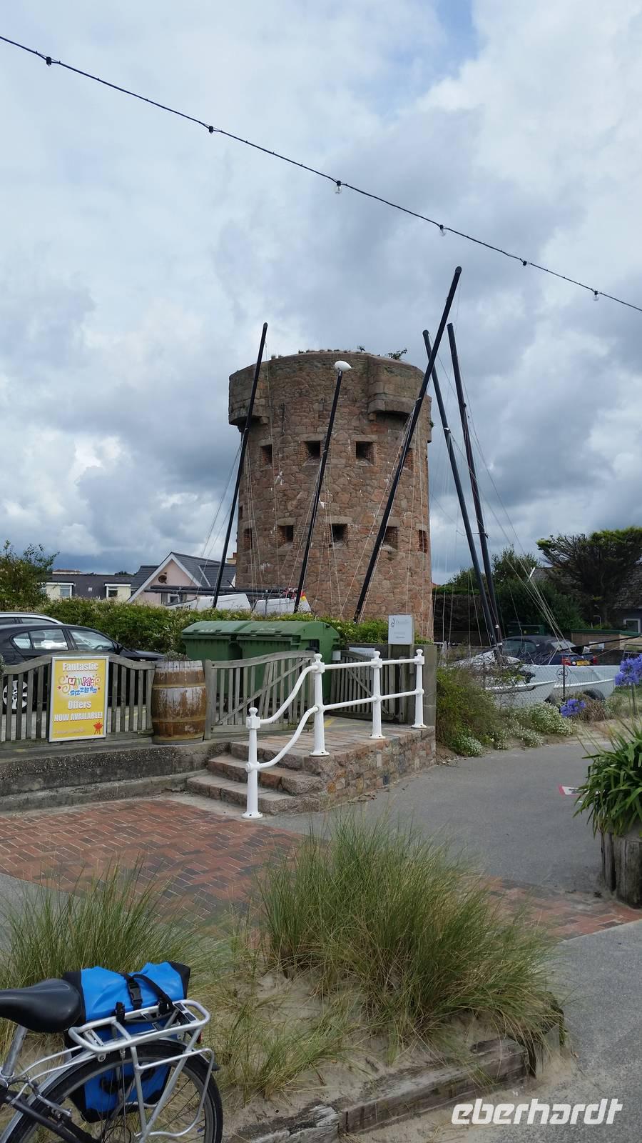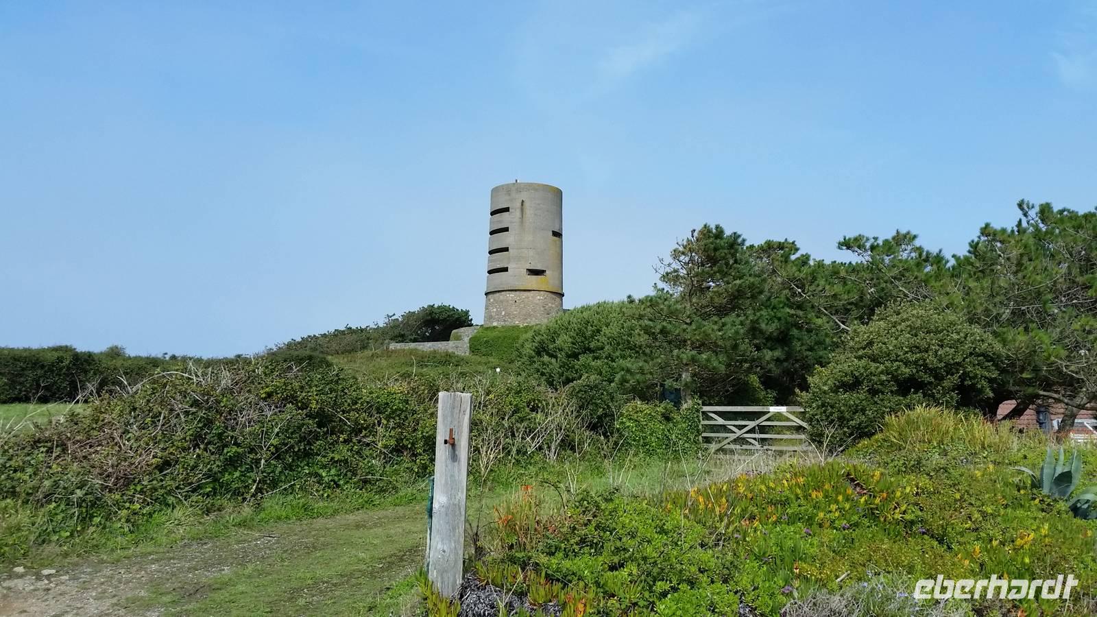 Unweit entfernt liegt die „Beaucette Marina", hier sollte innerhalb weniger Wochen ein neues Hafenbecken angelegt werden. Das Gestein erwies sich jedoch also so hart, dass nur eine schmale Einfahrt in ein kleines Hafenbecken angelegt werden konnten. Heute wird die Marina von Freizeitkapitänen genutzt. Am Millennium Stone vorbei geht es immer entlang der traumhaften Nordküste unsere ständigen Begleiter sind die vielen Guernsey Rundtürme. Am Turm Nummer 11 machen wir in der herrlichen Sonne eine Eis Pause. Wer Lust hat kann Turm Nummer 11 samt zugehöriger Anlagen besichtigen. Entlang weiterer schöner Sandbuchten erreichen wir den