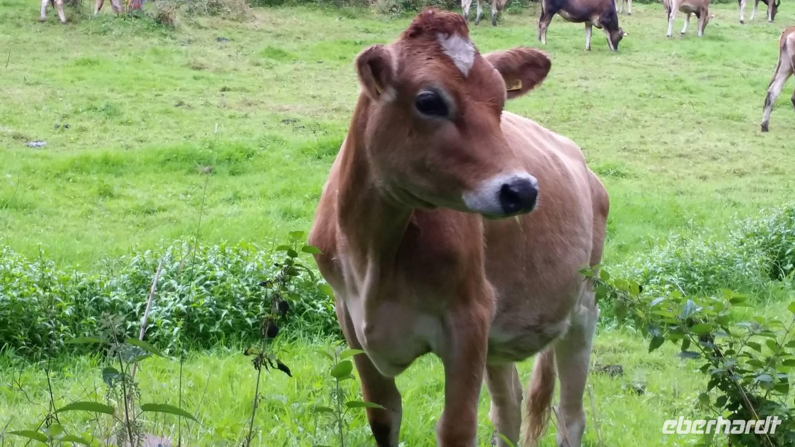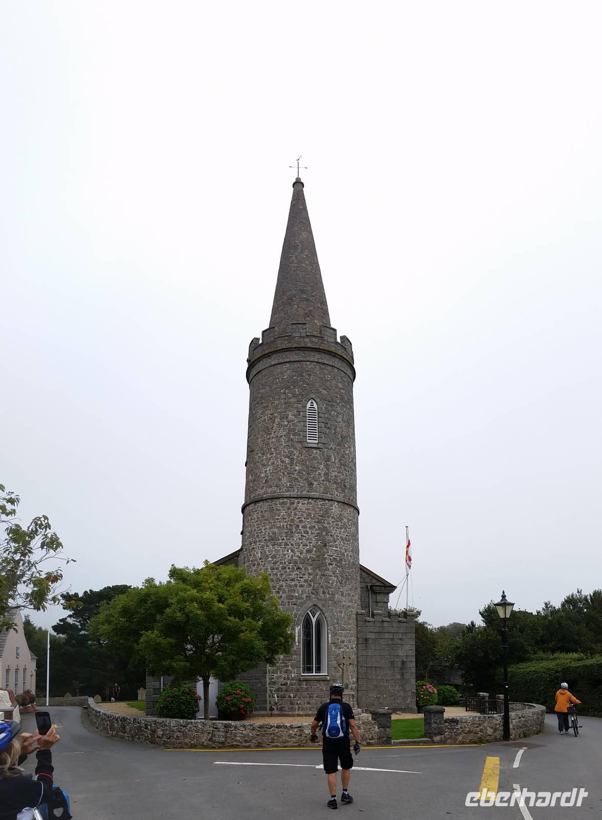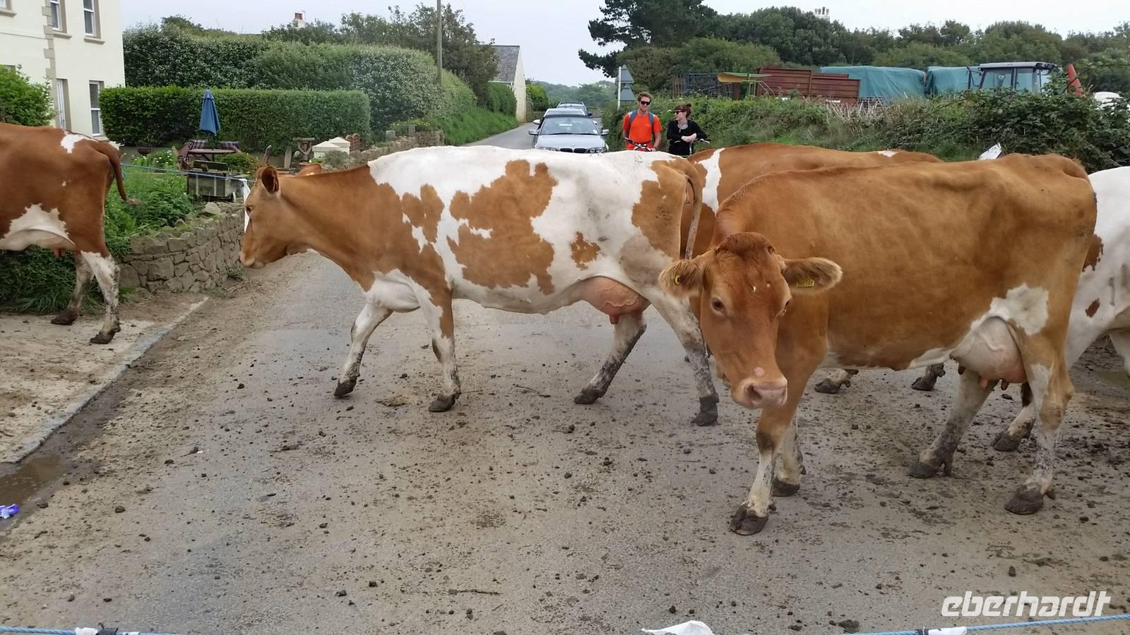 Unmittelbar vor der Torteval Church mit dem markanten säulenförmigen Turm samt Spitzkegelhaube wird unsere Fahrt unterbrochen. Die Straße ist abgesperrt. Emma, Berta & Co. aus der Familie der Guernsey-Kühe wollen nach Hause. Die Straße wird abgesperrt bis auch die letzte Kuh ihren Weg nach Hause gefunden hat.
