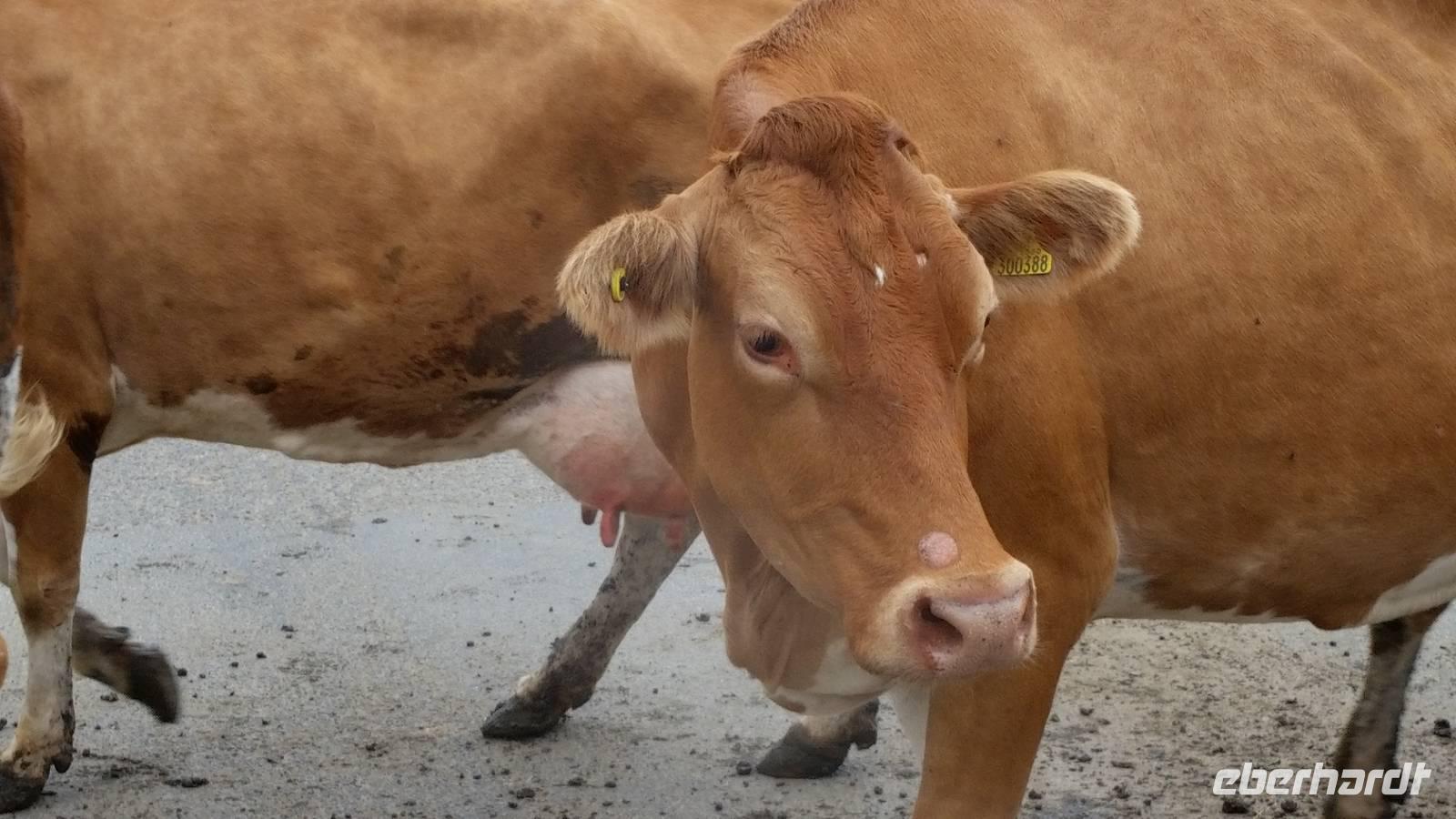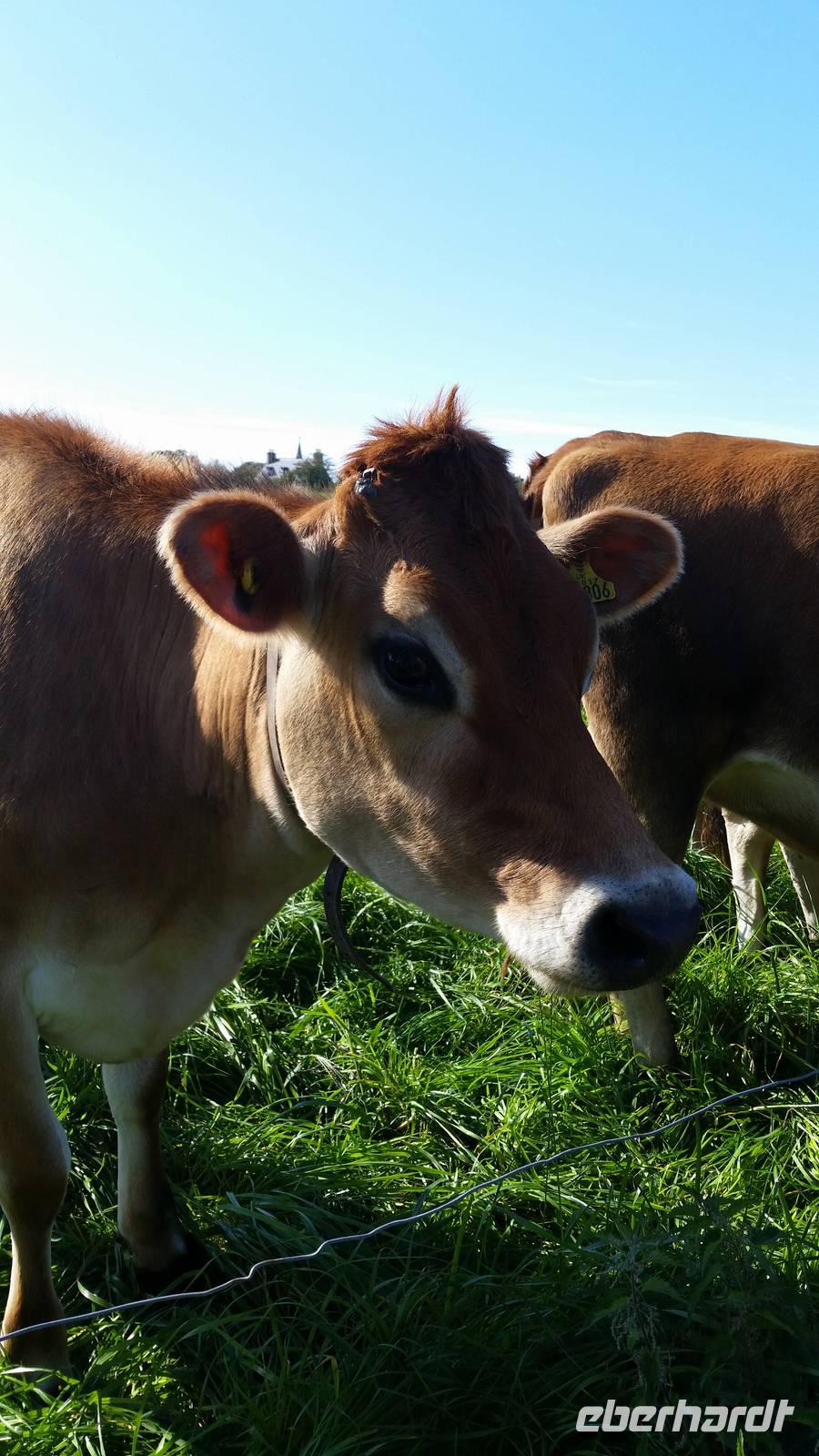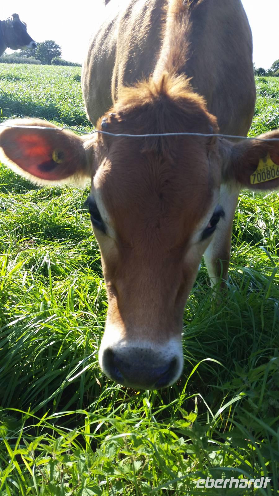 Unmittelbar vor der Torteval Church mit dem markanten säulenförmigen Turm samt Spitzkegelhaube wird unsere Fahrt unterbrochen. Die Straße ist abgesperrt. Emma, Berta & Co. aus der Familie der Guernsey-Kühe wollen nach Hause. Die Straße wird abgesperrt bis auch die letzte Kuh ihren Weg nach Hause gefunden hat.