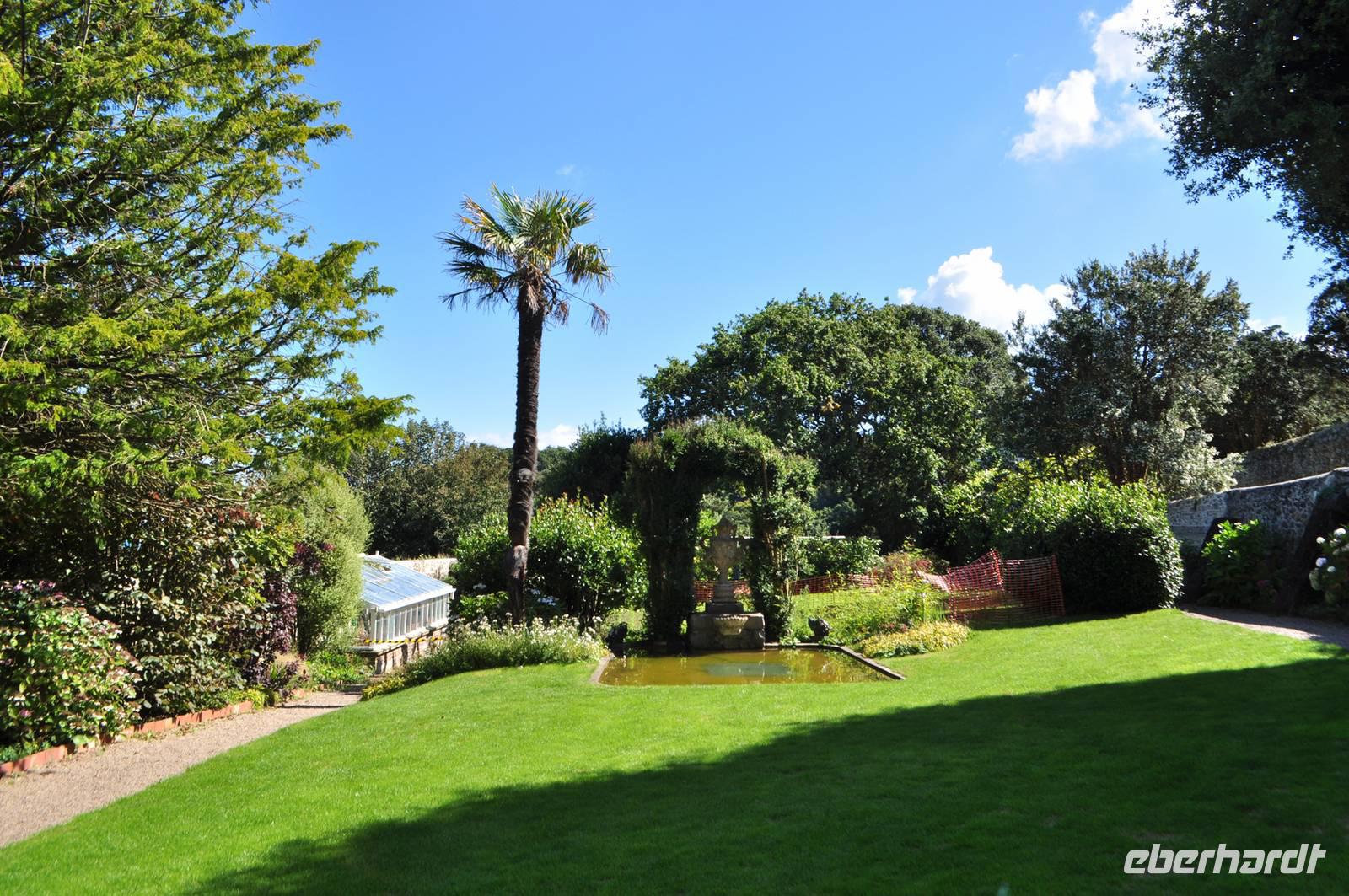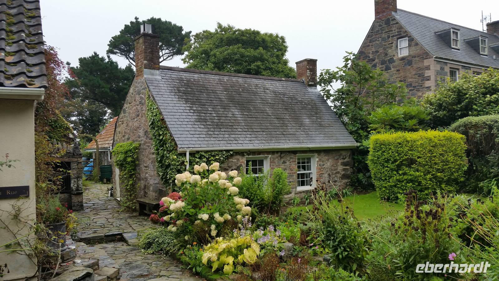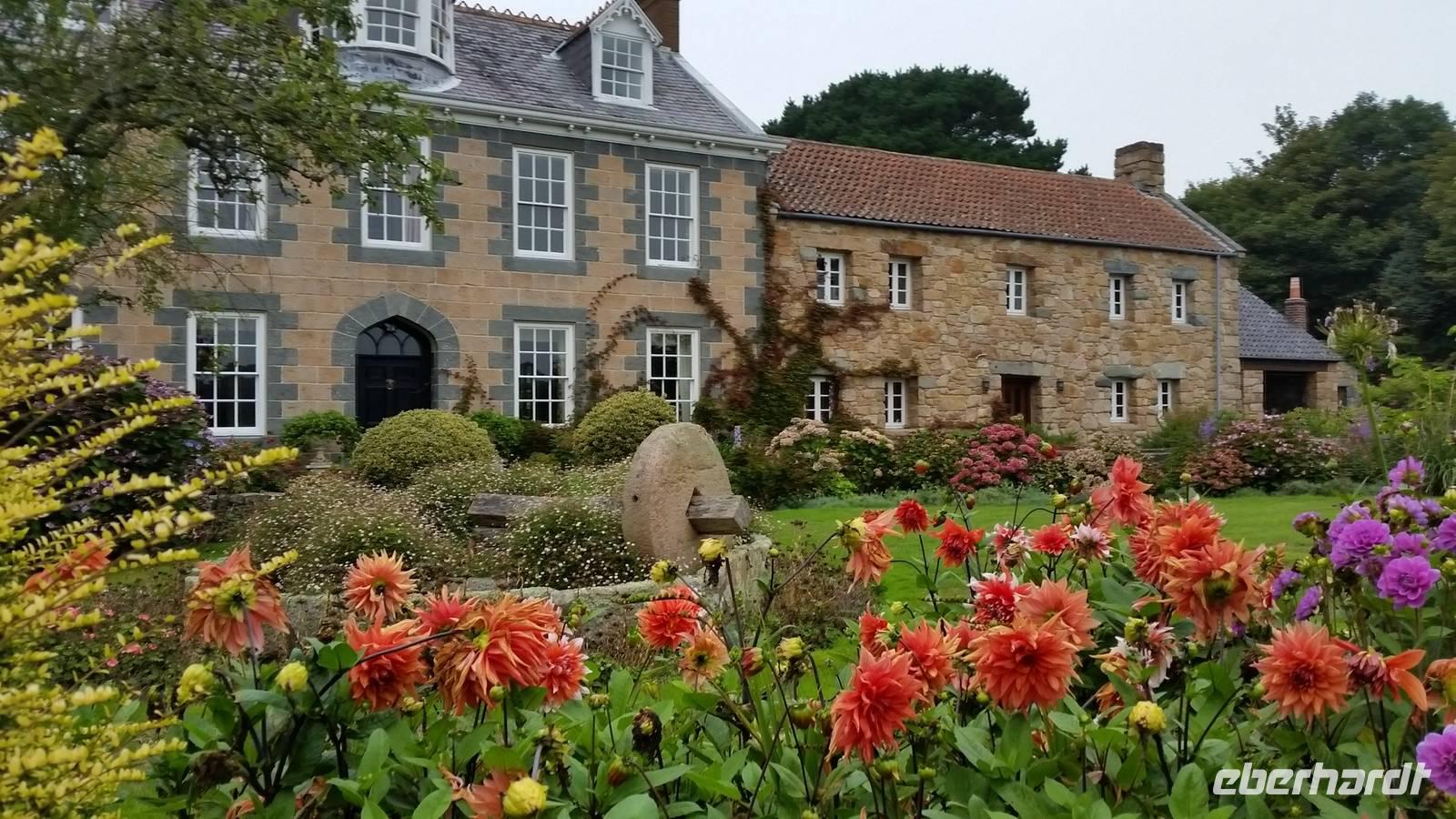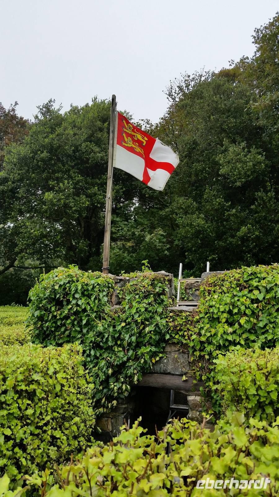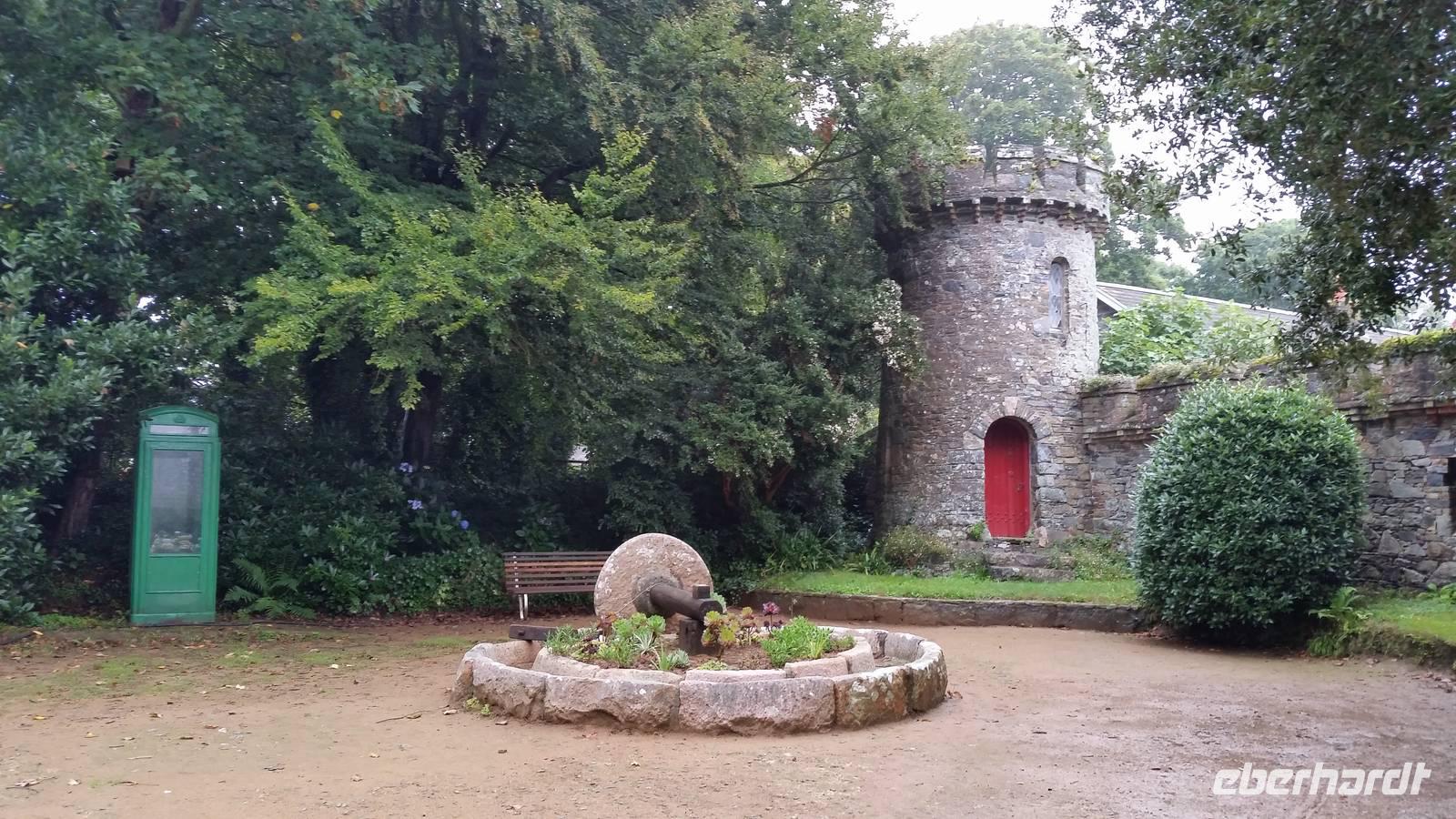 Anschließend wandern wir zur nahegelegenen La Seigneurie, dem Herrenhaus der Insel. Das Gebäude selbst ist nicht zugänglich, dafür die wunderschönen Gärten. Ein Muss für jeden Sark Besucher. Das Gelände erreichen wir über einen Nebeneingang. Dort befindet sich eine historische grüne Telefonzelle samt historischen hölzernen Telefon. Direkt daneben liegt der Taubenturm. Nur dem Seigneur war es traditionell gestattet Tauben zu züchten. Der gut gepflegte Garten entspricht allen Regeln der englischen Gartenkunst und steht auch im September noch in Blüte. Spannend ist der angelegte Irrgarten. Wer den richtigen Weg findet, findet vielleicht den Schatz.