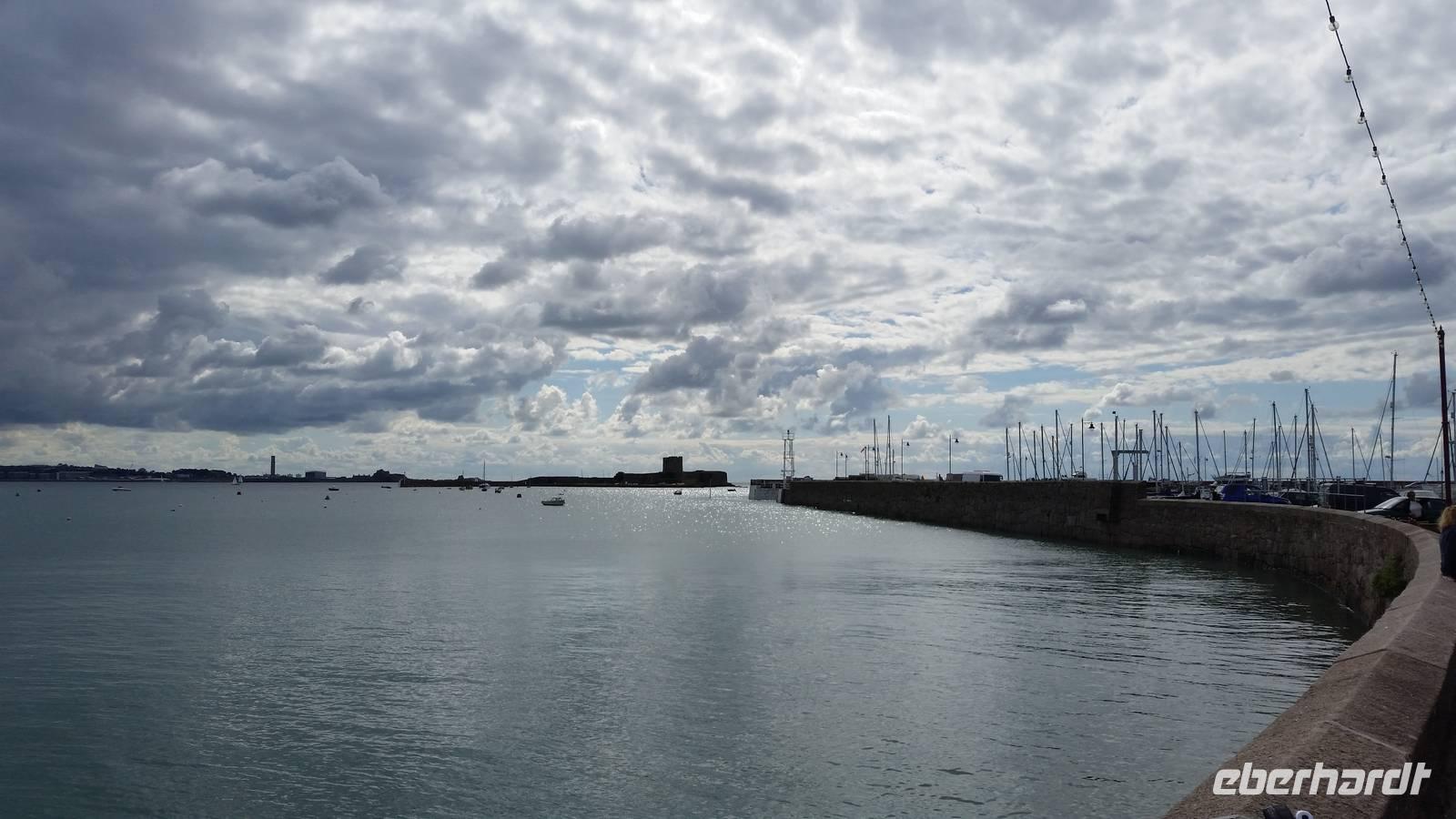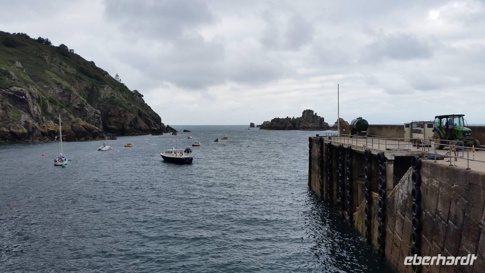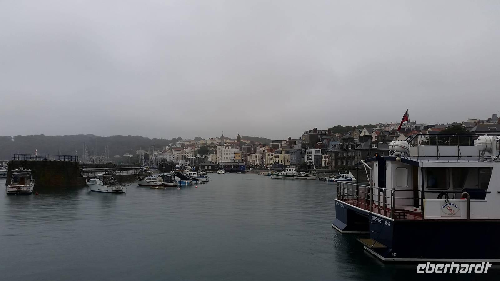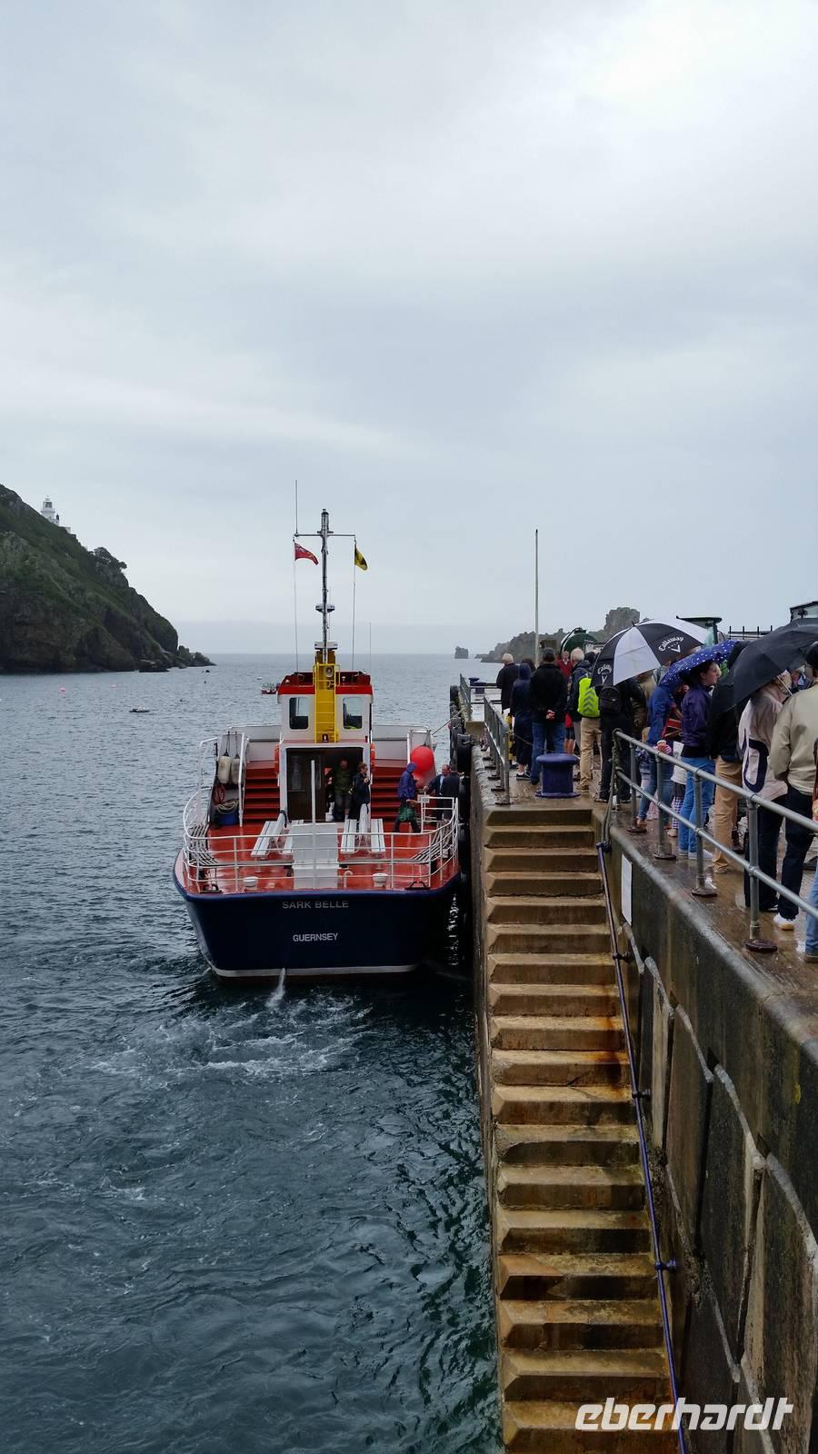 Bei starkem Regen begeben wir uns zum Schiffsanleger in St Peter Port. Heute ist einer der wenigen inoffiziellen Feiertage im Vereinigten Königreich (Bank Holiday). Im Hafen haben einige Händler ihre Marktbuden aufgeschlagen mit einigen Köstlichkeiten von den Kanalinseln und aus dem nahen Frankreich. Mit einem kleinen Schiff geht es vorbei an der Insel Herm zur Insel Sark.
