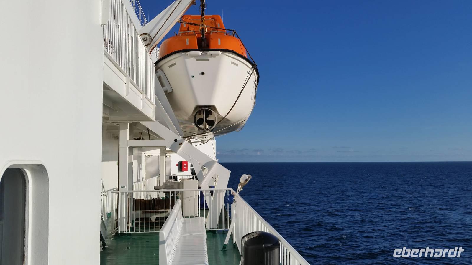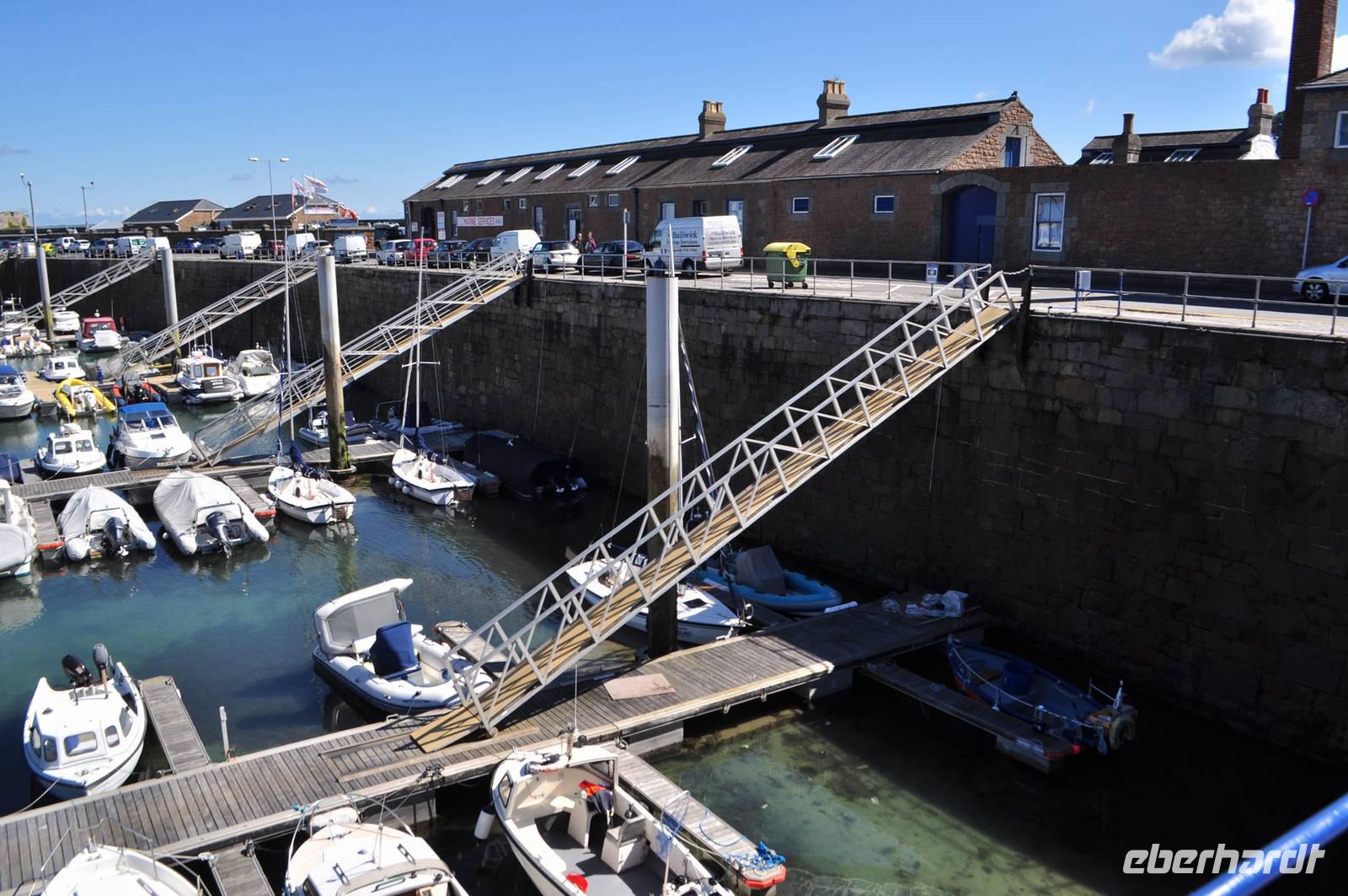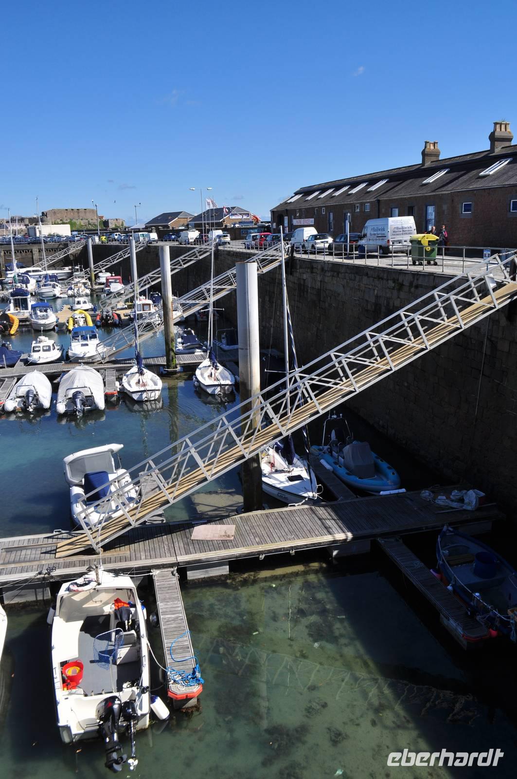Am Nachmittag werden wir samt Gepäck von unserem Transfer abgeholt und zum Fähranleger gebracht. Am späten Nachmittag geht es mit der konventionellen Fähre nach Jersey. Die extreme Tide macht das Beladen des Schiffes schwierig. Selbst die Fußpassagiere ohne Fahrzeug werden mit Kleintransportern auf das Schiff gefahren.
