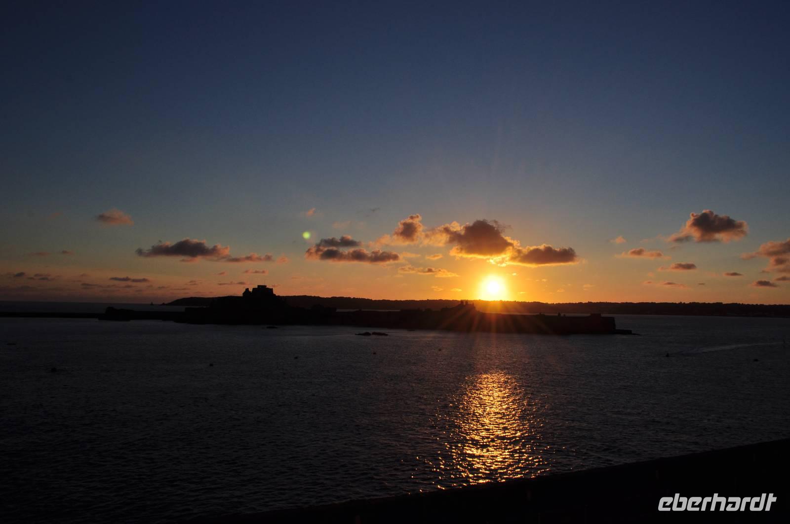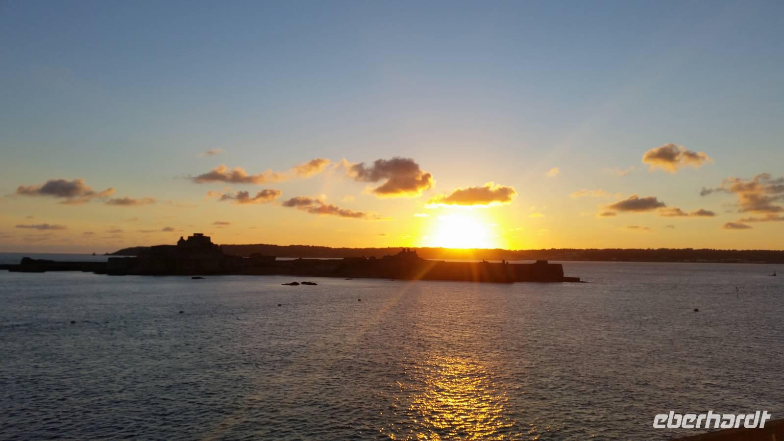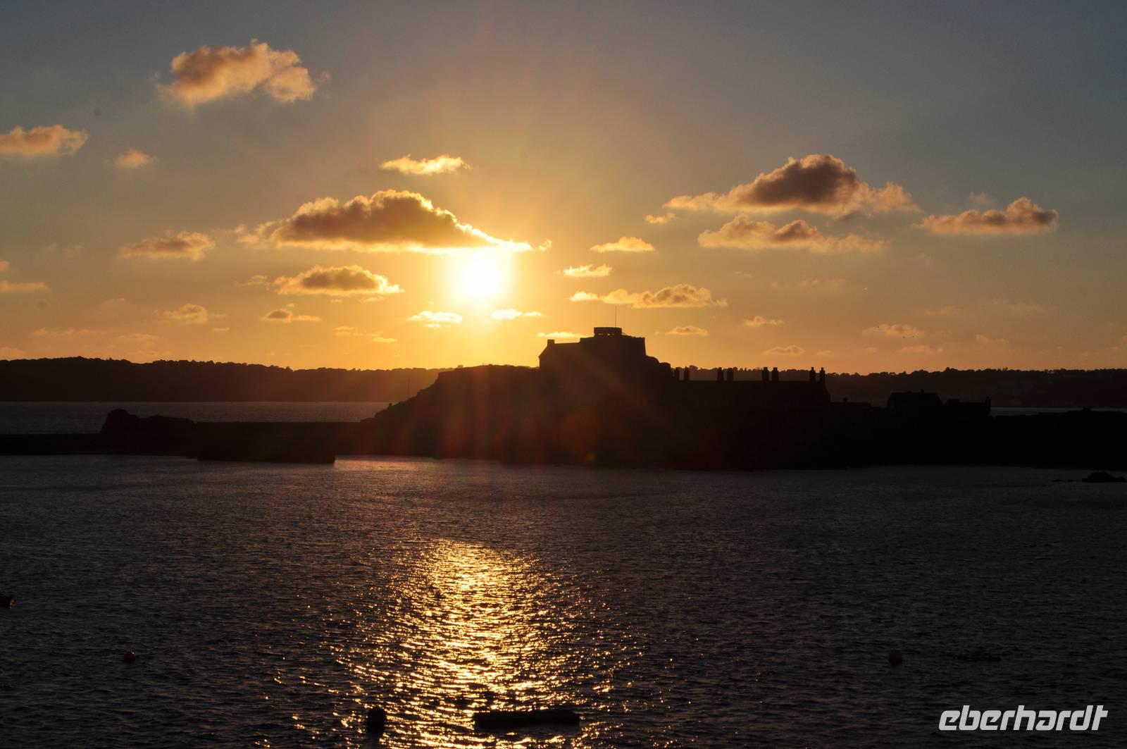 Bei herrlichem Wetter verlassen wir Guernsey, passieren Herm und Sark und erreichen Jersey im Sonnenuntergang. Heidi von Special Tours chauffiert uns zu unserem nahe gelegenen Hotel. Am Abend erleben wir die höchste Tide des Jahres 2015 mit über 12m und damit ca. 3m über der normalen Flut. Glücklicherweise ist das Wetter gut, so dass aus der Springflut keine Sturmflut wird. Das wäre heute ein echtes Problem für die Inseln. Aber das Wetter ist gut, alle haben Spaß an diesem Naturphänomen.