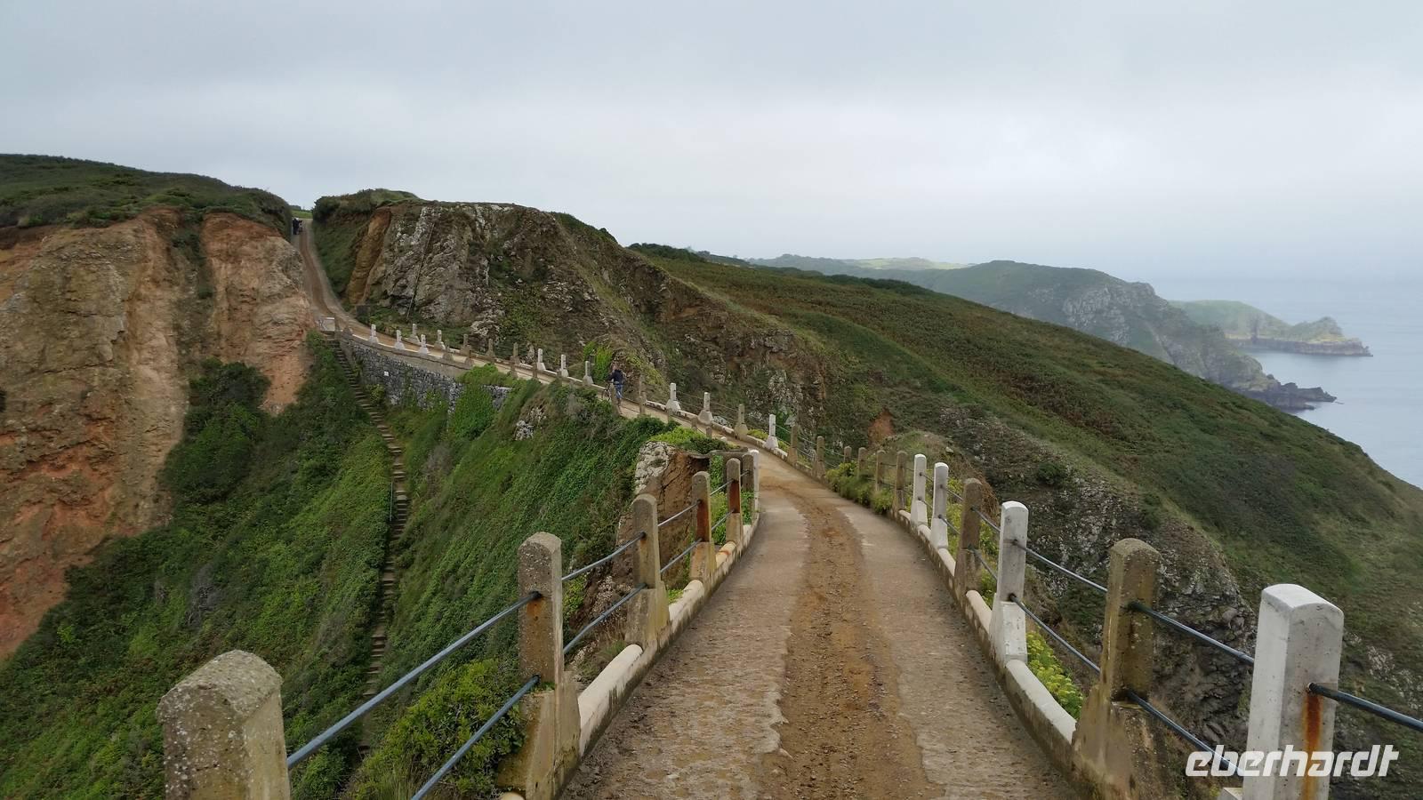 Entlang der Nordküste radeln wir wieder nach Osten. Es folgt eine steile Abfahrt zum kleinen