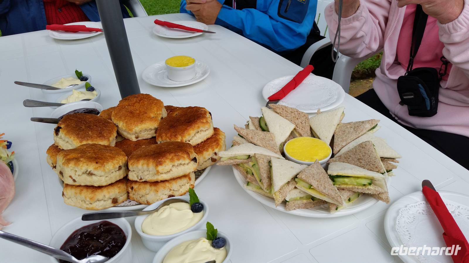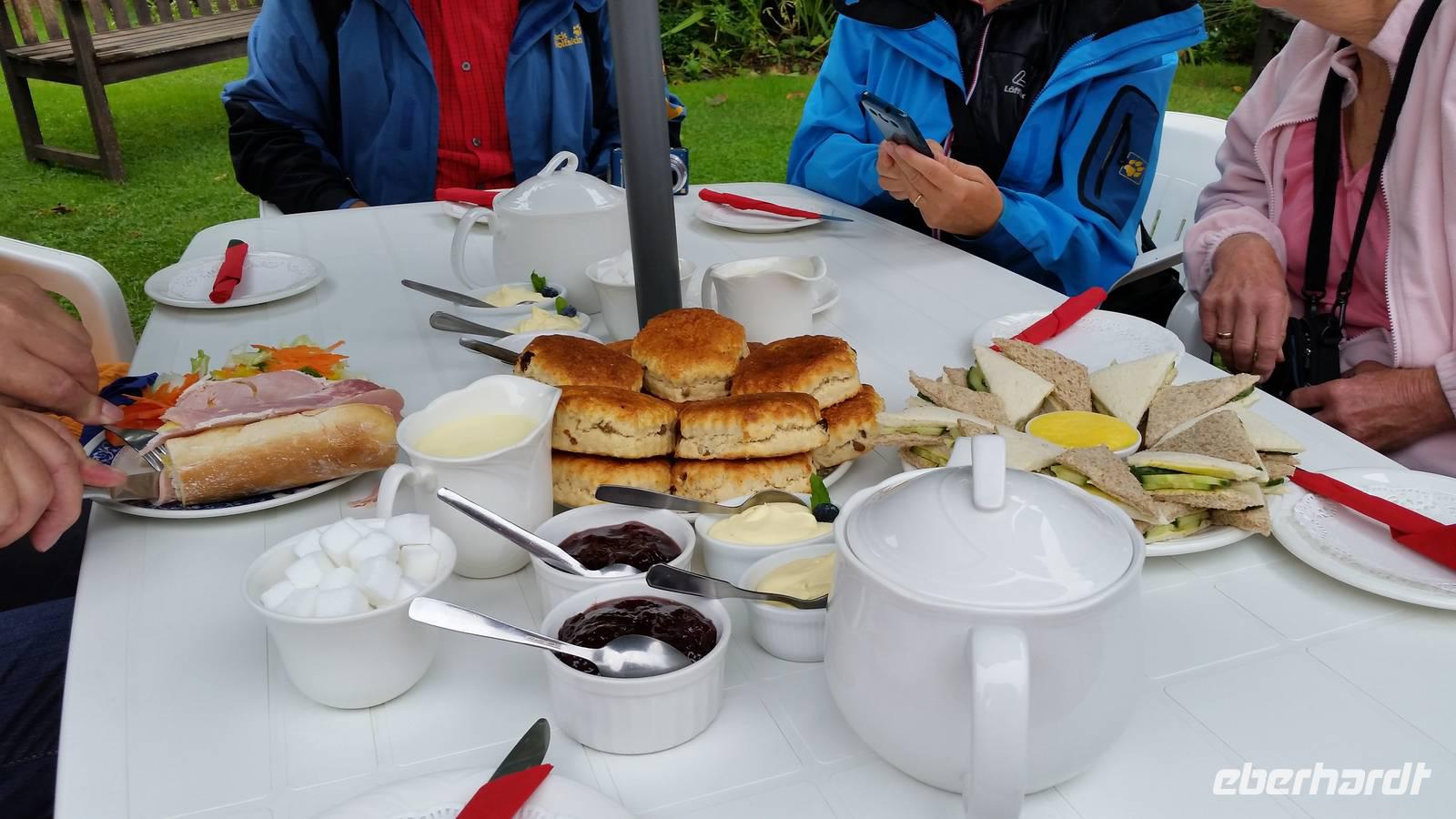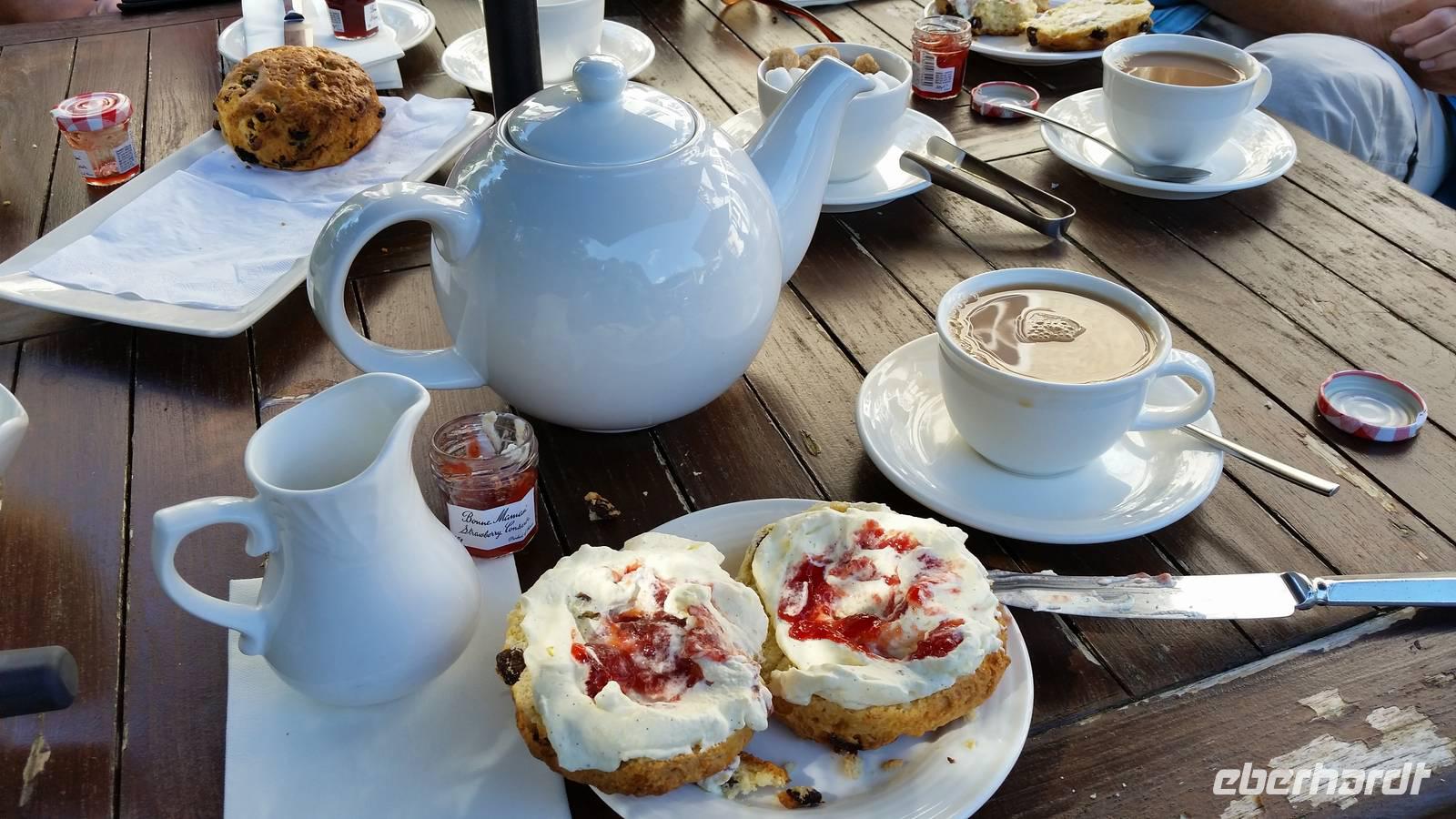 Auf Little Sark angekommen ist es Zeit sich zu stärken. Im „Tea Garden" genießen wir einen typischen Cream Tea, natürlich mit Tee, den traditionellen selbstgebackenen Scones mit Butter, Erdbeermarmelade und Clotted Cream. Ein Hochgenuss! Wir sind uns einig, ein Cream Tea ersetzt jede Mittagspause, erst recht wenn noch ein Teller Sandwiches dazu gereicht wird.