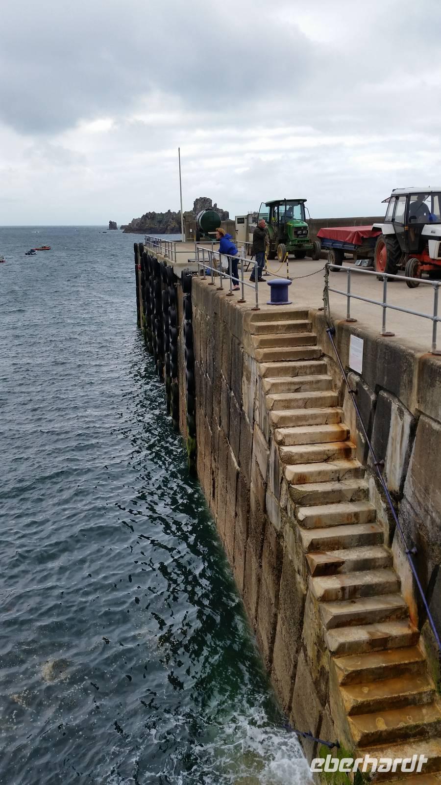 Während Jersey und Guernsey bedingt durch die angesiedelte Finanzindustrie mit ihren vielen wohlhabenden Mitarbeitern sehr moderne Erscheinungsbilderaufweisen (inkl. Tennis- und Golf- und Jachtplätzen) befindet sich Sark noch in einer ganz anderen Zeit. Seit 1.000 Jahren hat sich nicht viel verändert. Das galt zu Mindest bis in das Jahr 2008. Seit der Ansiedlung der beiden milliardenschweren Barclay-Brüder steht dieses Eiland Kopf. Auf etwas undurchsichtige Weise gelang es den Brüdern Eigentümer eines Stück Landes zu werden, ein Teil der Insel Sark. Eigentümer, genau darin liegt das Problem. Eigentlich ist es nicht möglich auf Sark Eigentum zu erwerben, denn hier herrschte mittelalterliches Feudalrecht, bei dem der Seigneur direkt vom Britischen Monarchen als Vasall sein Lehen empfängt und es an weitere 40 Vasallen als Lehen vergibt. Die gesamte Insel ist Kronbesitz des Britischen Monarchen. Die beiden Barclay Brüder klagten erfolgreich vor dem europäischen Gerichtshof?! Genau solche britische Staatsbürger die am liebsten aus der EU austreten möchten. Mit diesem Gerichtsurteil wurde alles anders, die Brüder begannen Macht auf der Insel auszuüben. Sie kauften Grundstücke, Läden, Infrastruktur von den Insulanern ab. Eigentümer wurden nun zu Angestellten, in nicht immer rosigen Zeiten für die Insulaner sicherlich ein lukrativer Anreiz. Als die Barclay Brüder aber auch die politische Macht im Inselparlament immer mehr für ihre Zwecke zu beeinflussen versuchten begannen die Probleme. Die Barclay Brüder begannen nun gutlaufende und neu renovierte Hotels und Geschäfte zu schließen, die Angestellten verloren ihren Job. Mangels guter Alternativen waren viele Familien gezwungen die Insel zu verlassen. Die über Jahrzehnte stabile Bevölkerungszahl fiel von gut 600 auf nur noch 400. Ziel scheint wohl zu sein, diese schöne Insel zu entvölkern um sie dann wohlhabenderen Steuersparern zur Verfügung zu stellen. Dies sollte erklären, warum wir so viele schöne modernisierte verlassene Gebäude gesehen haben. Ein trauriges Bild. Nichts desto trotz ist Sark noch einmal eine ganz besondere Perle unter den Kanalinseln. Wir haben den ganzen Tag viele Facetten dieser Insel kennenzulernen. Sark verfügt über eine kleine tidenabhängige Kaimauer. Durch einen kurzen Fußgängertunnel erreicht man den Abfahrtplatz für die Traktorengespanne, die Besucher den Berg hinauf ins Dorf bringen.