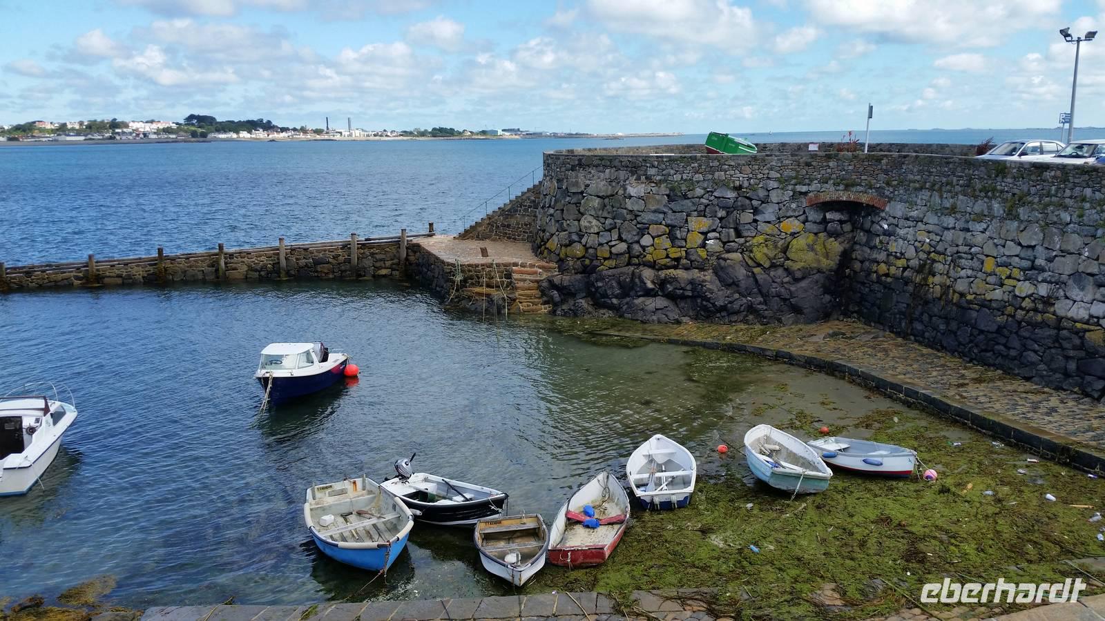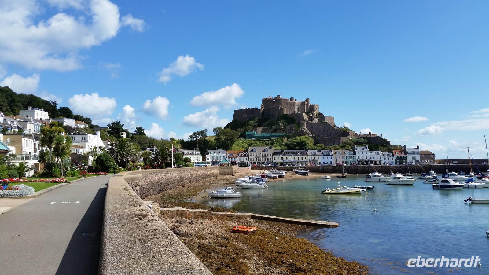 Über die Bucht wacht das mächtige Gorey Castle, auch Mont Orgueil Castle genannt. Die Topographie lässt erahnen, auch wenn wir die Burg nicht besuchen, unser Weg führt bergwärts. Daher heißt es wiederum, wer sein Rad liebt der schiebt. Die sich bietende Aussicht entschädigt für die Anstrengung.
