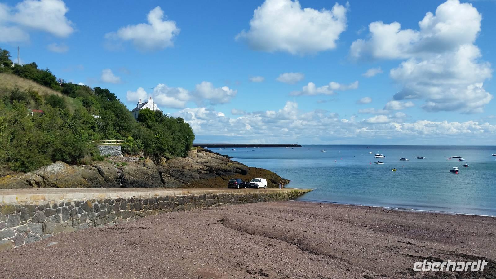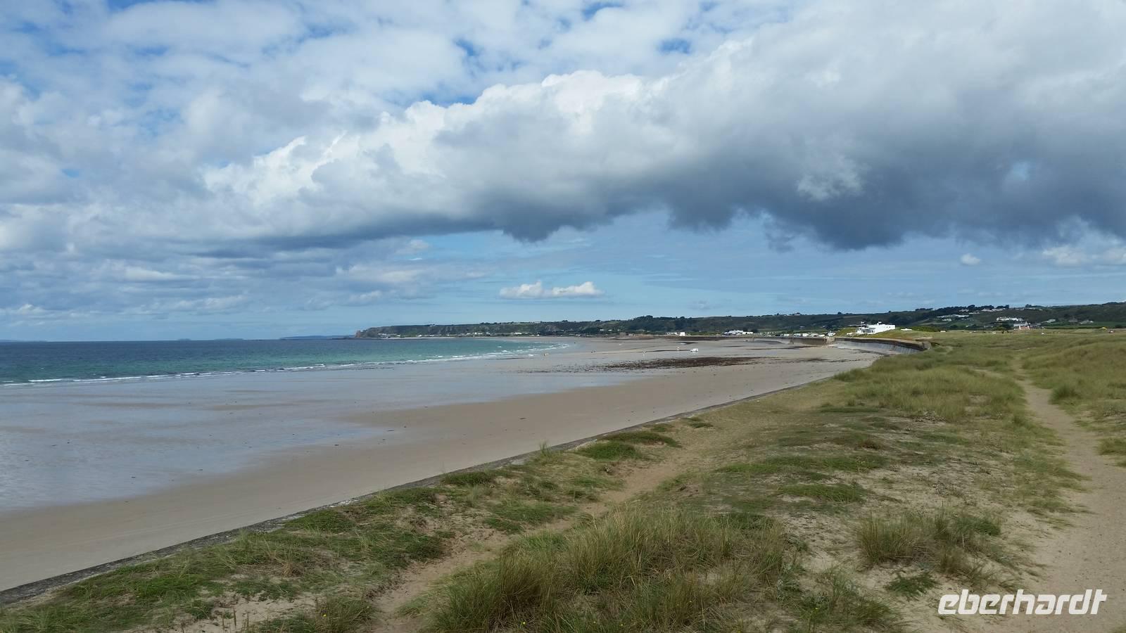 St Helier treffen wir auf die ersten Green Lanes. Auch die ersten kräftigen Anstiege erwarten uns. Ein erster landschaftlicher Höhepunkt ist die Sandbucht von Gorey.