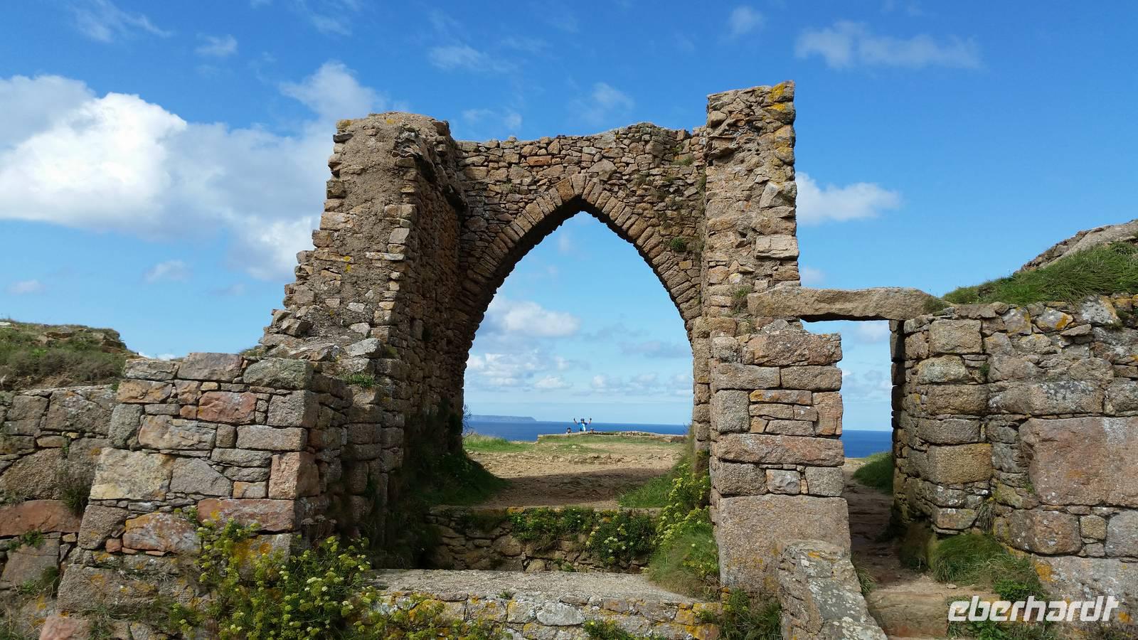 Vom Museum geht es weiter in Richtung Westen in Richtung St. Ouen's Bay. Wir finden, dass es eine wunderschöne Bucht ist, entscheiden aber einstimmig, dass uns die Erinnerung vom Vortag genügt und wir auf die steile Abfahrt und den darauffolgenden steilen Anstieg verzichten. Stattdessen radeln wir entlang wunderschöner Green Lanes in die äußerste Nordwest-Ecke der Insel. Von hier hat man einen wunderschönen Blick auf die anderen Kanalinseln wie Guernsey, Herm und Sark. Hier steht auch die gotische Ruine des Grosnez Castle. Der gotische Bogen ist ein Wahrzeichen der Insel und ist sogar auf der Jersey 50p Münze wiederzufinden.