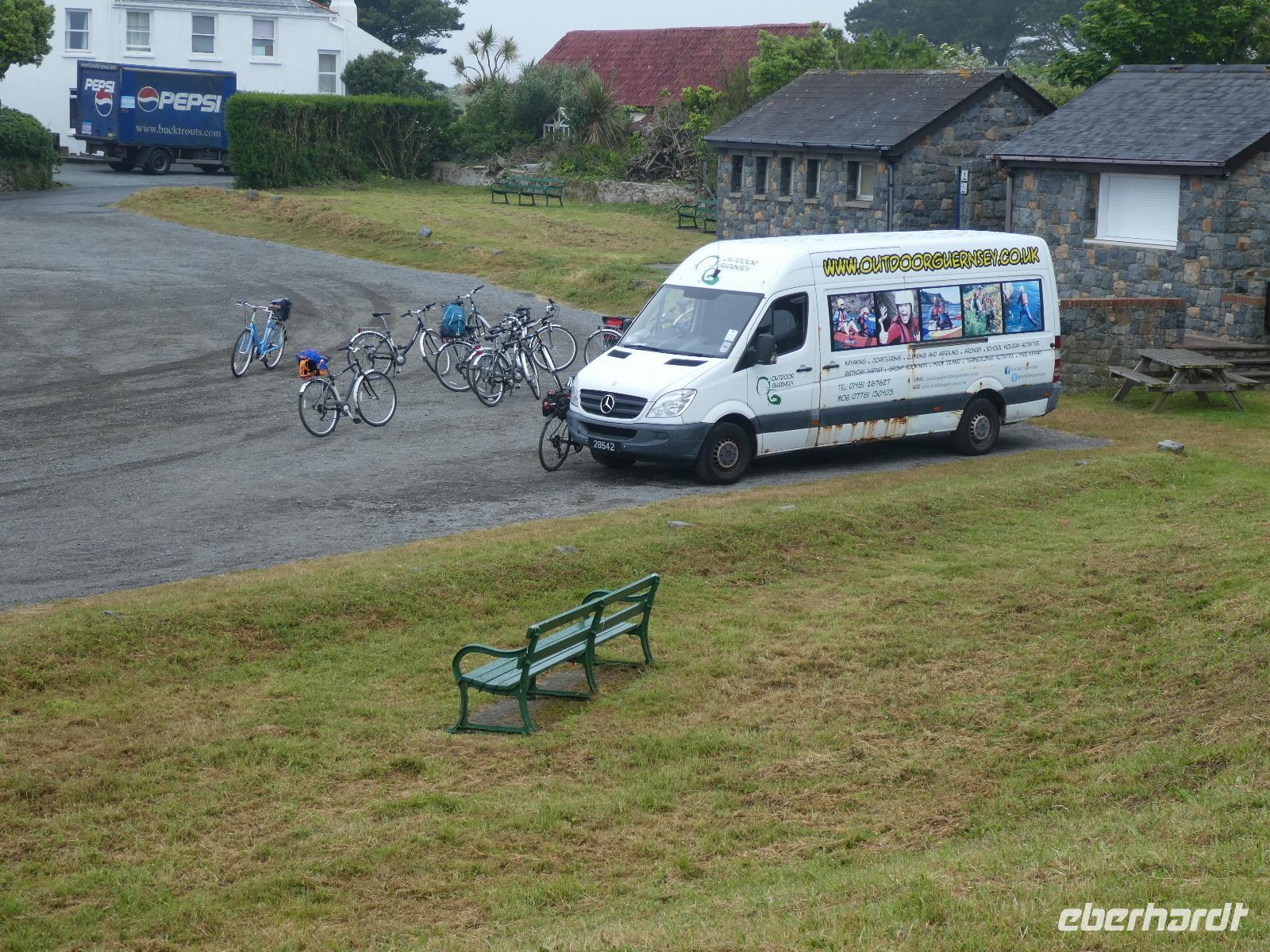 Am frühen Morgen begannen wir unsere Reise erst einmal zum Flughafen Berlin Tegel, wo wir uns zusammenfanden. Nachdem wir unseren Check-In getätigt hatten, ging es mit EasyJet zum Flughafen London Gatwick. Spannend hierbei war, dass wir unsere Koffer vom Gepäckband nehmen und mit diesem aus der Sicherheitszone raus mussten. Dann ging es mit dem Shuttle in das nächste Terminal. Mit ein paar Stunden Aufenthalt in London ging es mit einer kleinen Propellermaschine der Airline „Aurigny Air", welche eine regionale Fluggesellschaft mit Sitz auf Guernsey ist, weiter auf die Kanalinsel Guernsey. Auf dem Flughafen von Guernsey angekommen wartete bereits Ant auf uns, welcher uns zum Hotel nach St. Peter Port fuhr. Wir ließen den Abend bei einer netten Plauschrunde am Abendessenstisch ausklingen und freuten uns bereits auf den ersten Radtag der Kanalinsel Guernsey.