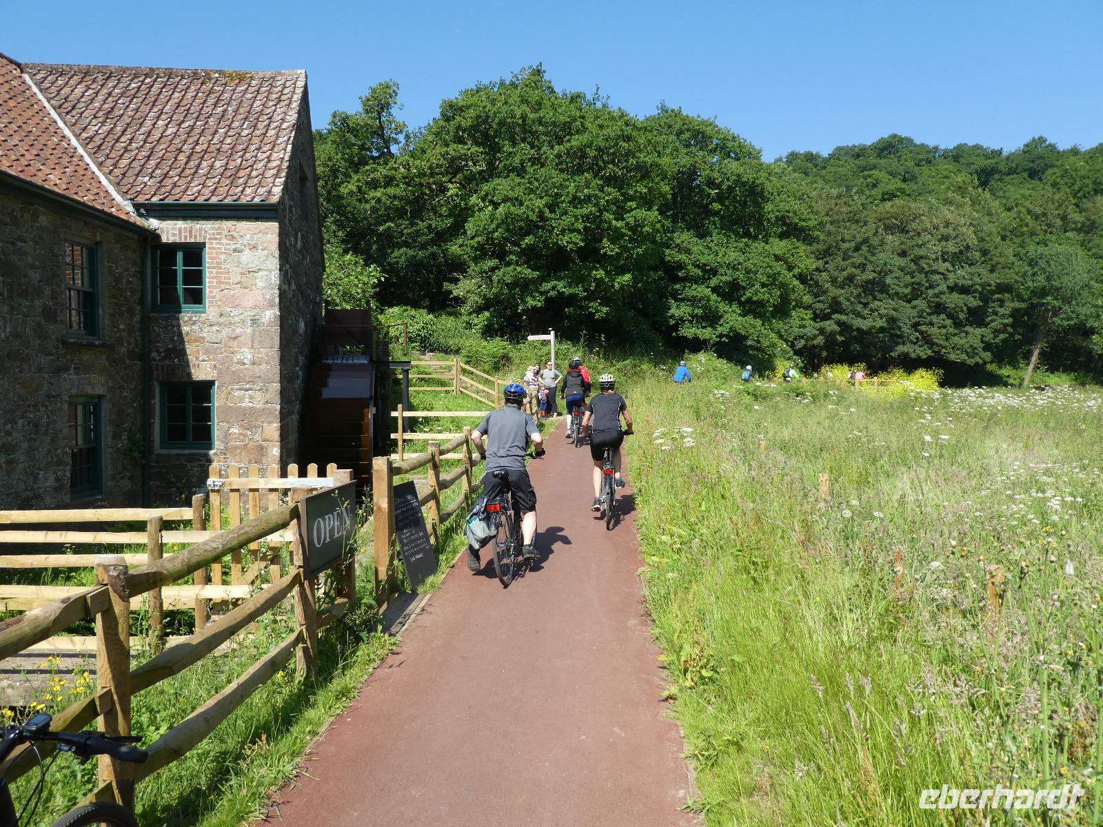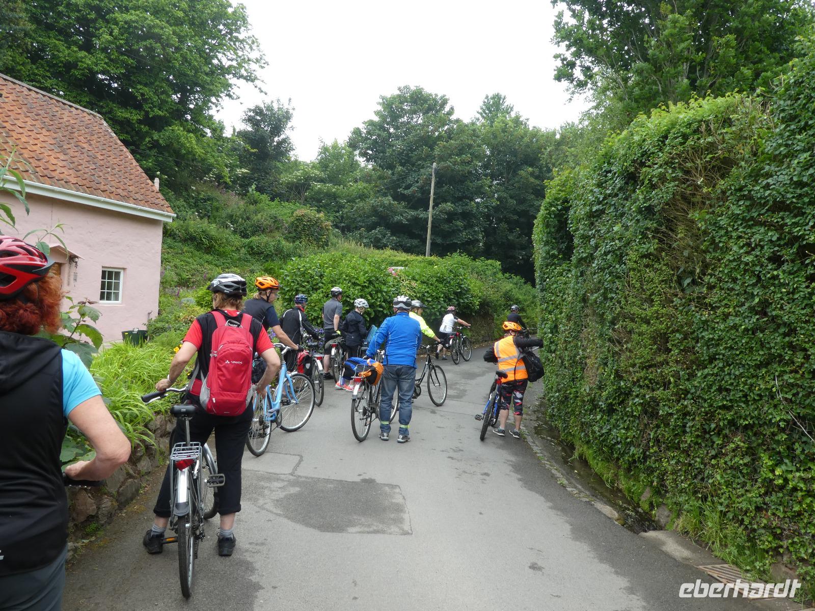 Bereits früh mussten wir wieder aus den Betten springen, denn es erwartete uns gleich nach dem Frühstück Penny, unsere Radreiseleiterin auf Jersey. Sie begrüßte und erklärte uns die Strecke für diesen Tag. Mit den Radtaschen auf den Schultern liefen wir zur Radstation, bei welcher wir die Räder erhielten. Nachdem wir die Räder eingestellt hatten, ging es auch schon durch die Stadt zur Küste. Wir fuhren von der Südküste zur Ostküste und gelangten zum Mont Orgueil Castle, welches wir besichtigten. Als nächstes ging es die Ostküste entlang zum St. Catherine´s Breakwater. Dabei fuhren wir einige Anstiege herauf und wieder herunter. Dies sollte aber noch nicht alles gewesen sein, denn es ging weiter entlang der Ostküste bergauf zur Nordküste. An der Nordküste angekommen machten wir eine Mittagspause beim Hungry Men. Gestärkt ging es noch ein kleines Stück weiter begauf und landeinwärts bevor die Abfahrt bis zum Hotel begann. Kurz vor dem Hotel mussten wir uns noch einmal ins Zeug legen um den letzten Anstieg zu bewältigen, bevor der Tag zu Ende ging.