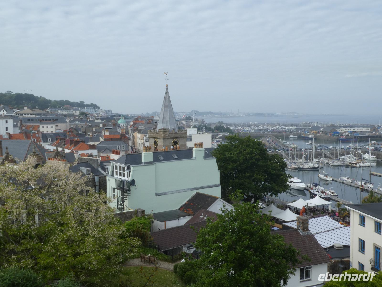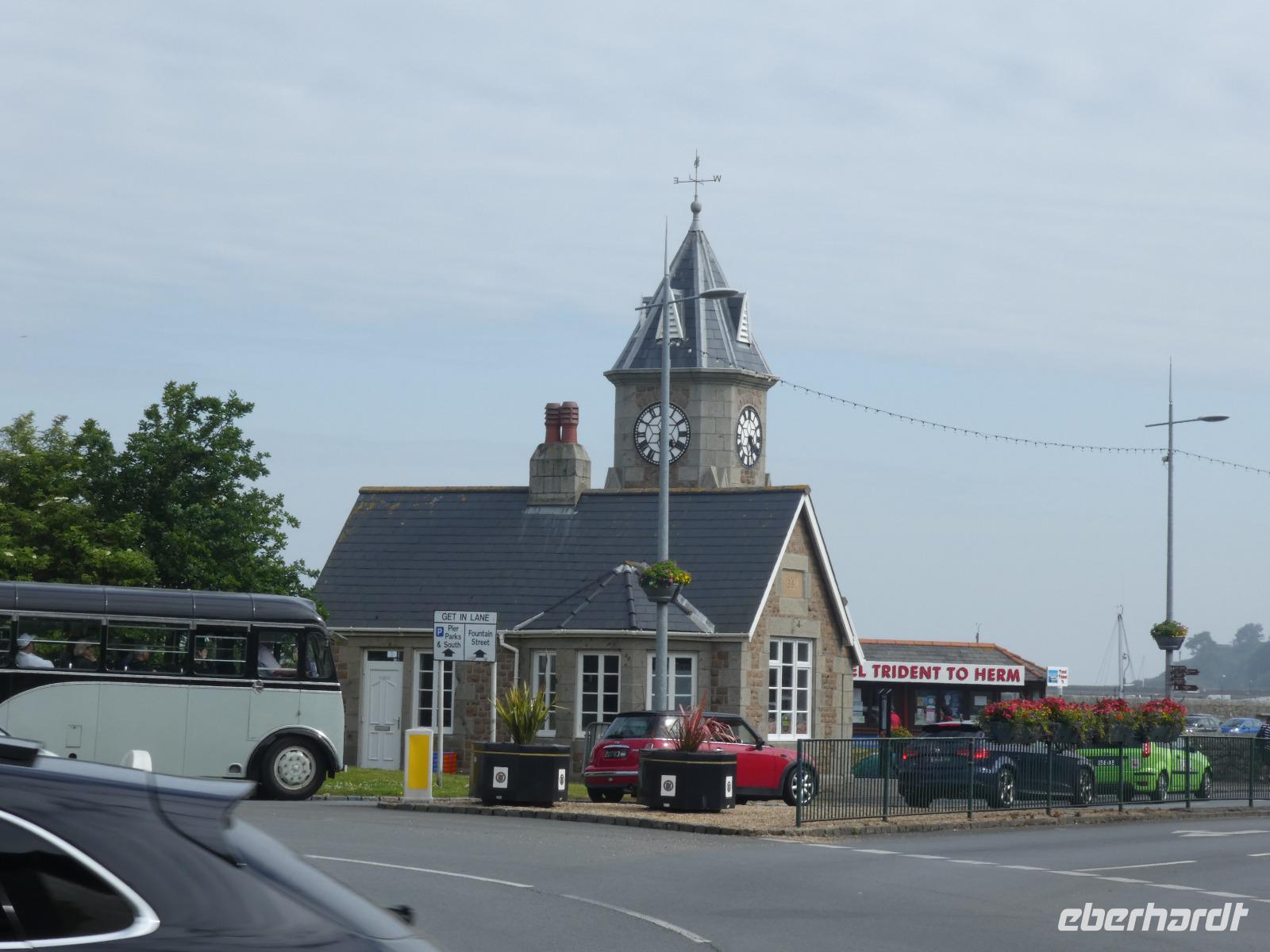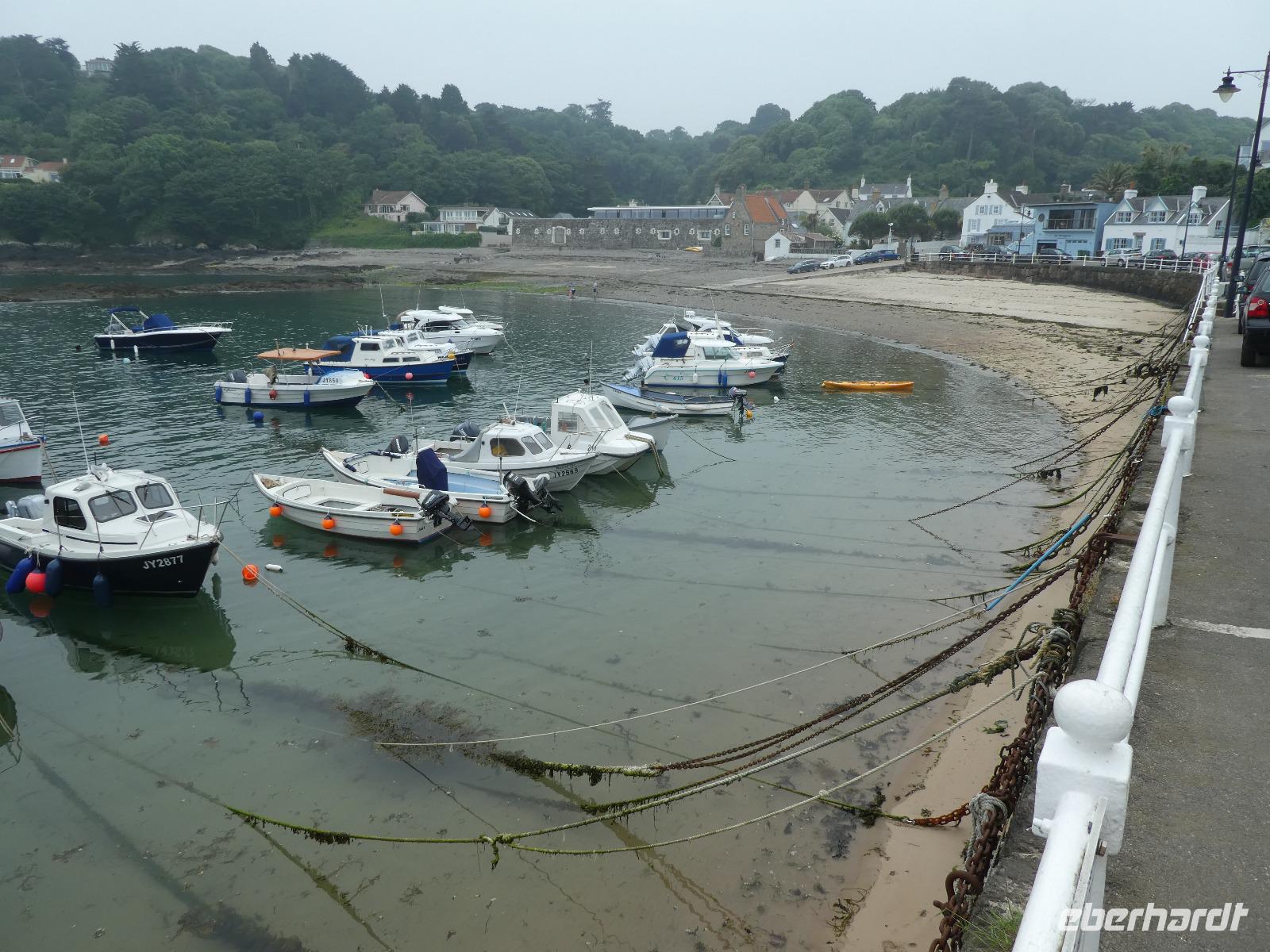 Wir stärkten uns am Morgen am Frühstückstisch. Das Wetter war trocken, die Straßen nass. Unser Reiseleiter bekam die Aufgabe das Wetter zu verbessern. Bereits mit Radsachen warteten wir auf unseren Transfer, welcher uns zum Radstartpunkt mit Meli (eine Reiseleiterin) brachte. An der Südküste in Jerbourg angekommen, warteten bereits Ant und Richard - ebenfalls Reiseleiter - auf uns. Zusammen stellten wir alle die Räder für uns ein und begannen unsere Radtour. Die Route führte uns durch kleine Ortschaften zu unserem ersten Ziel: Die kleine Kirche „Little Chapel". Man sagt es sei die kleinste funktionierende Kapelle in Europa. Weiter an der Südküste entlang durch weitere Ortschaften und Feldern entlang, kamen wir an der Südwestspitze an. Hier sahen wir alte Wehranlagen, Bunker und Geschütze der damaligen deutschen Wehrmacht. In „La Lague" machten wir unsere Essenpause. Weiter entlang der Westküste - angekommen in „Le Creux es Faies - konnten wir auf die Insel Lihou schauen. Danach fuhren wir noch ein Stück weiter die Westküste entlang bevor wir ins Landesinnere durch schöne und sehenswerte Ortschaften fuhren, um an die Ostküste zu gelangen. Wieder an der Ostküste angekommen, hatten wir auch schon unser Hotel in St. Peter Port fast erreicht. Das Wetter hatte gehalten und als wir am Hotel ankamen, kam sogar die Sonne zum Vorschein. Nachdem wir Meli, Richard und Ant verabschiedet hatten, konnten wir unsere freie Zeit bei einem Stadtbummel genießen.