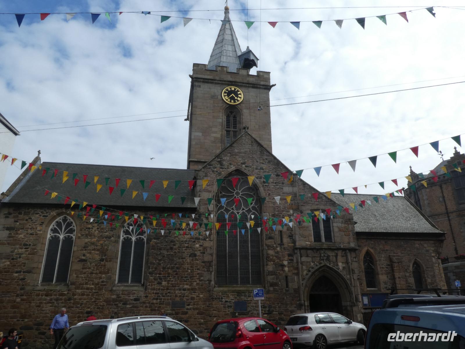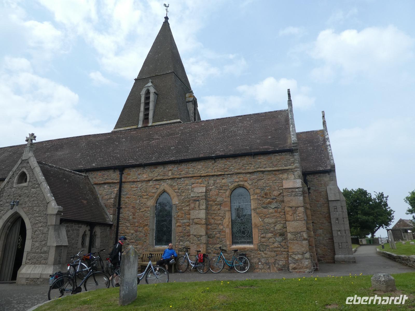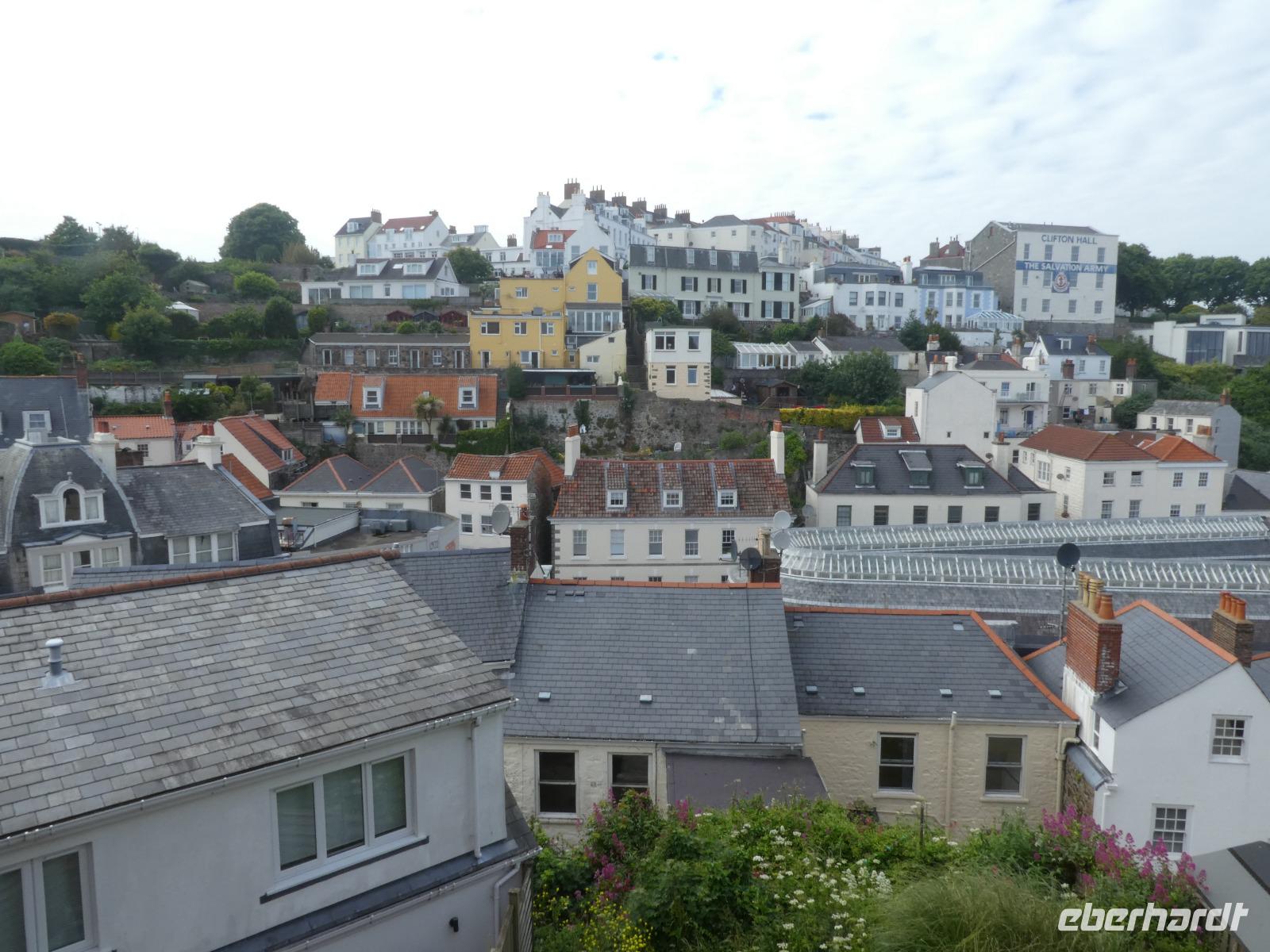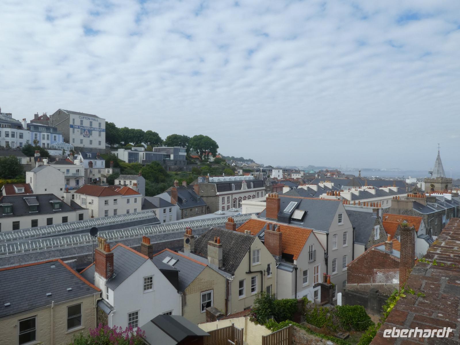 Wir stärkten uns am Morgen am Frühstückstisch. Das Wetter war trocken, die Straßen nass. Unser Reiseleiter bekam die Aufgabe das Wetter zu verbessern. Bereits mit Radsachen warteten wir auf unseren Transfer, welcher uns zum Radstartpunkt mit Meli (eine Reiseleiterin) brachte. An der Südküste in Jerbourg angekommen, warteten bereits Ant und Richard - ebenfalls Reiseleiter - auf uns. Zusammen stellten wir alle die Räder für uns ein und begannen unsere Radtour. Die Route führte uns durch kleine Ortschaften zu unserem ersten Ziel: Die kleine Kirche „Little Chapel". Man sagt es sei die kleinste funktionierende Kapelle in Europa. Weiter an der Südküste entlang durch weitere Ortschaften und Feldern entlang, kamen wir an der Südwestspitze an. Hier sahen wir alte Wehranlagen, Bunker und Geschütze der damaligen deutschen Wehrmacht. In „La Lague" machten wir unsere Essenpause. Weiter entlang der Westküste - angekommen in „Le Creux es Faies - konnten wir auf die Insel Lihou schauen. Danach fuhren wir noch ein Stück weiter die Westküste entlang bevor wir ins Landesinnere durch schöne und sehenswerte Ortschaften fuhren, um an die Ostküste zu gelangen. Wieder an der Ostküste angekommen, hatten wir auch schon unser Hotel in St. Peter Port fast erreicht. Das Wetter hatte gehalten und als wir am Hotel ankamen, kam sogar die Sonne zum Vorschein. Nachdem wir Meli, Richard und Ant verabschiedet hatten, konnten wir unsere freie Zeit bei einem Stadtbummel genießen.