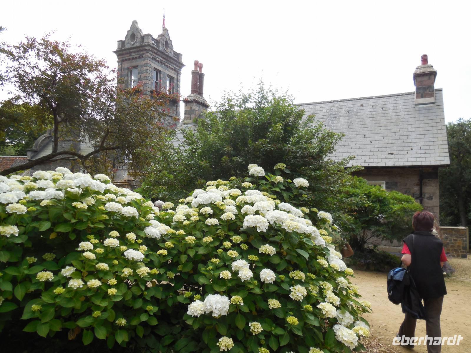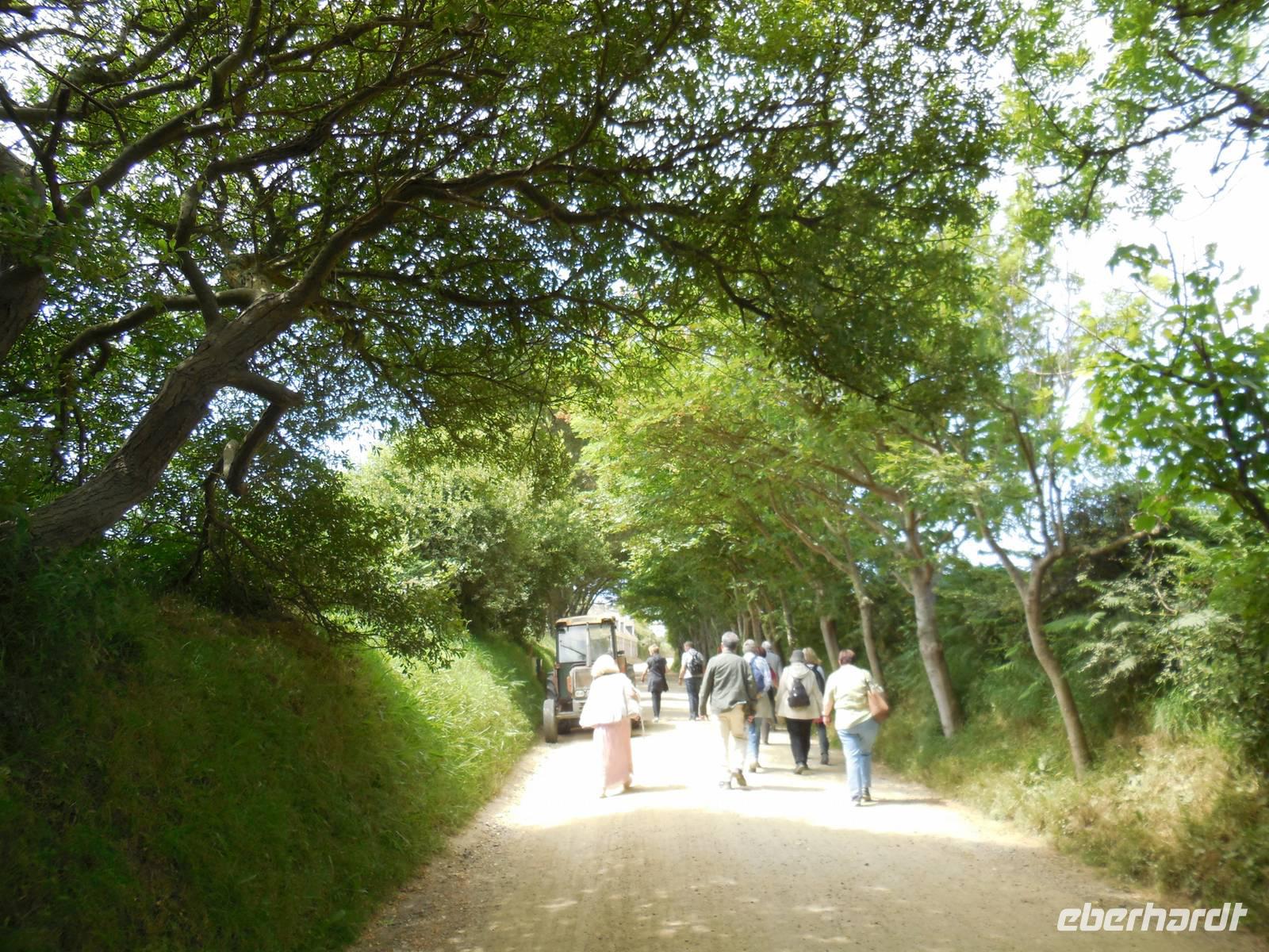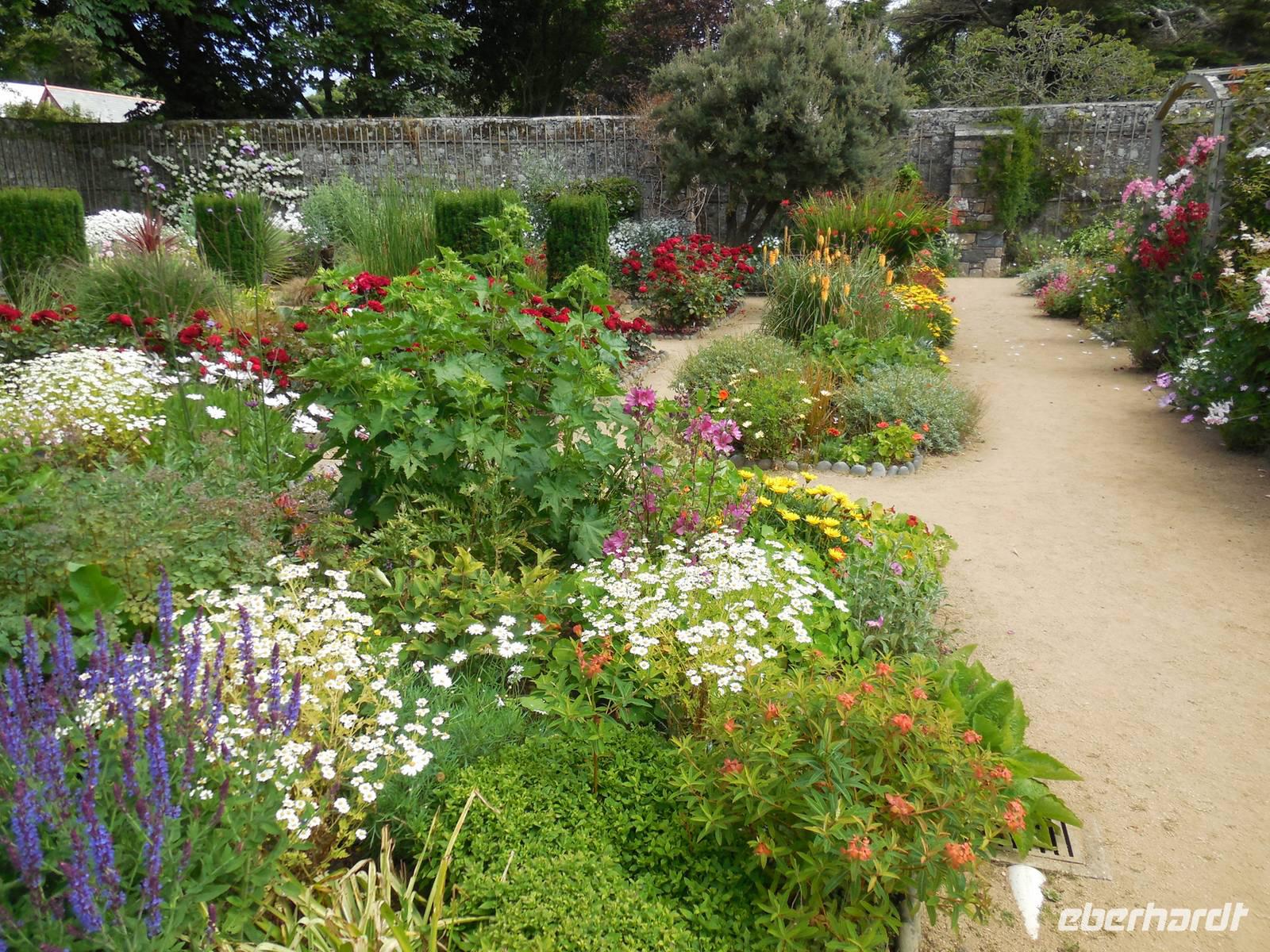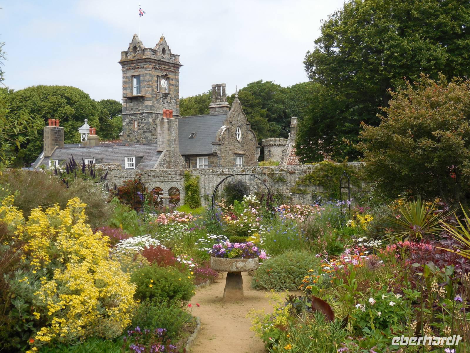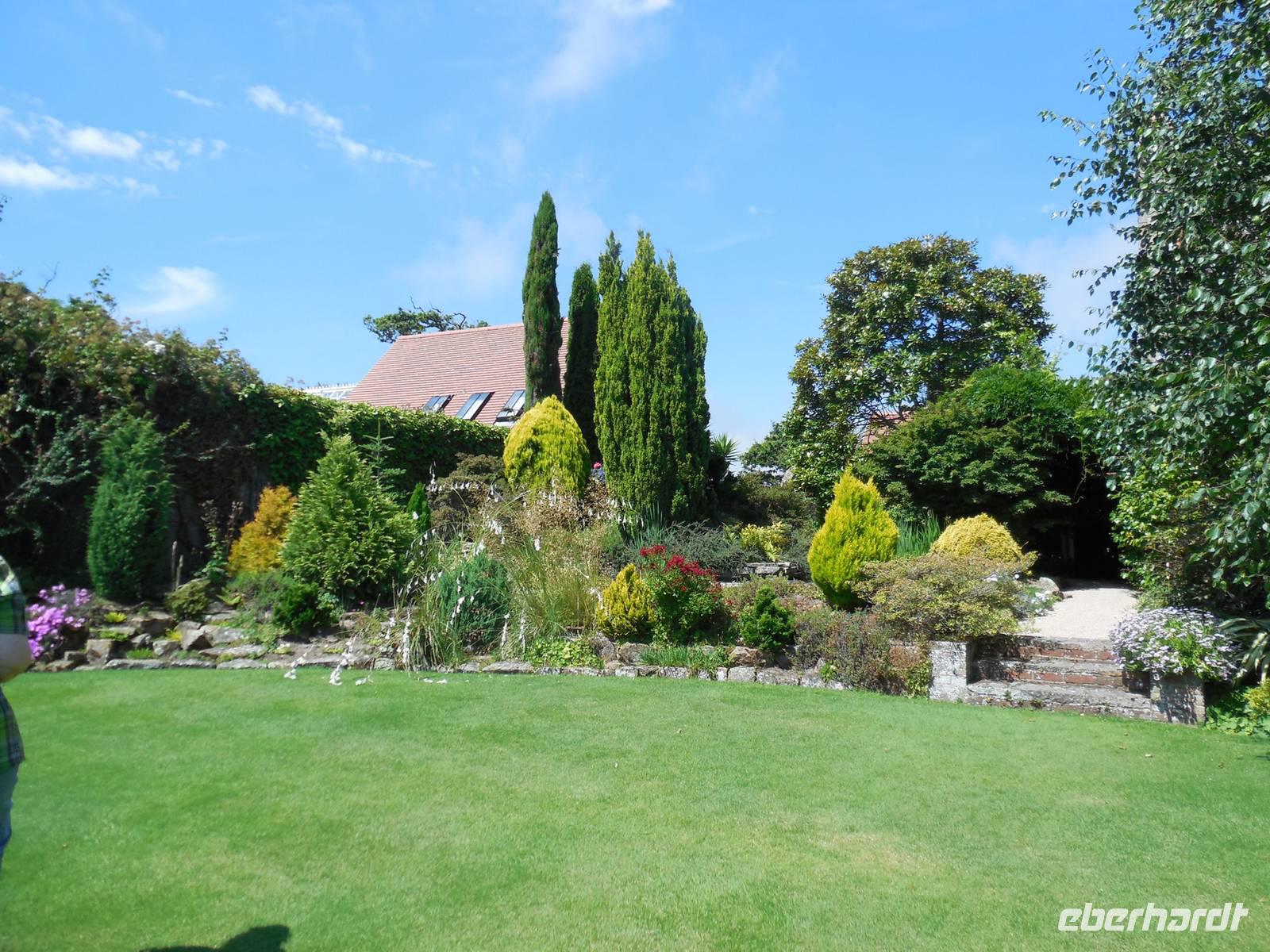 Sark, die zweitkleinste der fünf Kanalinseln, ist heute unser Ziel. Die nur 5,5 km² große Insel, auf der niemand (nicht einmal der Arzt) mit dem Auto unterwegs ist, besticht durch sein einzigartig beruhigendes Flair. Da ist die ca. einstündige, recht holprige Fährüberfahrt, auf der viele Reisekaugummis gekaut und Tabletten gegen Seekrankheit geschluckt werden mussten, direkt wieder vergessen. Da hier nur einige Traktoren und eine Menge Pferdekutschen und Fahrräder unterwegs sind, fühlt man sich direkt bei der Ankunft wie in einer anderen Welt. Ein Traktor bringt uns den steilen, staubigen Weg hinauf ins Dorf. Kaum ausgestiegen, können wir schon die ersten Gärten bestaunen, die in uns die Vorfreude auf die Blütenpracht, der wir in den nächsten Tagen begegnen werden, wecken. Teils mit der Pferdekutsche, teils zu Fuß erreichen wir La Seigneurie. Der Garten des Anwesens blüht ganz wunderbar! Auf dem Weg zurück besichtigen wir die St. Peter Kirche. Jede Familie hat hier ihr eigenes Sitzabteil mit individuell bestickten Kissen. Sogar für die Gefängnisinsassen ist eine Bank reserviert. Das kleine Gefängnis der Insel sehen wir auch nach unserer Mittagspause. Gut gestärkt wandern wir zu La Coupée, dem schmalen Übergang von Sark zu Little Sark. Andere fahren mit einer der Pferdekutschen zu dem Aussichtspunkt, von dem aus man auf die Brücke sehen kann. Bevor wir durch den Wald zurück zur Fähre spazieren, genießen wir noch ein leckeres, selbstgemachtes Eis in der Sonne auf dem Dorfplatz. Dieses wird aus der Milch der Guernseykühe hergestellt, welche durch ihren hohen Fettgehalt besonders gut schmeckt. Die Rückfahrt mit der Fähre ist zum Glück wesentlich ruhiger als die Hinfahrt. Den wunderschönen sonnigen Tag lassen wir bei einem guten Abendessen ausklingen.