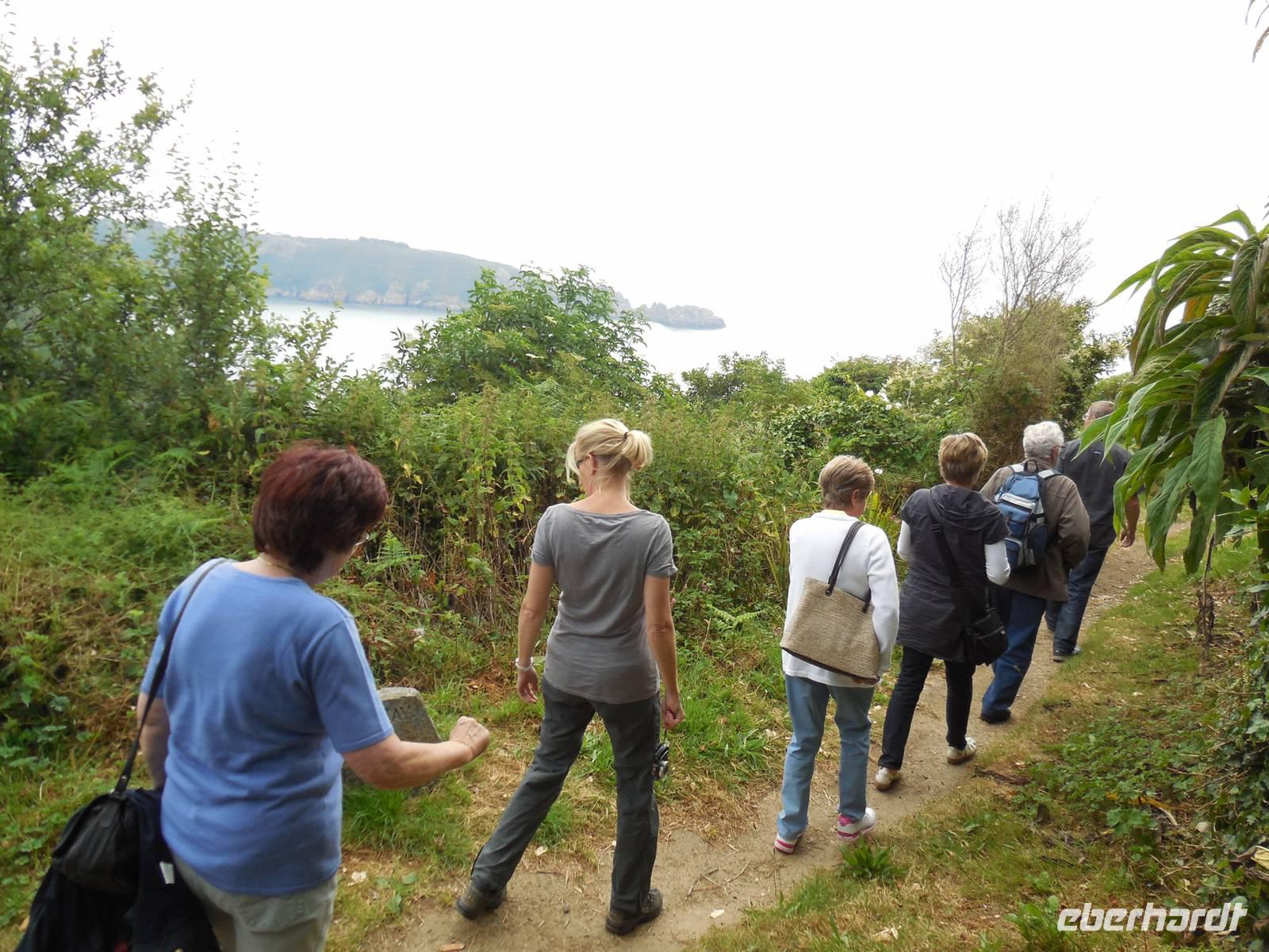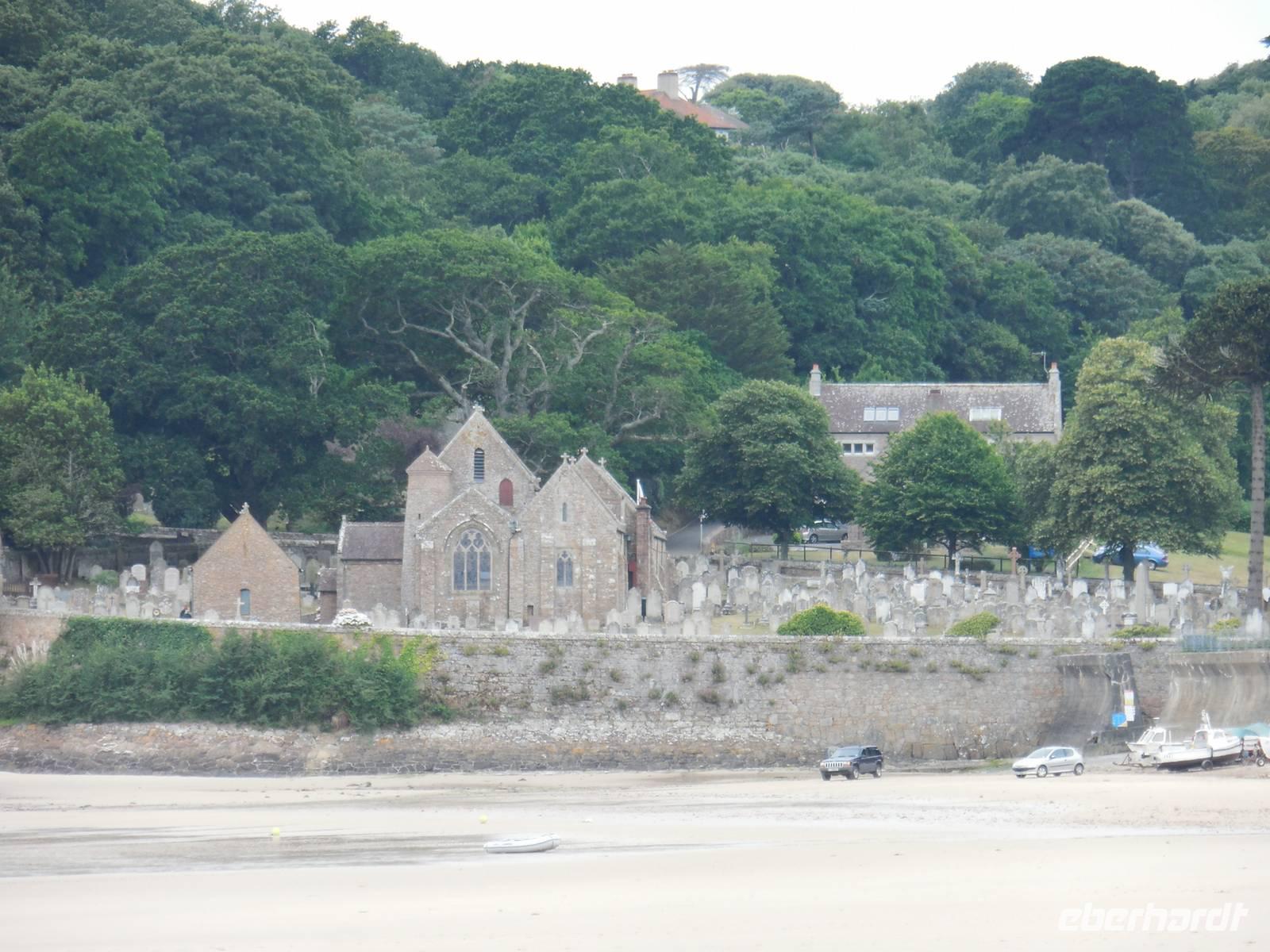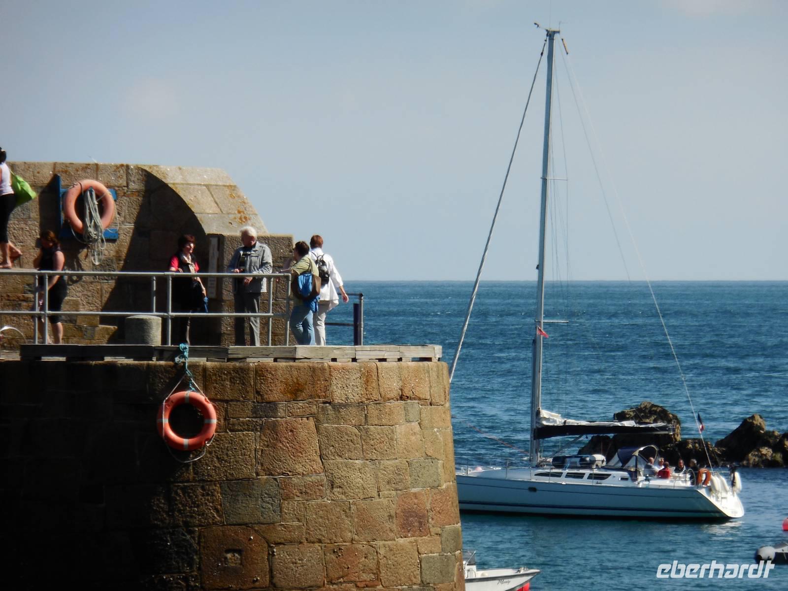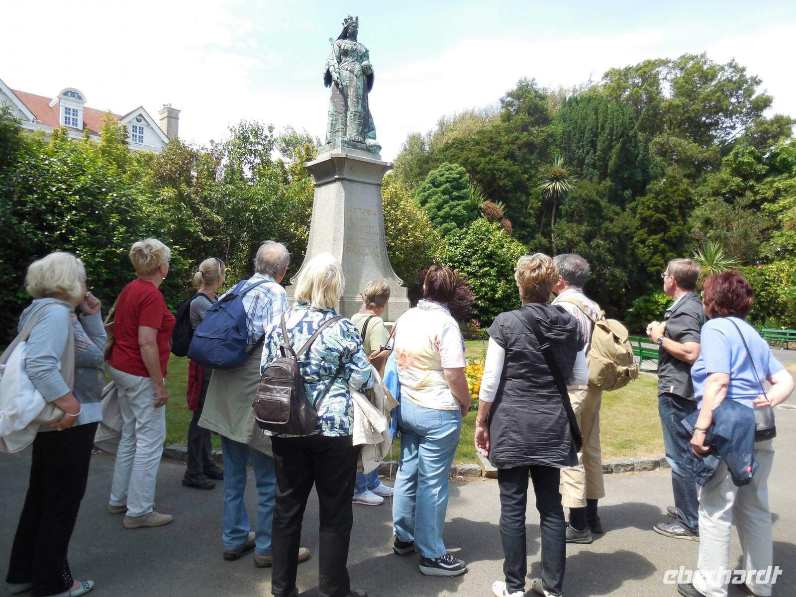 Heute heißt es früh aufstehen, denn 9.00 Uhr legt unsere Fähre nach Guernsey ab. Heidi bringt uns noch zur Fähre, wo uns Christel empfängt. Sie wird uns heute auf Guernsey begleiten. Nach ca. einer Stunde erreichen wir die zweitgrößte Kanalinsel. Diese ist nicht zuletzt durch ihre westliche Lage Wind und Wetter am meisten ausgesetzt, was sich auch in ihren Küstenformationen erkennen lässt. Auf einem halbstündigen Spaziergang zum Icart Point erleben wir das selbst. Die Ruhe der Natur, der Ausblick auf das offene Meer und die vielen Gewächse am Wegesrand sorgen für Tiefenantspannung bei jedem einzelnen. Pete, unser Chauffeur bringt uns anschließend zu einem weiteren Highlight Guernseys - der Little Chapel. Diese winzige Kapelle soll wohl die kleinste der Welt sein und wurde Anfang des 20. Jahrhunderts von Déodat, einem Mitglied der De La Salle Bruderschaft erbaut. Das besondere an ihr ist jedoch nicht nur ihre Größe, sondern ihr Aussehen. Das komplett von Muscheln und Tonscherben bedeckte Gebäude mag für die einen kitschig und für die anderen ein kreatives Meisterwerk sein. Ganz sicher ist die Kapelle aber eine Rarität, die ihres gleichen sucht. Unsere Mittagspause verbringen wir in einem kleinen Restaurant ganz in der Nähe des Fort Saumarez - einem von unzähligen Martello-Türmen, die die Kanalinseln früher beschützten. Unsere Inselrundfahrt geht weiter in Richtung Nord-Osten. Wir halten noch kurz an einem weiteren Schutzturm bevor uns Pete zurück nach St. Peter Port, der Inselhauptstadt bringt. Gemeinsam durch den Park, vorbei an der Statue von Victor Hugo, der selbst lange hier wohnte, schlendern wir ins Zentrum. Dort besuchen einige die Kirche, trinke Kaffee oder spazieren am Hafen entlang bevor unser Tag auf Guernsey sich schon bald dem Ende neigt, denn wir müssen zurück zur Fähre. „Zu Hause" in St. Helier holt Ernst uns ab und bringt uns zurück zum Hotel, wo wir auch Familie Kretzschmar wieder treffen, die Jersey heute auf eigene Faust erkundet hat.