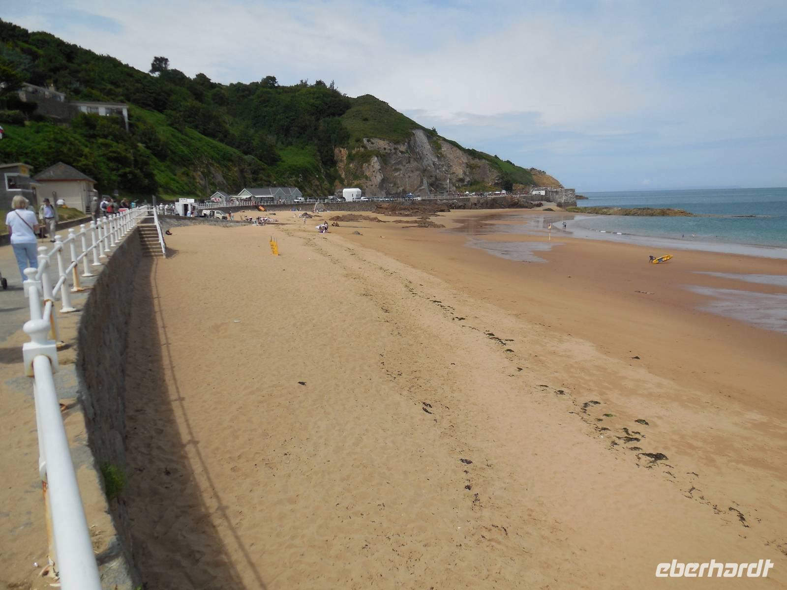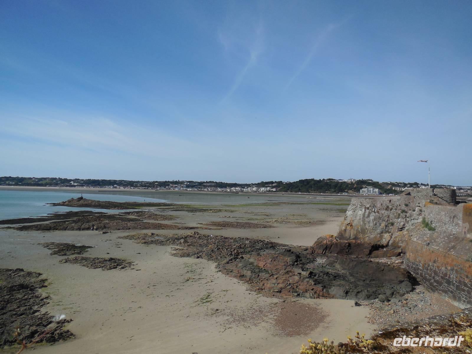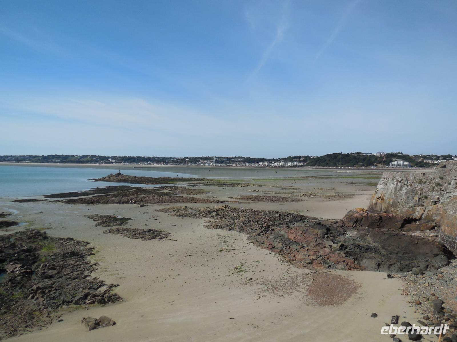 Nach dem Frühstück holt uns Heidi heute 9.30 Uhr vom Hotel ab und nimmt uns mit auf eine Fahrt um die ganze Insel. Wir fahren vorbei an typisch englischen Reihenhäusern Richtung Osten und machen unseren ersten Halt an der Royal Bay of Gouville. Wir spazieren entlang der Bucht der Festung von Gorey entgegen. Sie steht auf dem „stolzen Berg" und wurde im 13. Jhd. zum Schutz vor den Franzosen errichtet und im Laufe der Zeit u.a. als Gefängnis genutzt. Auf unserer Weiterfahrt kann man immer wieder kann man am Horizont die Küste der Normandie sehen. Wir fahren vorbei an den Wellenbrechern von St. Catherine zur Bouley Bay. Hier lohnt es sich wirklich die Treppen zum Meer hinunter zu gehen, denn diese Bucht ist voll im einzigartigen, bunten Steinen, deren Schönheit man erst bei genauerem Hinsehen entdeckt. Anschließend sehen wir den kleinsten Sandstrand in der Bonne Nuit Bay und den nördlichsten Punkt der Insel, Sorel Point. Unsere Mittagspause verbringen wir heute in Greve de Lecq. Heidi empfiehlt uns den halben Hummer mit Salat, der wirklich vorzüglich schmeckt, und warnt noch vor den Möwen! Wir erfahren auch bald warum, denn diese sind so frech, dass sie ohne Angst auf die Tische springen und den Leuten ihre Pommes direkt vom Teller klauen. Da hat man keine Chance, denn mit den großen Vögeln legt man sich lieber nicht an. Nach einem Verdauungsspaziergang am Strand ist unser nächstes Ziel die Ruine von Grosnez Castle. Von hieraus fahren wir nun entlang der Westküste in Richtung Süden. Die St. Ouen's Bucht ist aufgrund ihrer stürmischen Lage und hoher Wellen besonders bei Surfern beliebt. Die Westküste steht weitgehend unter Naturschutz. Hier darf nur ein Haus gebaut werden, wenn dafür ein anderes abgerissen wird. Schön, dass diese tolle Dünenlandschaft so belassen wird, wie sie ist. Vom Bus aus sieht man schon den Corbiére Leuchtturm, der auf dem Bauch seines schlafenden Wärters zu stehen scheint. Er war der erste Leuchtturm Großbritanniens. Wieder zurück an der Südküste besichtigen wir die Kirche von St. Brelade. In ihrem Deckengewölbe kann man noch Abdrücke von Muscheln und Steinen sehen. Hier am Strand nutzen wir die Zeit, einen Kaffee zu trinken, ein Eis zu essen oder das eine oder andere Souvenir zu besorgen. Dafür empfiehlt sich z.B. Fudge, eine landestypische Süßigkeit, mit Black Butter. Gegen 16.00 Uhr sind wir zurück in St. Helier. Leider fängt es gerade an zu regnen und so fahren die meisten zurück ins Hotel. Heute Abend genießen wir ein ganz besonderes Abendessen in einem Fischrestaurant im Stadtzentrum. Von Lachs über Austern bis hin zu Jakobsmuscheln ist für Jeden etwas dabei. Anschließend heißt es jedoch schnell zurück ins Hotel, denn Deutschland spielt heute bei der Fußball-WM in Brasilien!