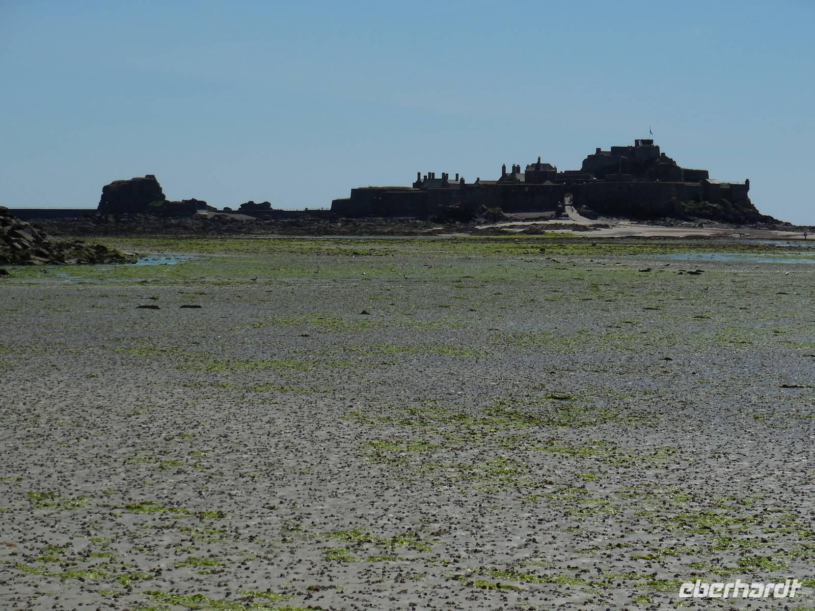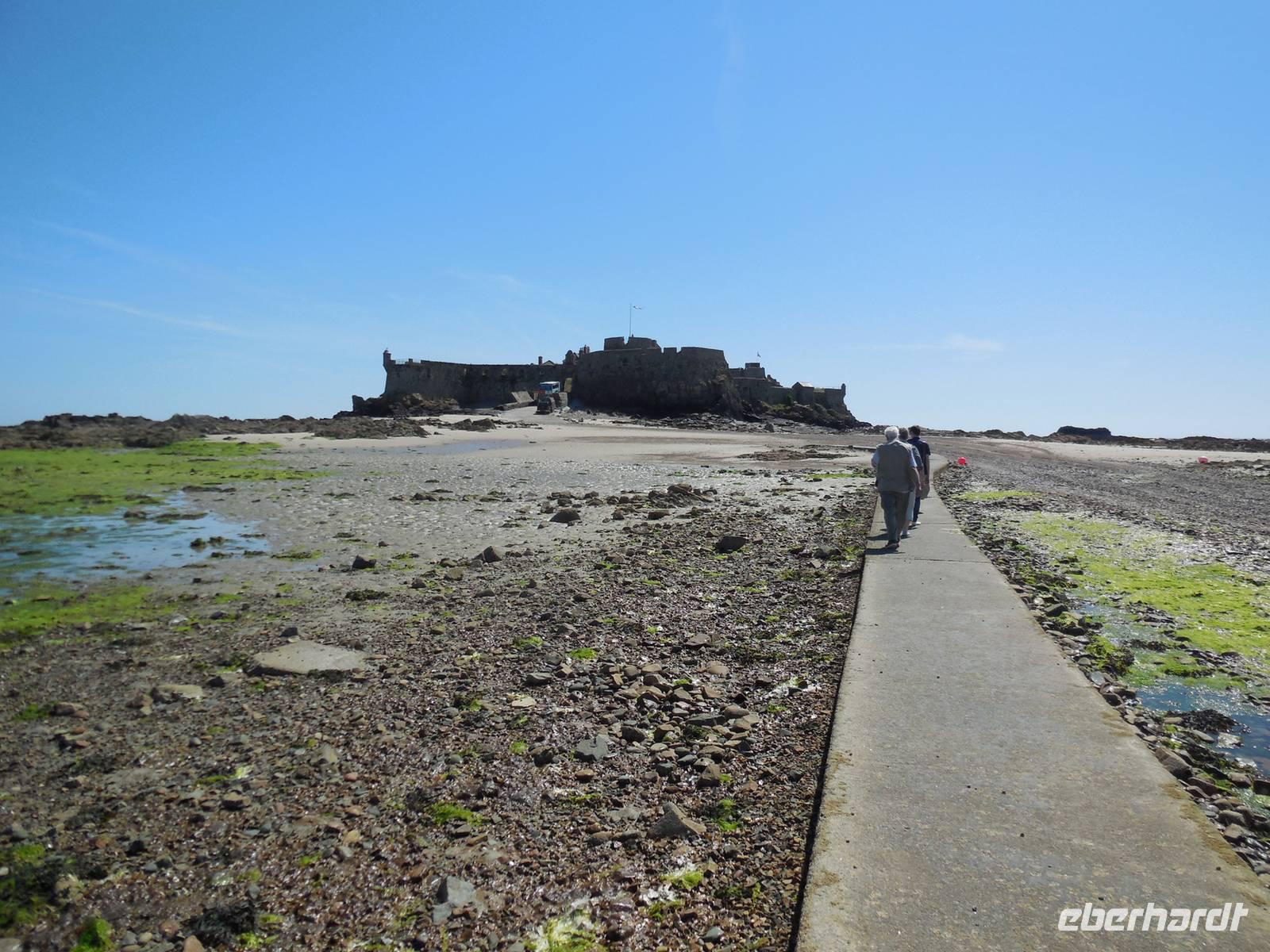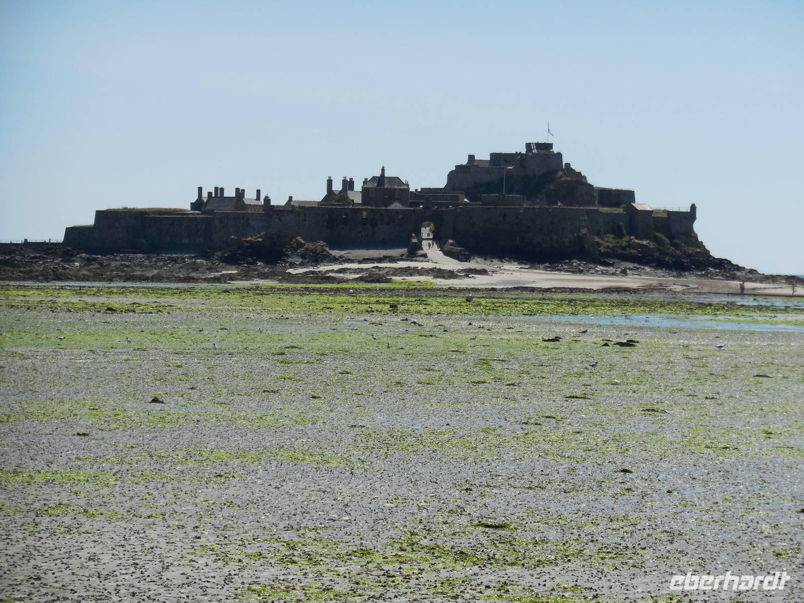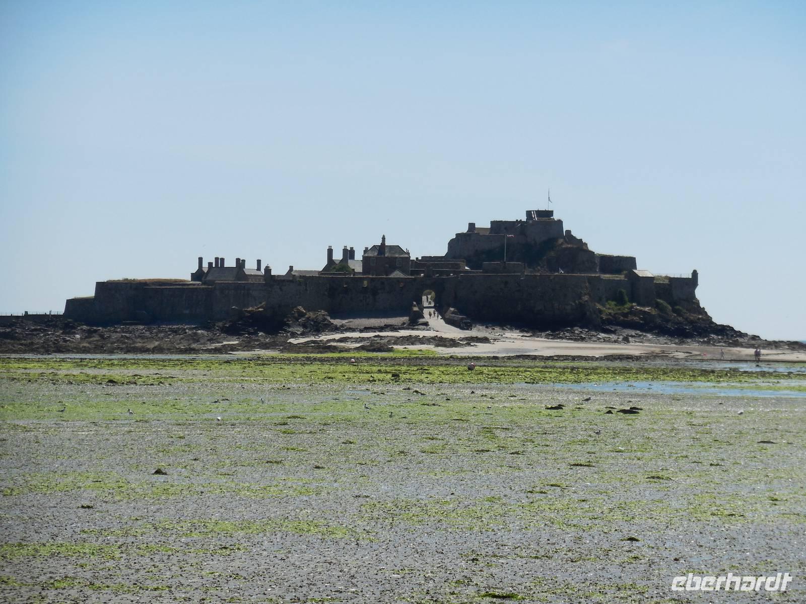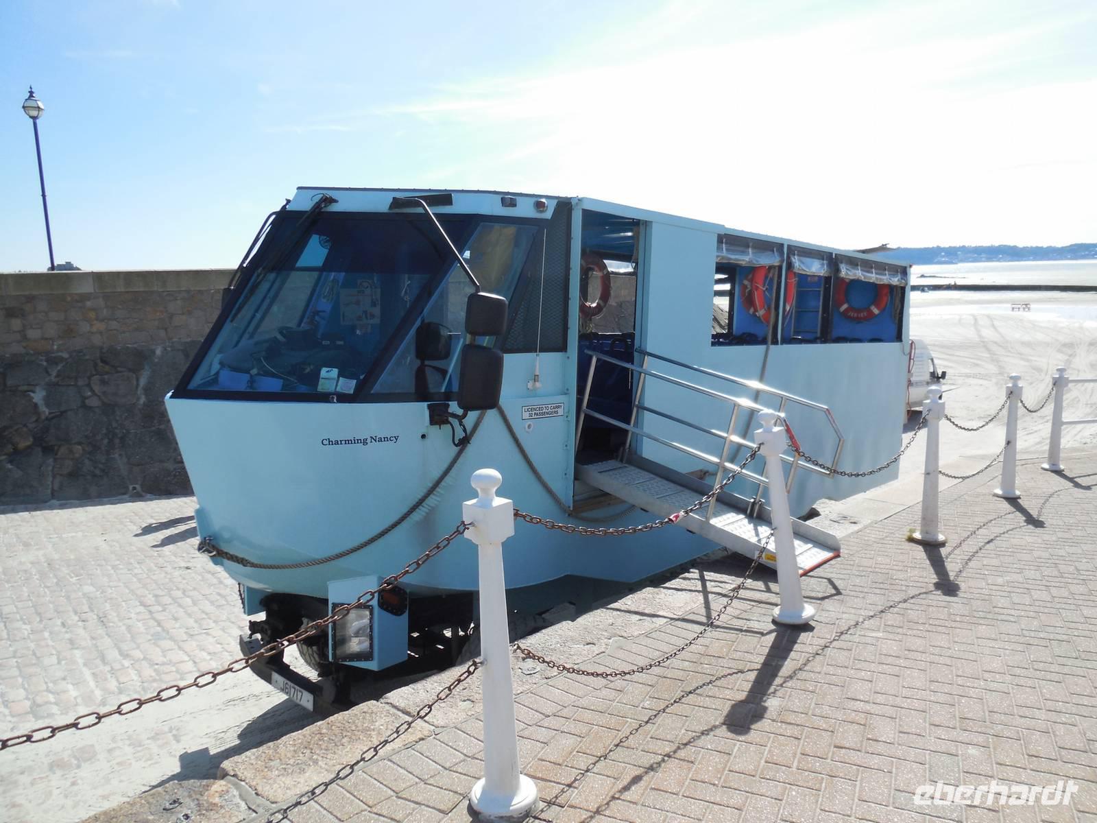 Heute haben wir einen „freien" Tag, der natürlich von allen ganz individuell oder auch gemeinsam genutzt wird. Wir fahren mit dem Bus zur Lavendelfarm. Dieser idyllische Ort lässt nicht nur bei Lavendelliebhabern die Herzen höher schlagen. Unzählige Arten aus der ganzen Welt kann man hier bestaunen und durch die blühenden Felder streifen. Außerdem kann man sehen, wie aus den Blüten das ätherische Öl hergestellt wird, welches man im kleinen Laden kaufen kann. Anschließend wandern wir entlang der ehemaligen Bahnstrecke auf dem Crobière Weg nach St. Aubin, wo wir in einem hübschen Restaurant am Meer Mittag essen. Wer will, fährt mit der kleinen Bimmelbahn zurück nach St. Aubin. Wir laufen ein Stück am Strand entlang, entscheiden uns dann aber doch dazu den Bus zu nehmen. Wieder in St. Helier nutzen wir die Gelegenheit bei Ebbe zum Elizabeth Castle zu gehen. Der Weg ist weiter als gedacht, aber wir gelangen trockenen Fußes zur Festung. Von der relativ großen Anlage aus hat man einen herrlichen Blick auf die Bucht und auch innerhalb der Mauern gibt es einiges zu entdecken: u.a. viele Kanonen, einen Bunker aus der Besatzungszeit und verschiedene Ausstellungen. Nach diesem bewegungsreichen Tag gönnen wir uns die Rückfahrt mit dem Amphibienfahrzeug zurück ans Ufer.