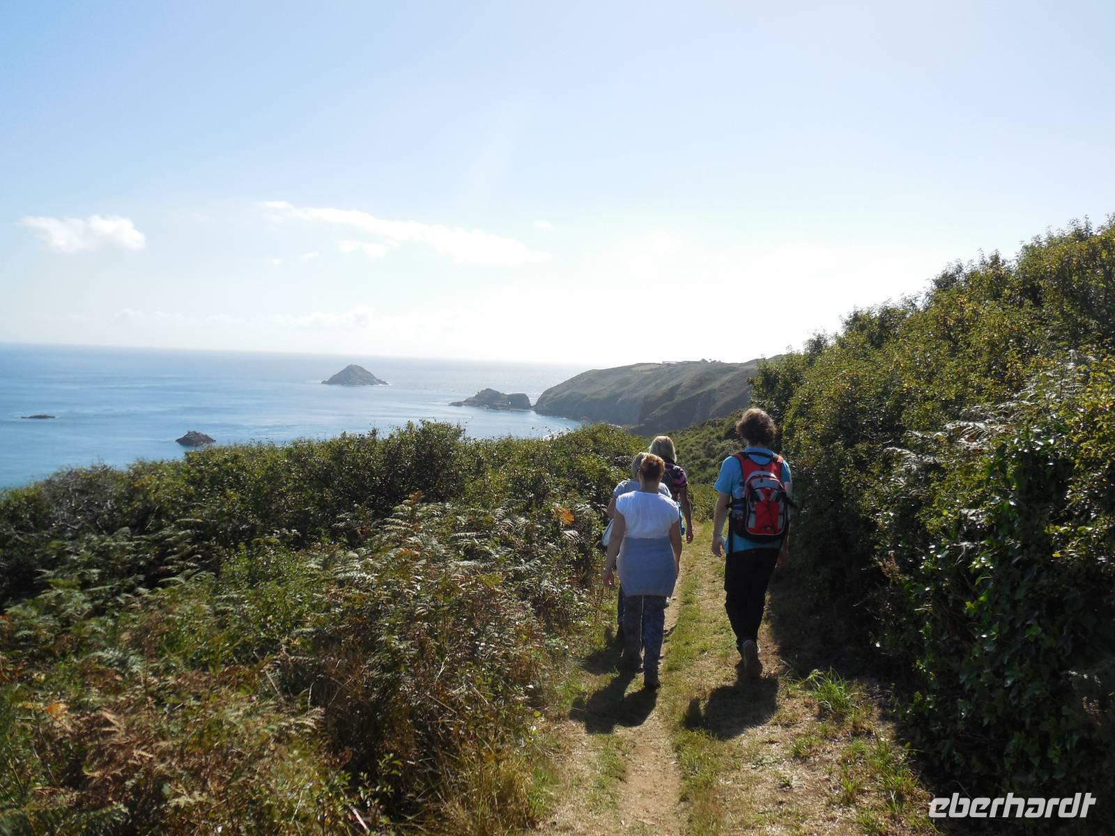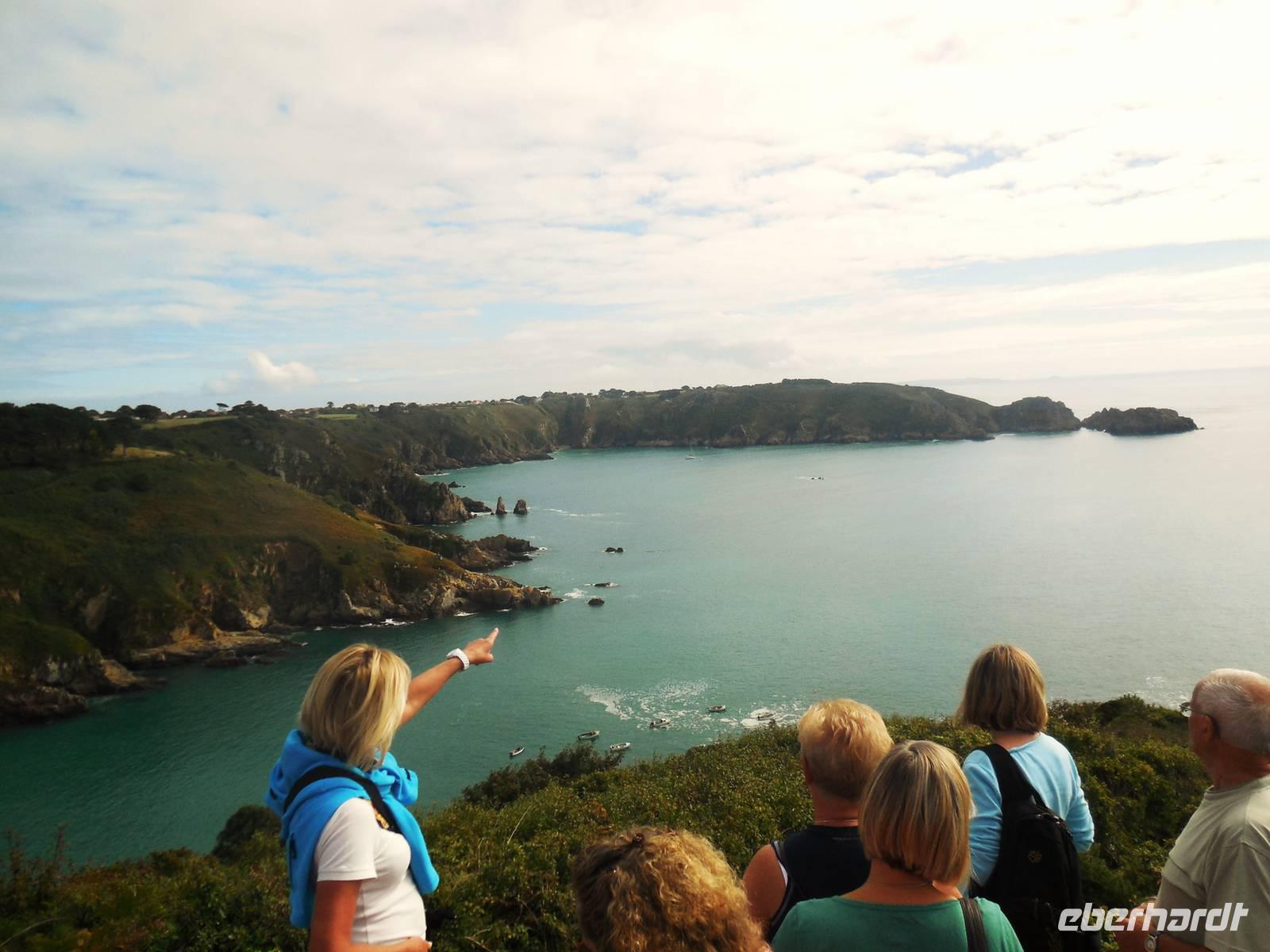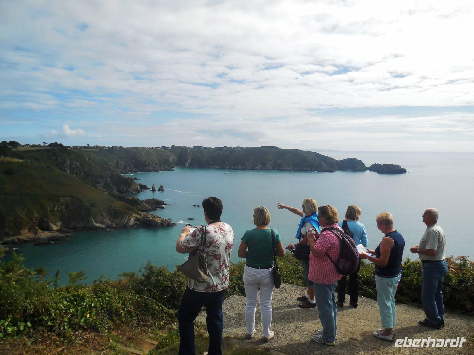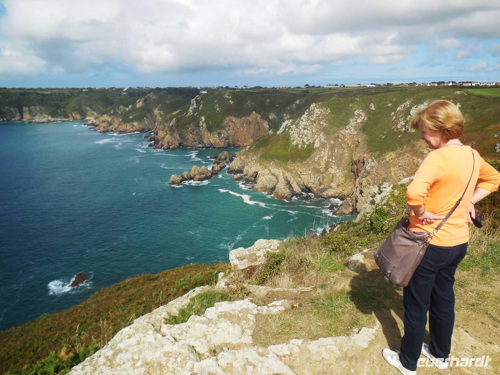 Unserer Weg Richtung Küste führt uns am berühmten Cottage oberhalb der Moulin Huet Bay vorbei. Dieses war Filmkulisse beim Dreh von „Die Rosenzüchterin". Wir begeben uns auf einen kleinen Klippenspaziergang oberhalb der Saint's Bay und gelangen zum südlichsten Punkt der Insel,, dem Icart Point. Ein brombeerumrahmter, grüner Klippenpfad erlaubt uns atemberaubende Blicke auf die tiefblauen Buchten, umrahmt von satten Grün und Bilderbuchstränden.
