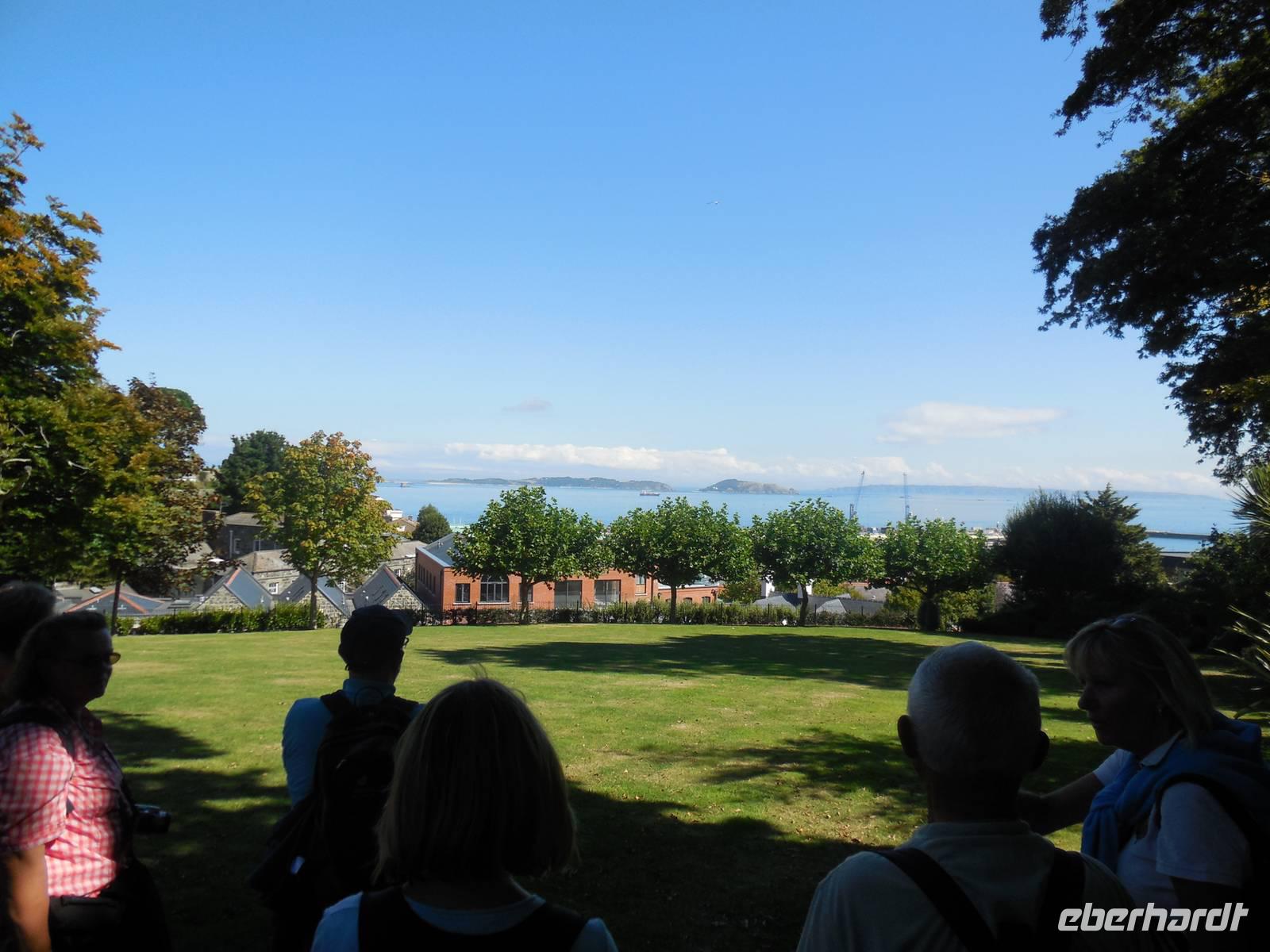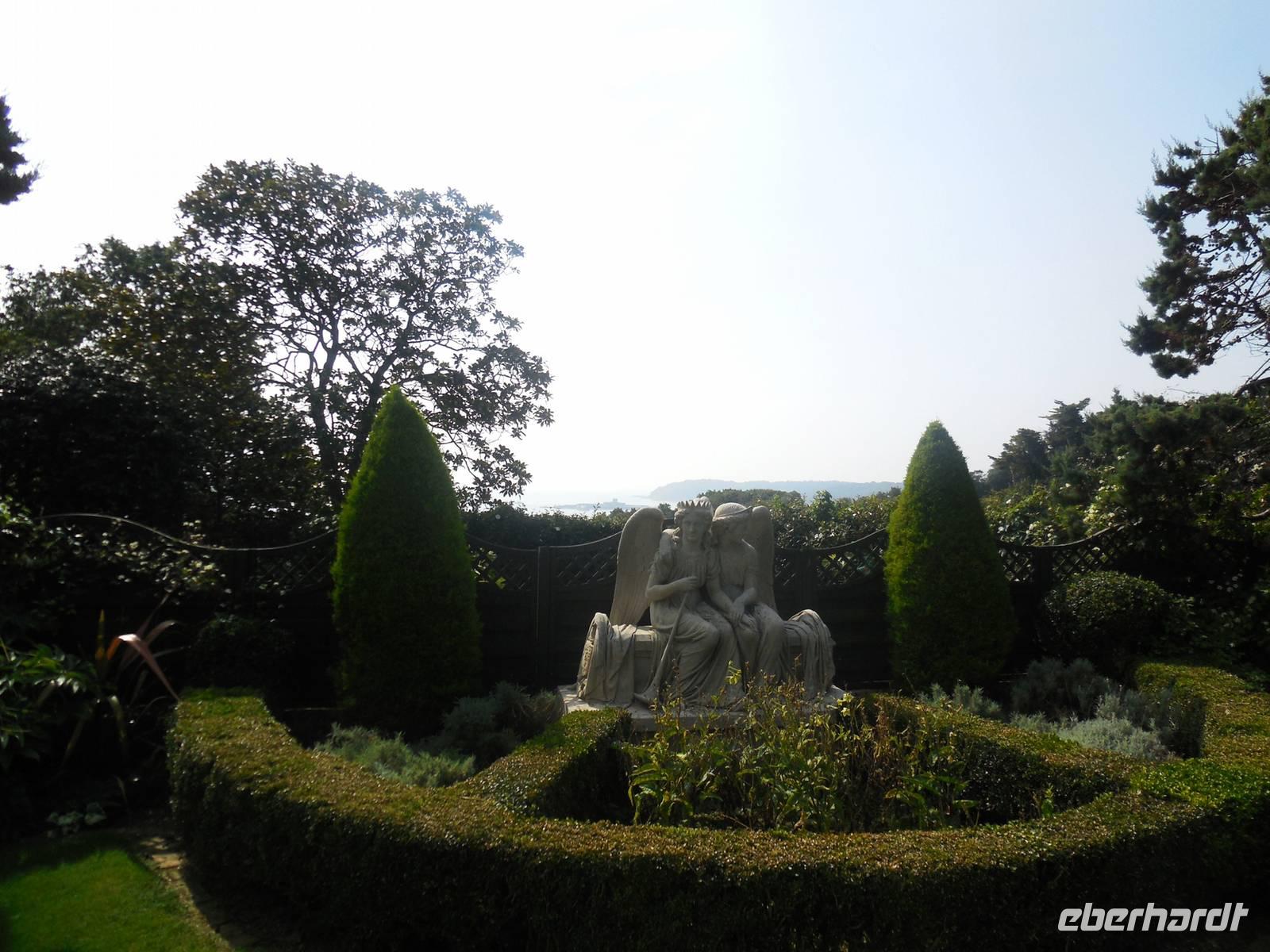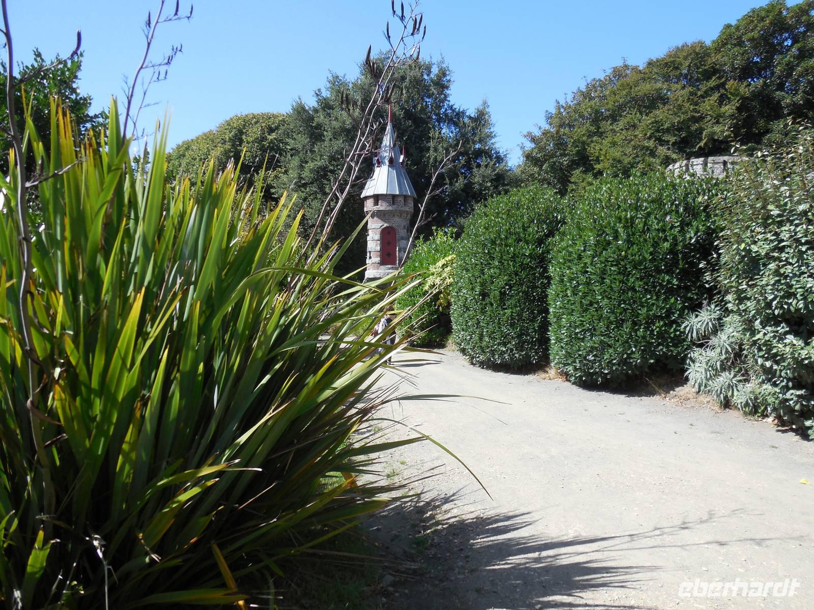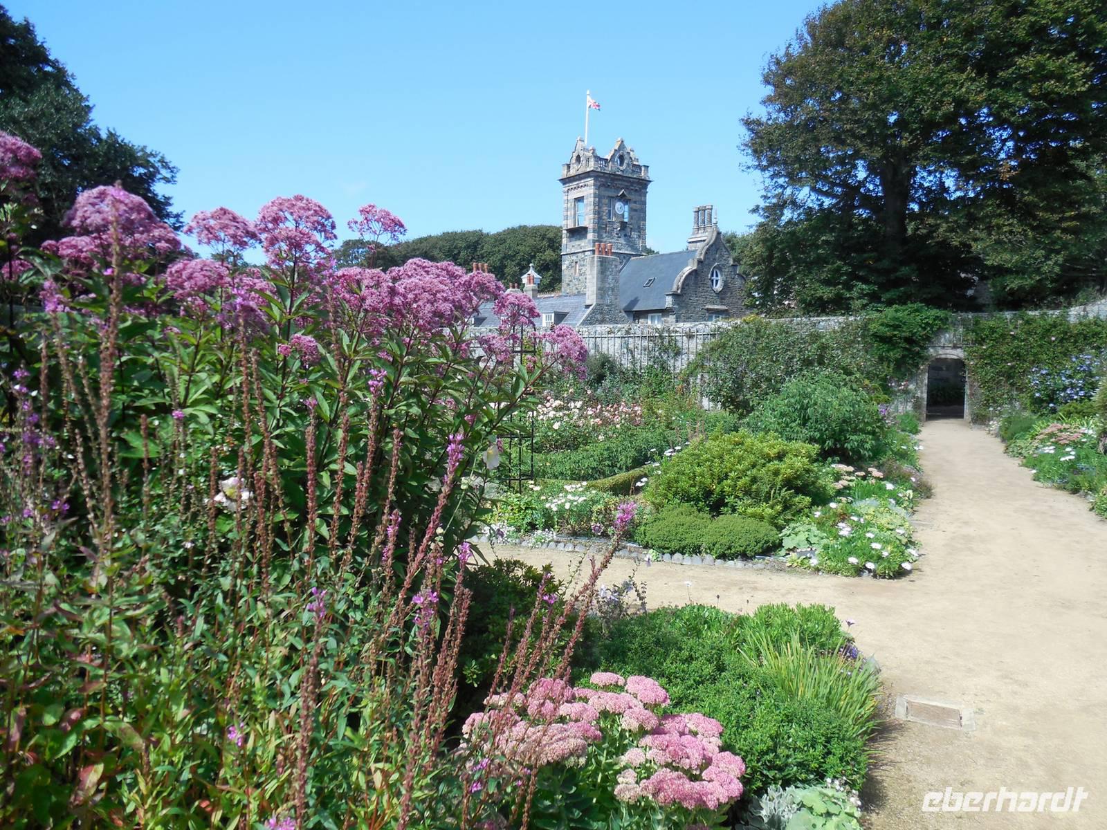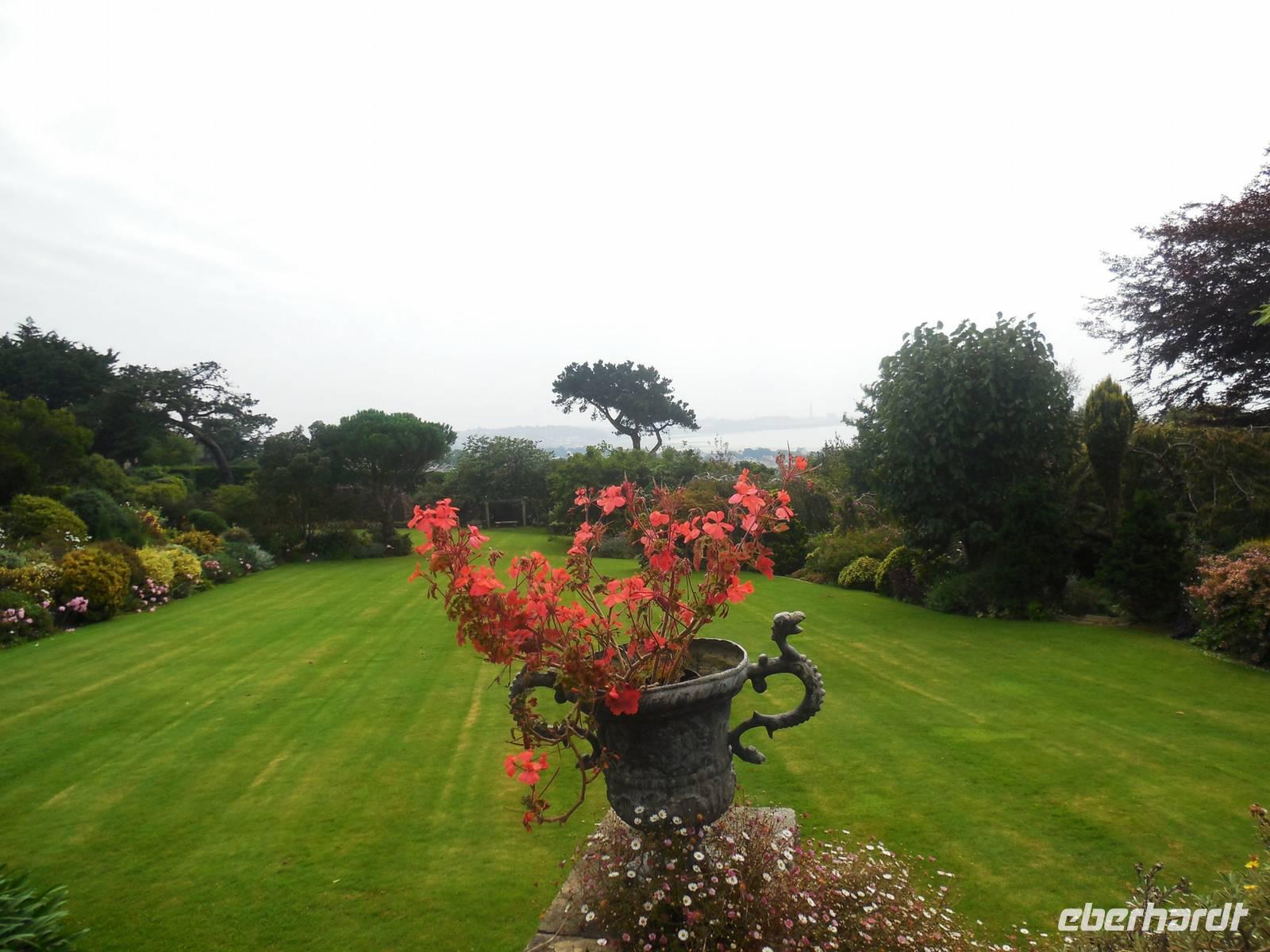Am Nachmittag heißt es die Hauptstadt erkunden. Am Hang gelegen zieren St. Peter Port hübsche Häuschen bis hinunter zum Hafen mit den weißen Yachten. Wir spazieren zunächst durch eine wunderschöne Parkanlage, in welcher die hier arbeitenden Banker Ihre Mittagspause genießen. Hier wachsen Kamelien, Magnolien, Azaleen und Hortensien mit prächtigen Palmen um die Wette. Es bietet sich uns ein atemberaubender Blick durch das kleine grüne Paradies bis hinunter zum Meer. Am Rande des Parks steht die windzerzauste Statue vom Schriftsteller Victor Hugo, der auf Guernsey im Exil lebte. Das bekannte Werk „Les Miserables" wurde hier auf Guernsey veröffentlicht. Unsere Reiseleiterin Heidi gibt noch etwas Inselklatsch zum Besten. So erfahren wir, das seine Gattin, wo auch immer sie lebten, die ständige Anwesenheit seiner Geliebten dulden musste.