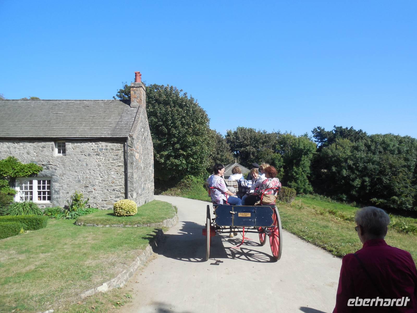 Heute brechen wir am Vormittag zum reizenden Hafen von Jersey auf. Die Fährüberfahrt hat es in sich - es herrscht starker Wellengang. Doch die anstrengende Überfahrt hat sich gelohnt, wir werden von der blumenreichen Insel Sark begrüßt. Hier erfahren wir bei einem Spaziergang zum Anwesen La Seigneurie vieles über das eigenartige Leben der Sarker. Auf dieser Insel finden wir keine asphaltierten Straßen, Autos sind hier verboten. Dafür sehen wir aber umso mehr Traktoren. Heidi erzählt uns von den Lebensbedingungen der hiesigen Bewohner: es werden keine Steuern gezahlt, niemand ist gesetzlich versichert und die Lebenskosten werden im Sommer angespart und müssen den Winter über reichen. Wir entdecken das Haus des einzigen Doktors der Insel und begutachten sein Krankenauto - natürlich einem Traktor. Angekommen in der La Seigneurie begrüßt uns ein paradiesischer Garten, der das Herz von Botanikliebhabern höher schlagen lässt. Wir spazieren durch das Gelände mit der kleinen Burg, dem reizenden Taubentürmchen und genießen das ausgezeichnete Wetter. Dann geht es auf die „Avenue", besser gesagt die Dorfstraße, zum Bummeln und Mittagessen. Schon begrüßen uns die Pferdekutschen, welche einen Teil der Gruppe, vorbei an herrlicher Landschaft und einer Schokoladenmanufaktur, zum La Coupee bringt. Der Rest bewältigt diese Strecke zu Fuß. Der Klippenpfad führt vorbei an den Anwesen der berühmten Barkley Brüder und Weinplantagen, welche herrliche Blicke auf tiefblaue Buchten mit weißen Sandstranden und Jachten erlauben. An der La Coupee angekommen nehmen wir uns Zeit für ein Erinnerungsfoto. Bis nach Jersey und Frankreich reicht der Blick bei diesem herrlichen Wetter. Anschließend geht es wieder zurück ins Städtchen, wo wir es uns bei einem Eis oder Kaffee gut gehen lassen. Ein kleiner Spaziergang durch einen kleinen verträumten und wild wachsenden Wald führt uns wieder zur Fähre. Die Rückfahrt verläuft diesmal äußerst ruhig. Wir geben uns ins Hotel uns lassen den Abend bei Guinness oder Jersey Bitter ausklingen.