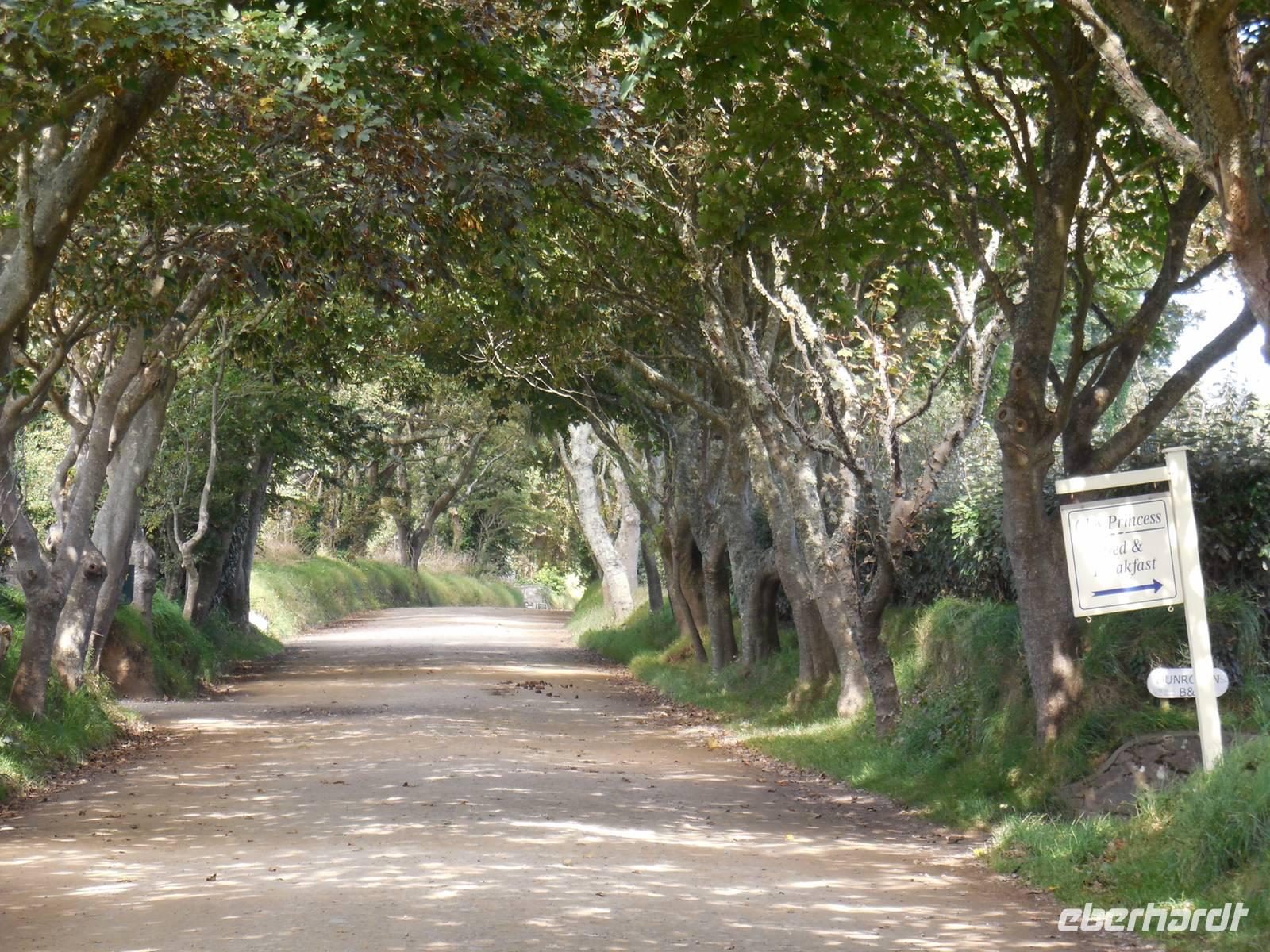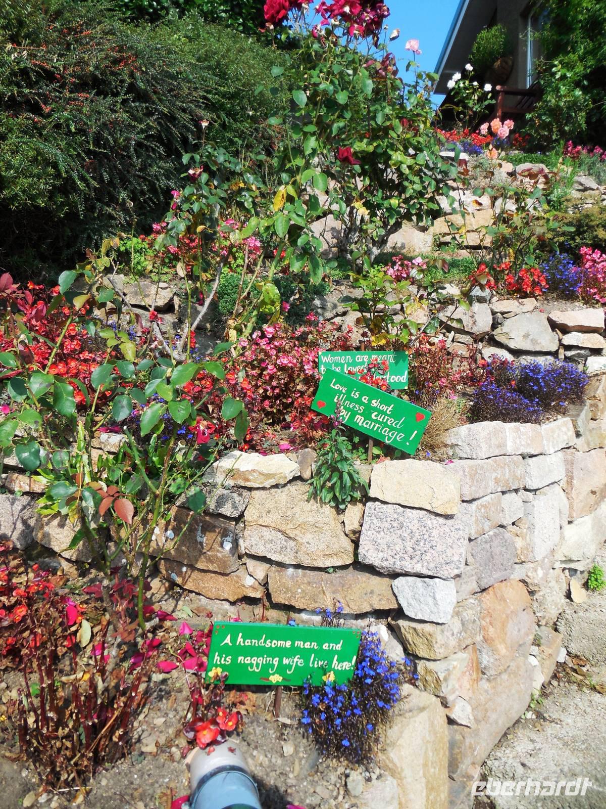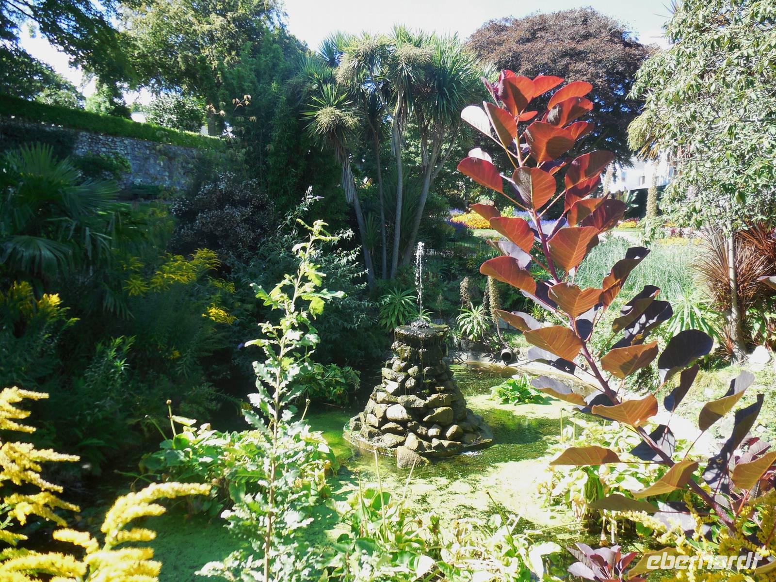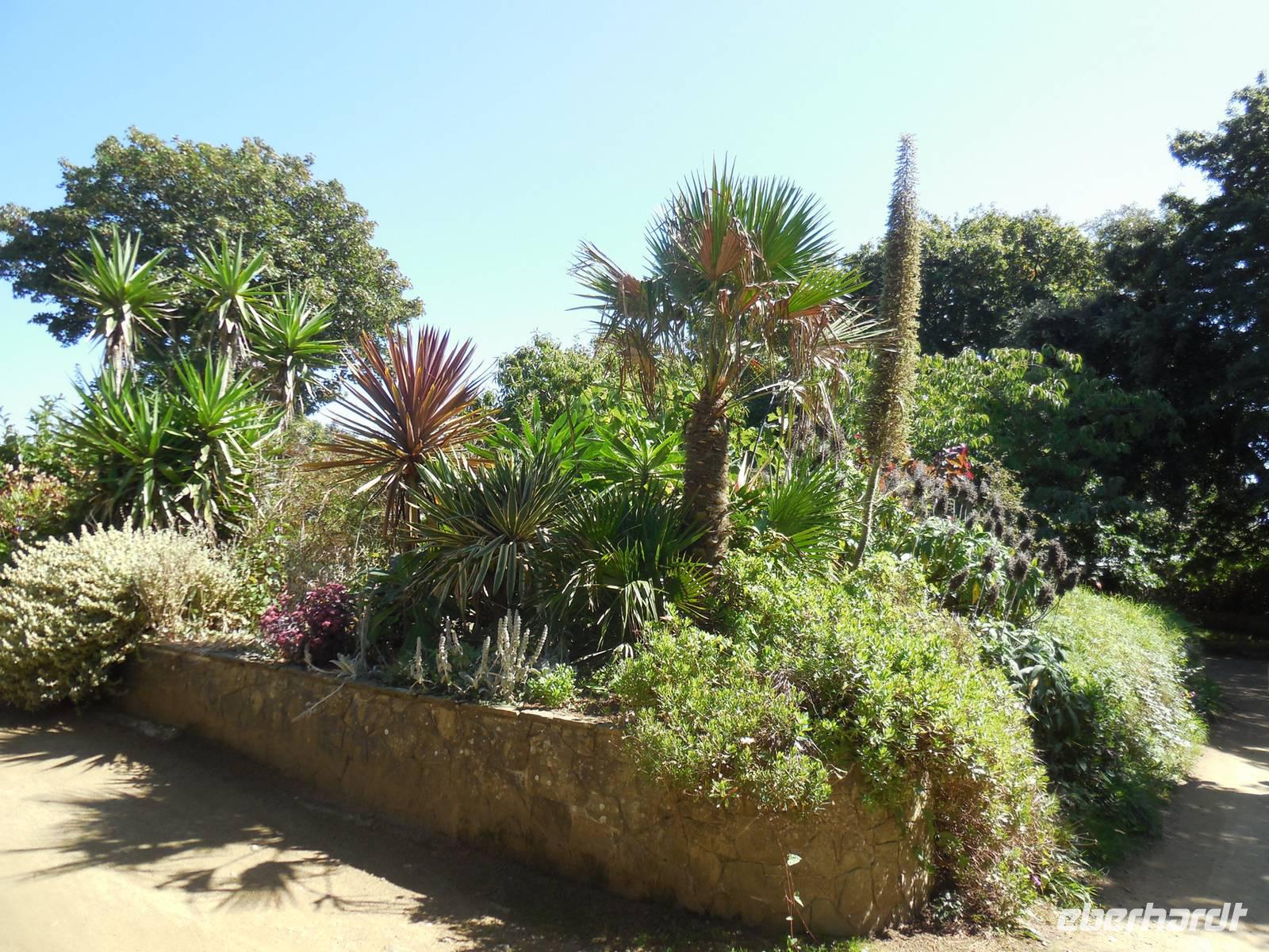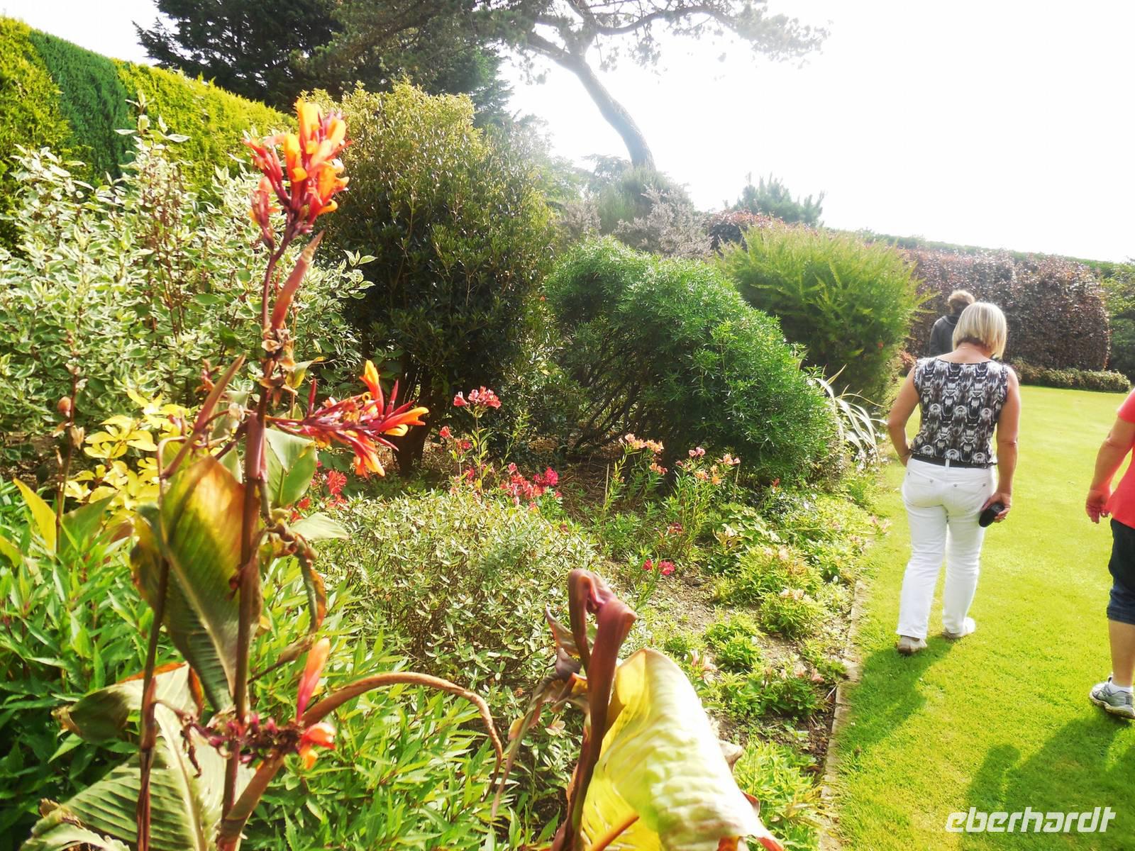 Heute zeigt uns Heidi einige Gärten von wohlhabenden Grundbesitzern. Als erstes begrüßt uns in St. Aubin das Anwesen von Mr. Miles. Dieser Herr, ein englischer Gentleman wie wir ihn aus dem Bilderbuch kennen, führt uns durch sein Gärtchen und erklärt uns stolz die seltenen Gewächse und die Geschichte des Hauses. Zwischen Riesenrharbarber, Hortensien, Bananenstauden und Palmen führt er uns auf sattgrünem Rasen zu einem Teich voller Zierfische, welche früher im Winter sogar einen beheizten Pool bekamen.