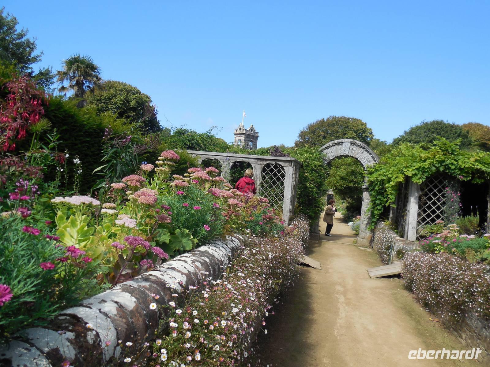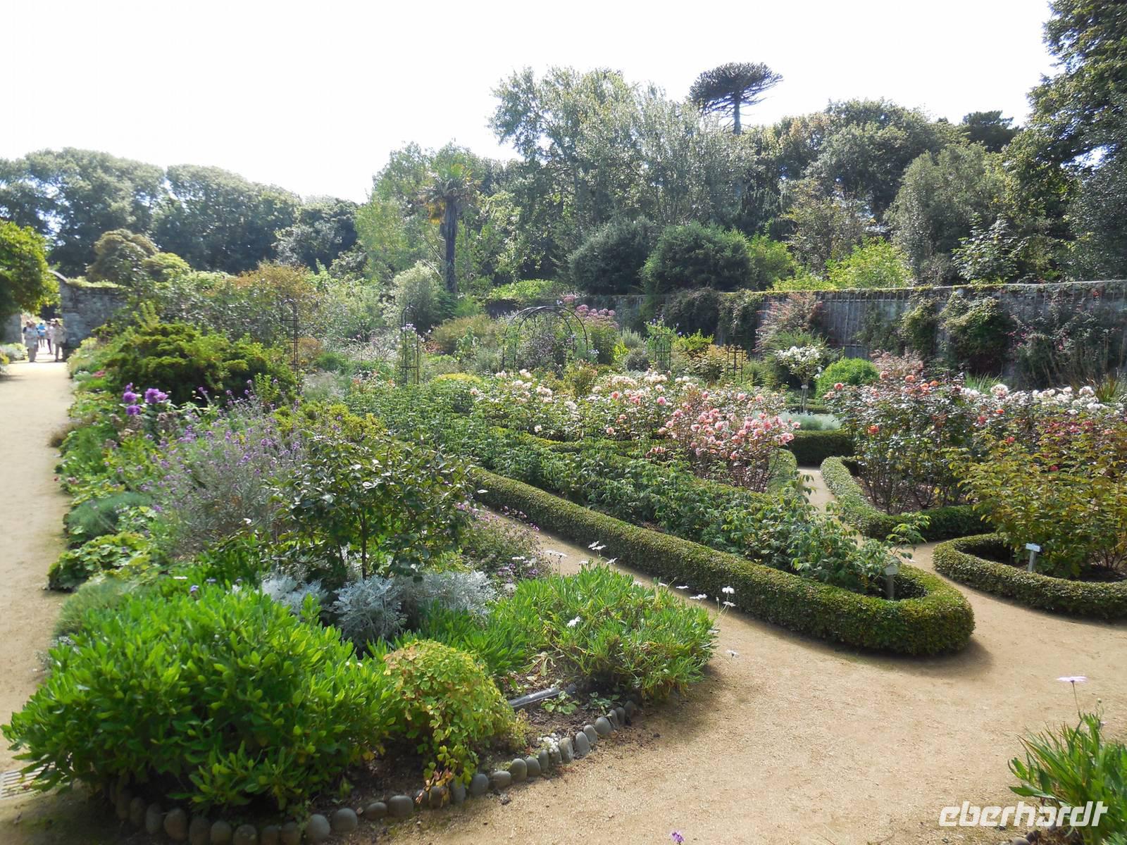 Wir verabschieden uns von dem sympathischen Gentleman und fahren weiter zum Haus von Mrs. Lie. Diese, so erzählt uns Heidi, ist bereits über 80 Jahre alt und bestellt ihren Garten teilweise noch selbst. Bedingt durch ständigen Streit mit Ihrer Nachbarin verfügt Sie über einen kleinen separaten Garten an der Grenze zum Nachbarhaus mit äußerst giftigen Pflanzen. Kaninchen die in Ihrem Garten Unfug anstellen möchten, werden von der alten Dame höchstpersönlich erschossen. Heidis Geschichten amüsieren uns köstlich. Nur zu gerne hätten wir diese reizende Dame, die leider verreist ist, persönlich kennengelernt. Wir wandern durch die üppige Gartenpracht mit traumhaftem Blick hinunter aufs Meer und begeben uns anschließend weiter nach Rozel. Hier erwartet uns als kleine Überaschung ein Cream Tea im Garten der zauberhaften Hotelanlage Chauteau La Chaire. „Tea time" ist angesagt und wir genießen ihn traditionell mit Milch, dazu klassischen Scones mit Marmelade und „clotted cream" (Schlagsahne).