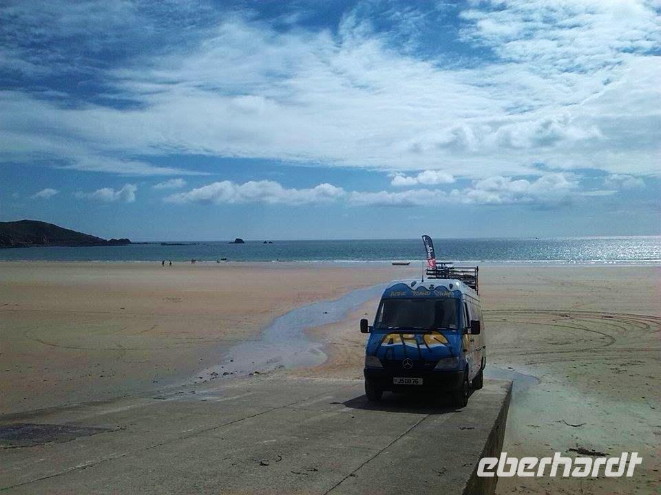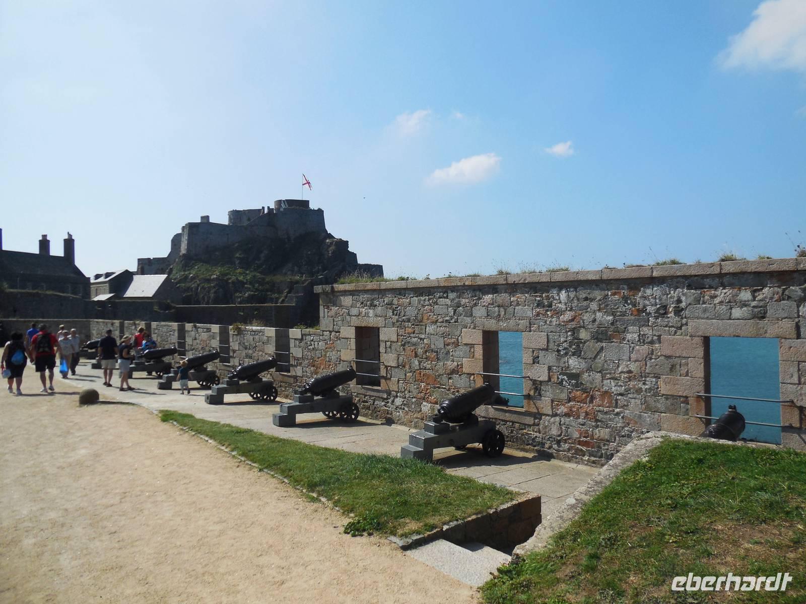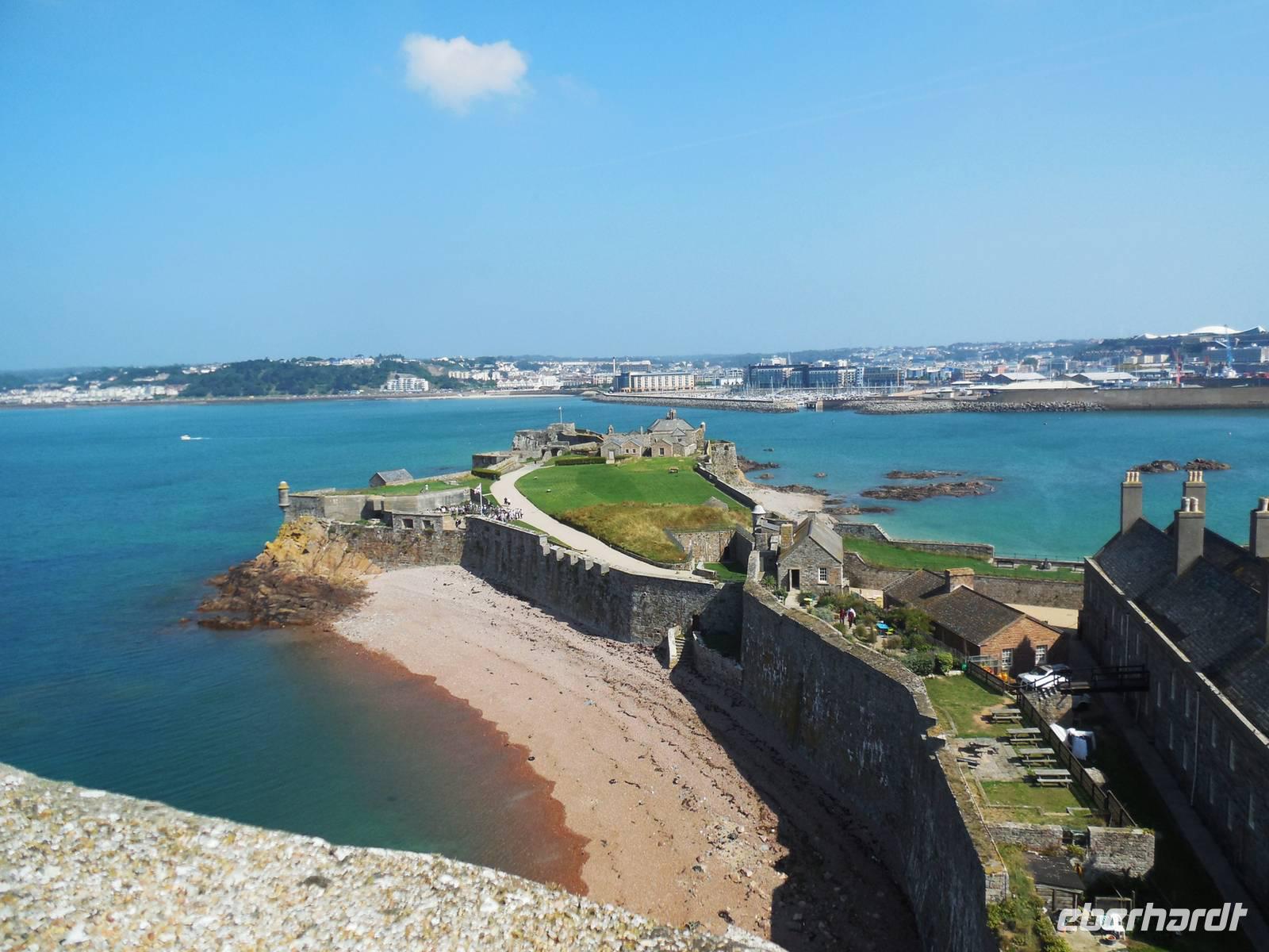 Der heutige Tag steht uns zur freien Verfügung. Am Vormittag entscheiden wir uns für einen gemeinsamen Besuch des Blumen und Fischmarktes. Hier kaufen die Einheimischen von St. Helier ein. Von modernen Einkaufsboutiquen geht es hier ein eine große viktorianische Halle mit vielen Einkaufsständen voller Blumen, Obst, Gemüse und alles Arten von Lebensmitteln. In der Mitte der Halle plätschert ein blumengeschmückter, verzierter Brunnen unter der Glaskuppel. Wir decken uns mit Jerseylilienknollen und den bekannten Jerseykartoffeln „Jersey Royal" ein und begeben uns weiter durch die Einkaufsmeile der Kings Street hinunter zum Hafen. Bei Ebbe kann man hier zu Fuß zum Elizabeth Castle spazieren. Wir fahren flutbedingt mit einem Amphibienfahrzeug, der „castle ferry" hinüber zur Burg. Das ulkige Fahrzeug (halb Bus, halb Boot) bringt uns mit dem noch witzigeren Sicherheitsvideo von Soldaten zum Lachen. Wir genießen die Überfahrt und begeben uns zur richtigen Zeit an den richtigen Ort, denn um kurz vor eins kommen wir in den Genuss des Kanonenschusses. Bei einer lustigen Zeremonie mit freiwilligen Soldaten, in diesem Falle Besucher die das Marschieren erlernen müssen, wird eine Kanone gereinigt, geladen und abgefeuert. Der Knall ist lauter als gedacht und auch oben auf der Burg laut zu vernehmen. Nachdem wir uns die hübsche, verwinkelte uns sehr gut erhaltene Burg zur Genüge angeschaut haben begeben wir uns per castle ferry zurück ans Ufer von St. Helier und genießen den Rest des Tages mit Baden oder weiteren Erkundungen der vielfältigen Gegend.