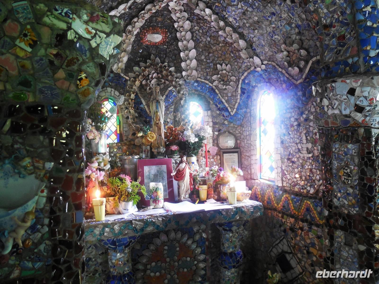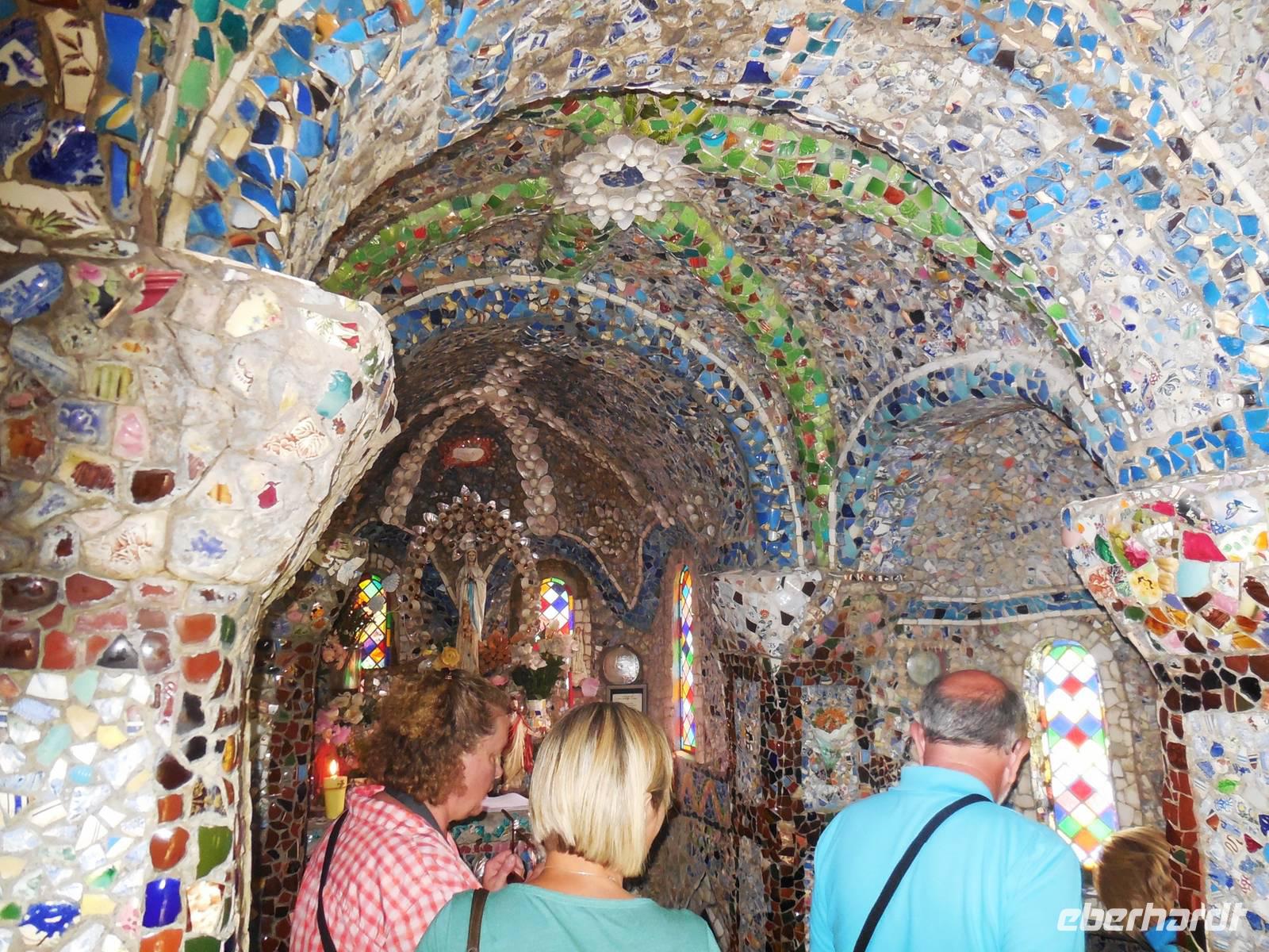 Am frühen Morgen begeben wir uns zum Flughafen auf Jersey, denn wir fliegen in einer kleinen Maschine der Aurigny Airline nach Guernsey. Windbedingt haben wir das Glück einmal ganz um Guersey herum fliegen zu dürfen. Wir bestaunen die gesamte Pracht dieser Insel von oben bei einem Panoramaflug. Die zweitgrößte der Kanalinseln, bezaubert mit einer Landschaft von wilder Schönheit und weißgoldenen Sandstränden, wie aus dem Bilderbuch! Etwa 60 Kilometer breit, strahlt diese Insel eher englisches Flair aus. Auffällig sind die vielen Gewächshäuser die uns bei Sonnenschein von unten anfunkeln. Am Flughafen begrüßt uns Fahrer Clint und wir begeben uns auf unsere Reise. Heidi erzählt uns viel von den Eigenarten der Einwohner, die von den Jerseyanern frech als „Donkeys", spießig-sture Esel, bezeichnet werden. Da kommt mal wieder die Inselkonkurrenz zum Vorschein. Ebenfalls werden wir über die unzähligen brachliegenden Gewächshäuser aufgeklärt: In diesen wurden früher Tomaten gezüchtet, die jedoch niemand mehr kaufen wollte, da die spanischen Tomaten viel günstiger zu haben waren. Nachdem Ideen wie Tomatenweinherstellung oder Kiwianbau fehlschlugen, werden nun in einigen Gewächshäusern Rosen und Freesien gezüchtet. Vorbei an einer Ziegenfarm, mit den typisch goldenen Guernsey Ziegen, und lieblichen Cottages, geht es nach St. Andrew. Hier legen wir einen Stopp an der kleinsten Kirche der Welt ein: „Little Chapel" genannt. Unzählige Muscheln und Porzellanscherben prägen das Gesamtbild. Wir können durch das Kunstwerk, welches eine Miniaturausgabe der Kirche von Lordes darstellt, hindurchgehen.